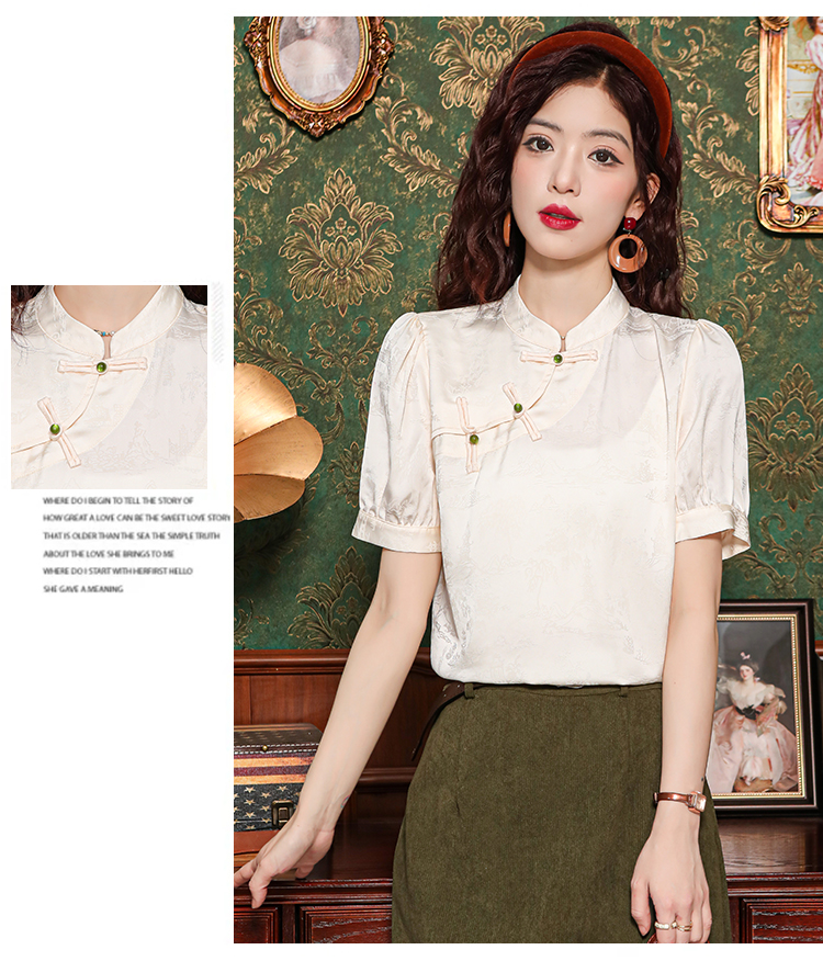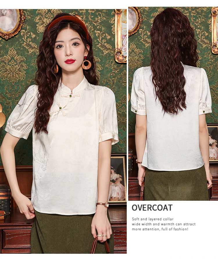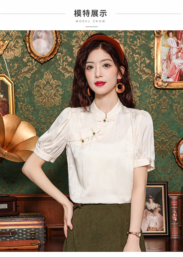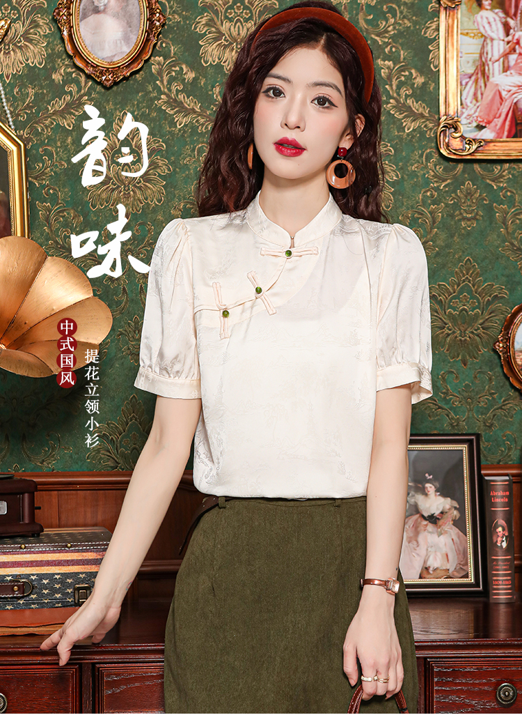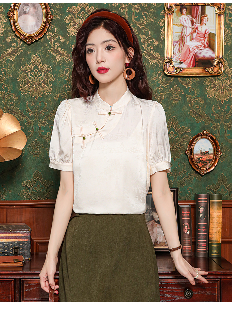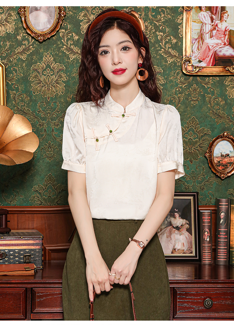 레트로 새로운 중식 자카드 단추 스탠드 칼라 새틴 여성 셔츠 2026 여름 새로운 국풍 작은 대중 반팔 맨위