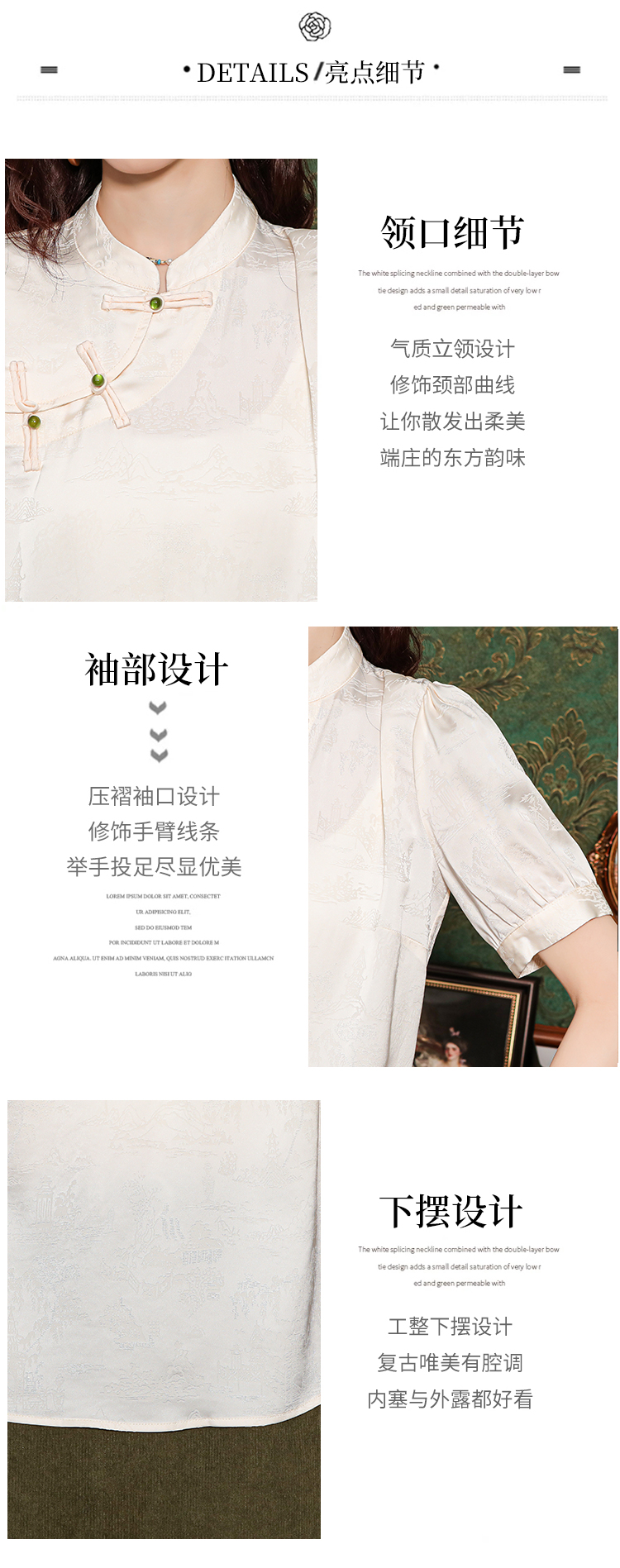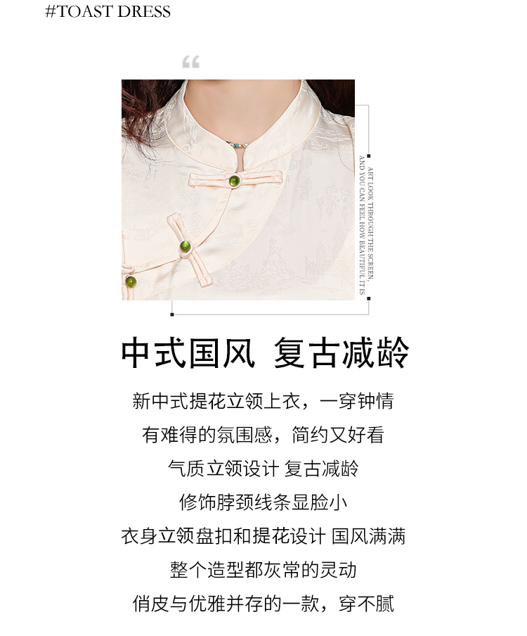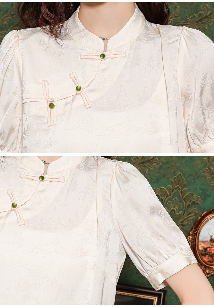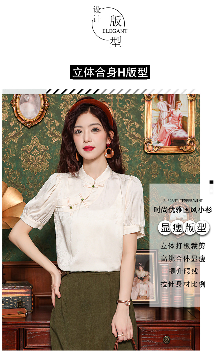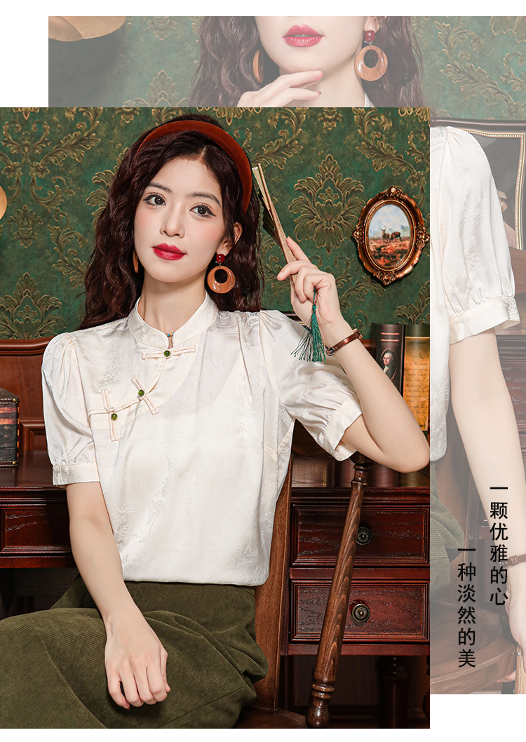 레트로 새로운 중식 자카드 단추 스탠드 칼라 새틴 여성 셔츠 2026 여름 새로운 국풍 작은 대중 반팔 맨위