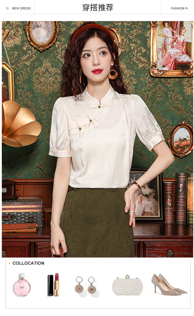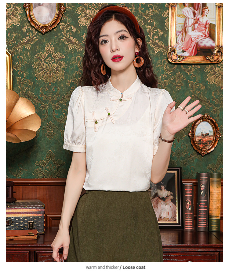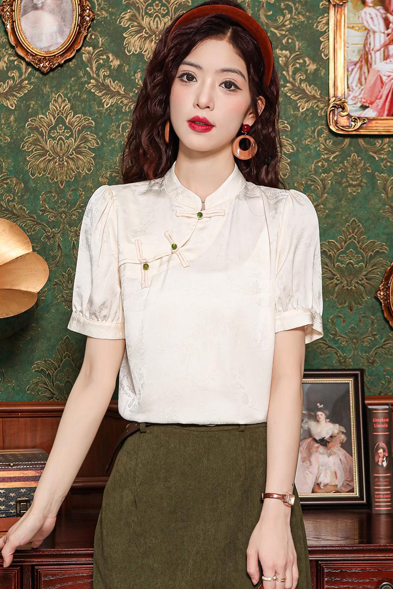 새로운 중식 스탠드 칼라 반팔 여성 셔츠 여름 국풍 레트로 자카드 말 얼굴 치마 맨위 출퇴근 면접 품격 셔츠