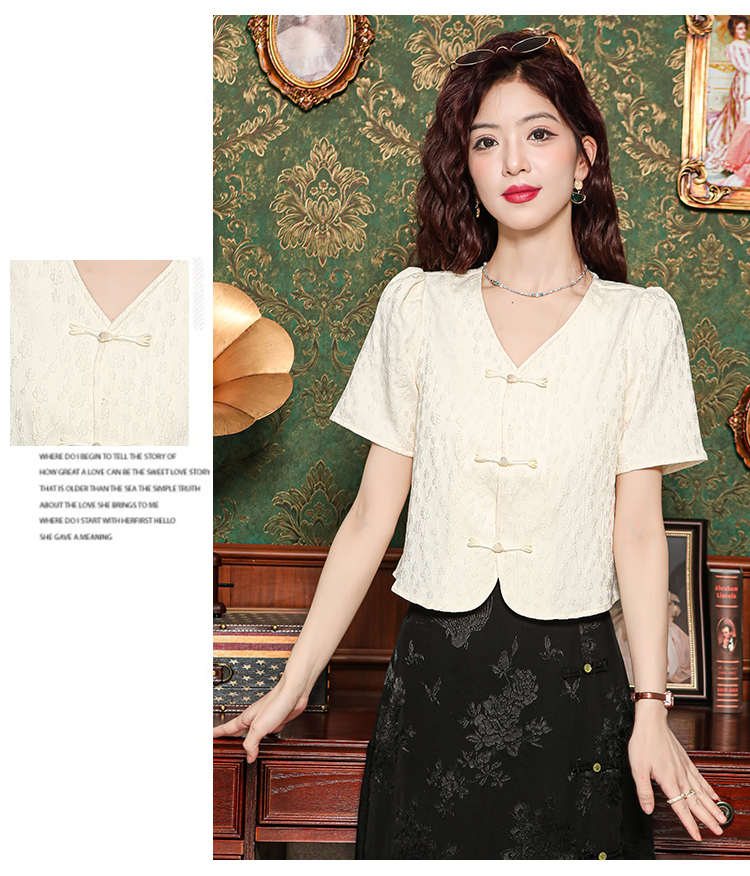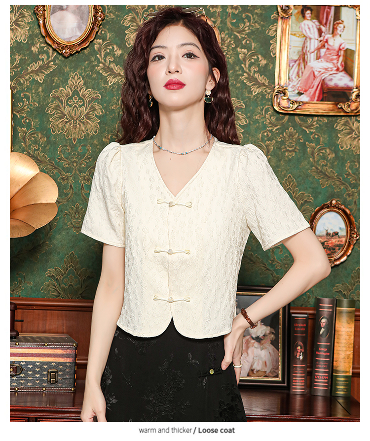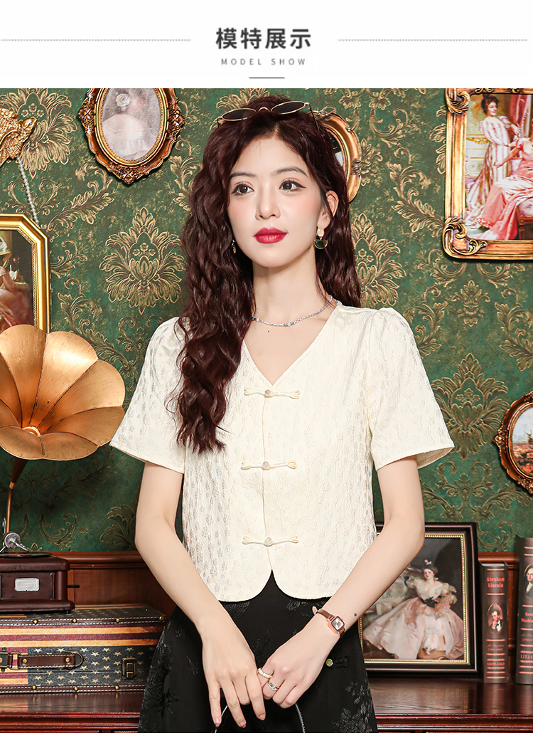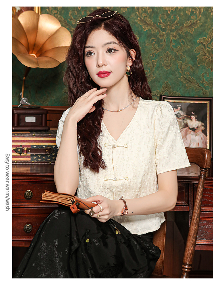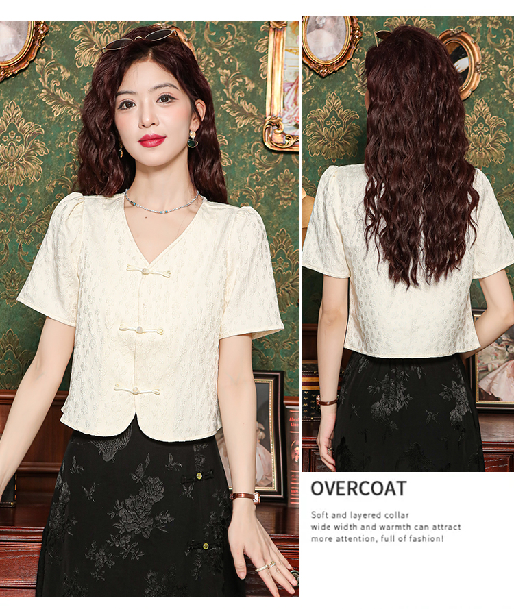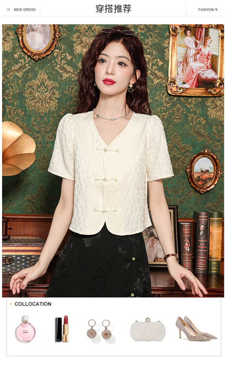 새로운 중식 스탠드 칼라 반팔 여성 셔츠 여름 국풍 레트로 자카드 말 얼굴 치마 맨위 출퇴근 면접 품격 셔츠