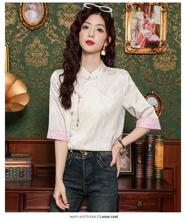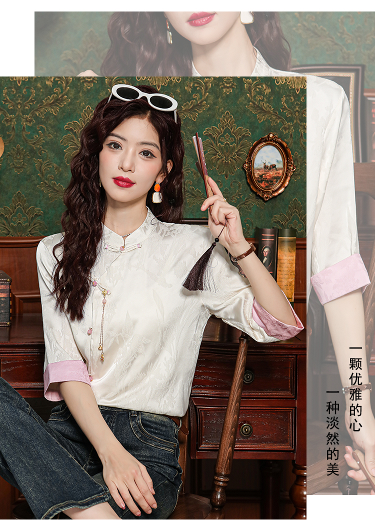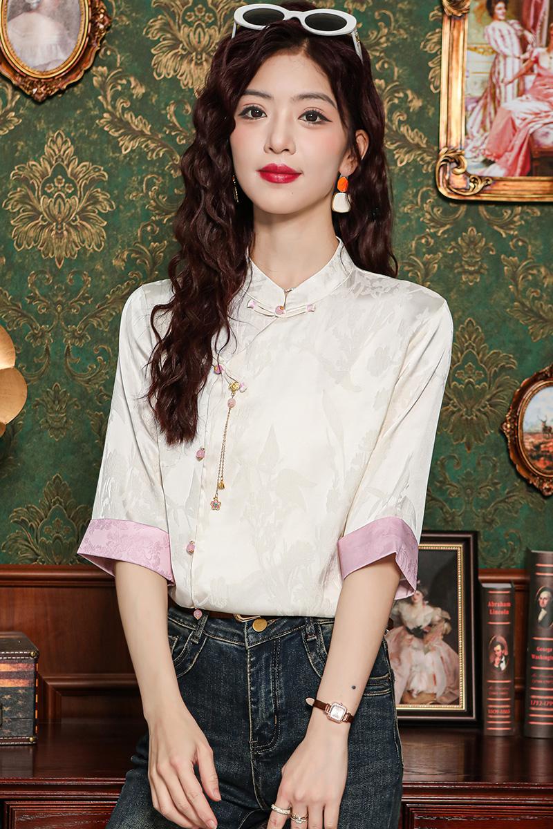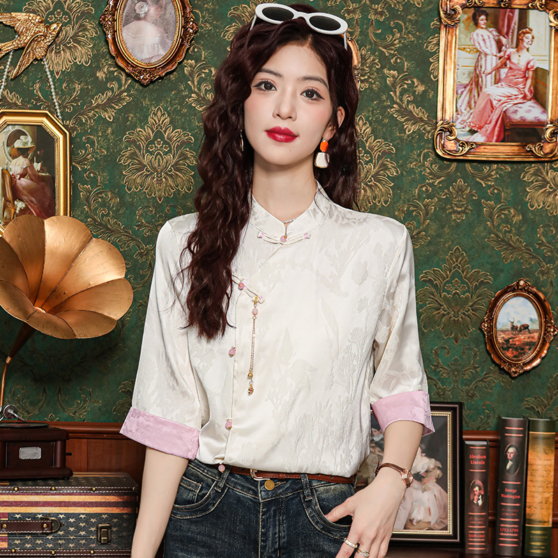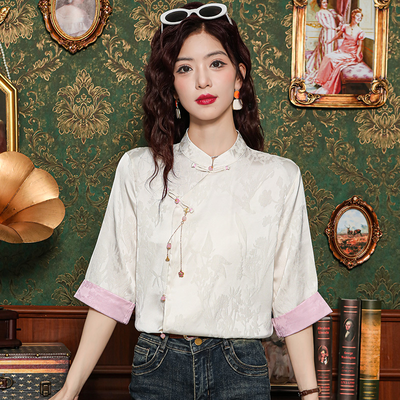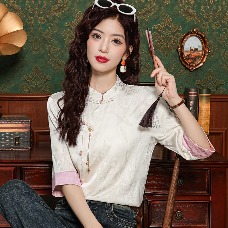 새로운 중식 실크 셔츠 여성 의류 7부 소매 봄 가을 여름 새로운 단추 작은 셔츠 국풍 자카드 당나라 맨위