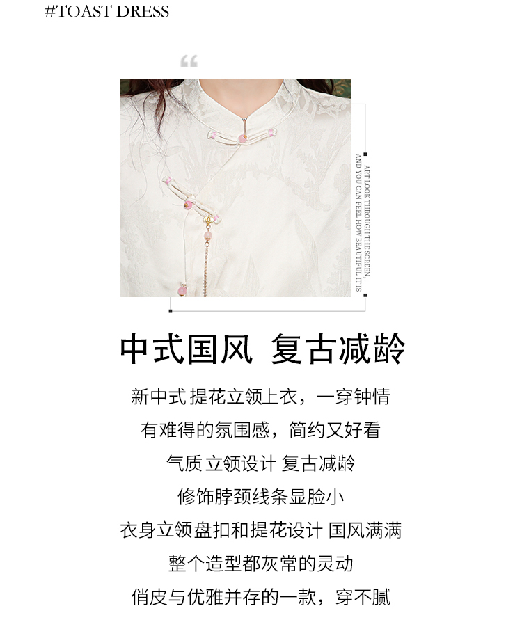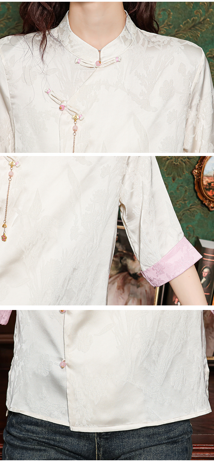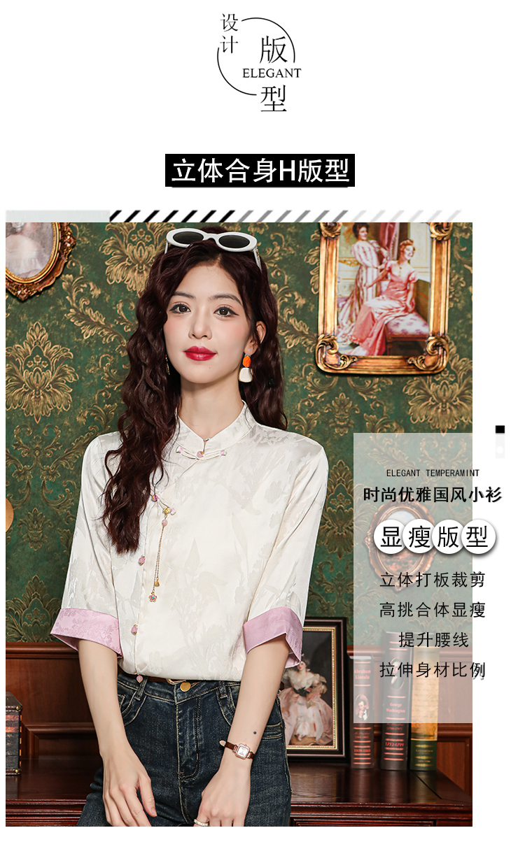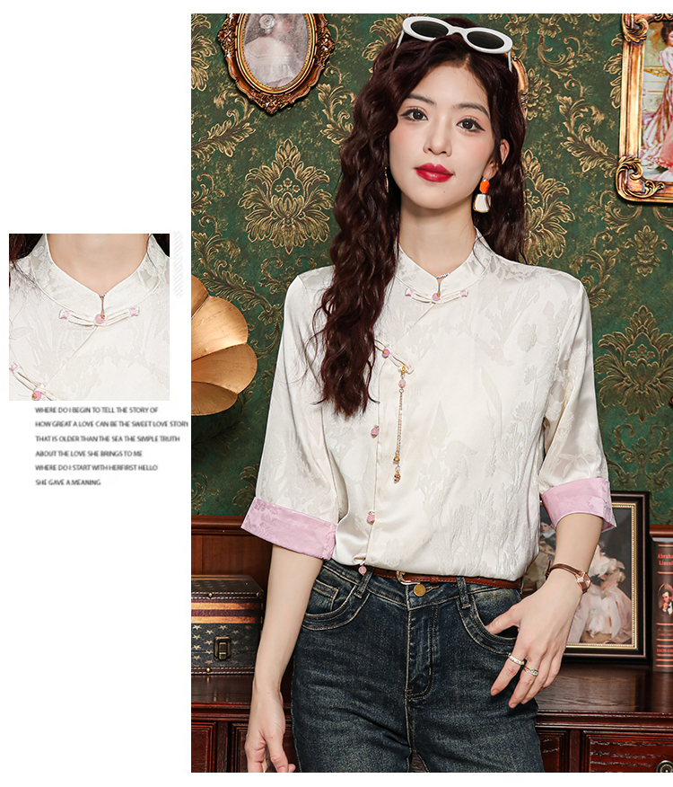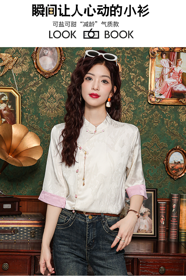 새로운 중식 실크 셔츠 여성 의류 7부 소매 봄 가을 여름 새로운 단추 작은 셔츠 국풍 자카드 당나라 맨위