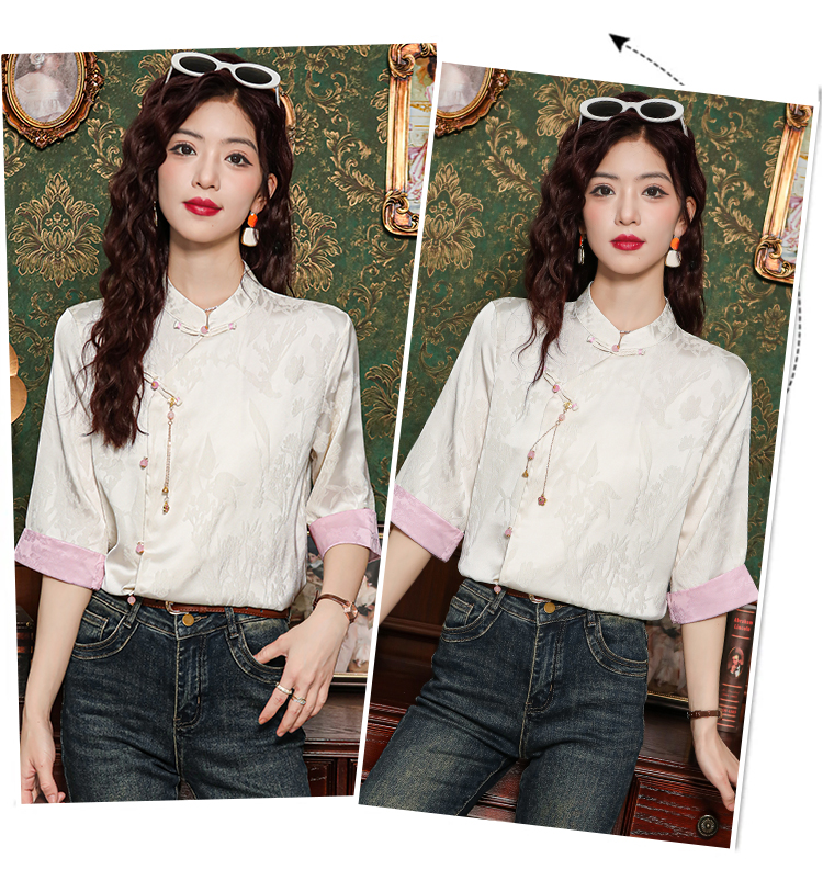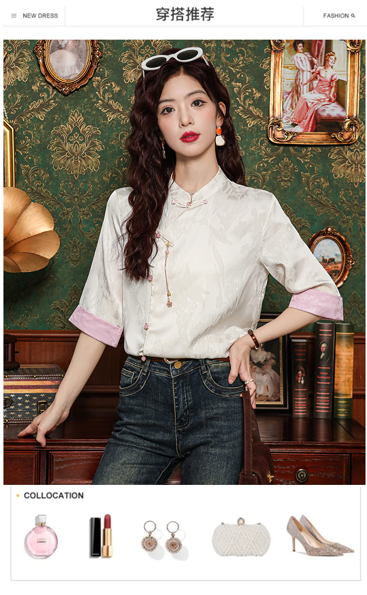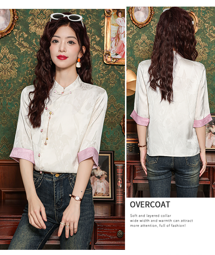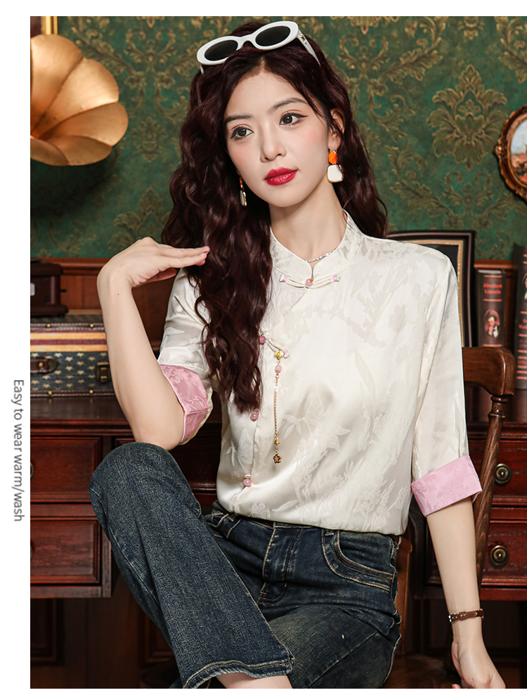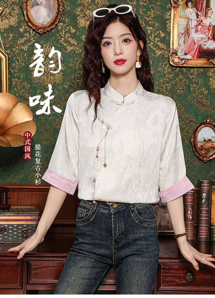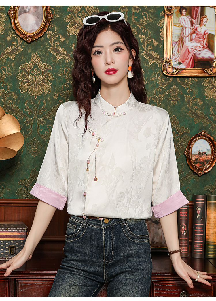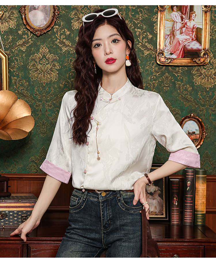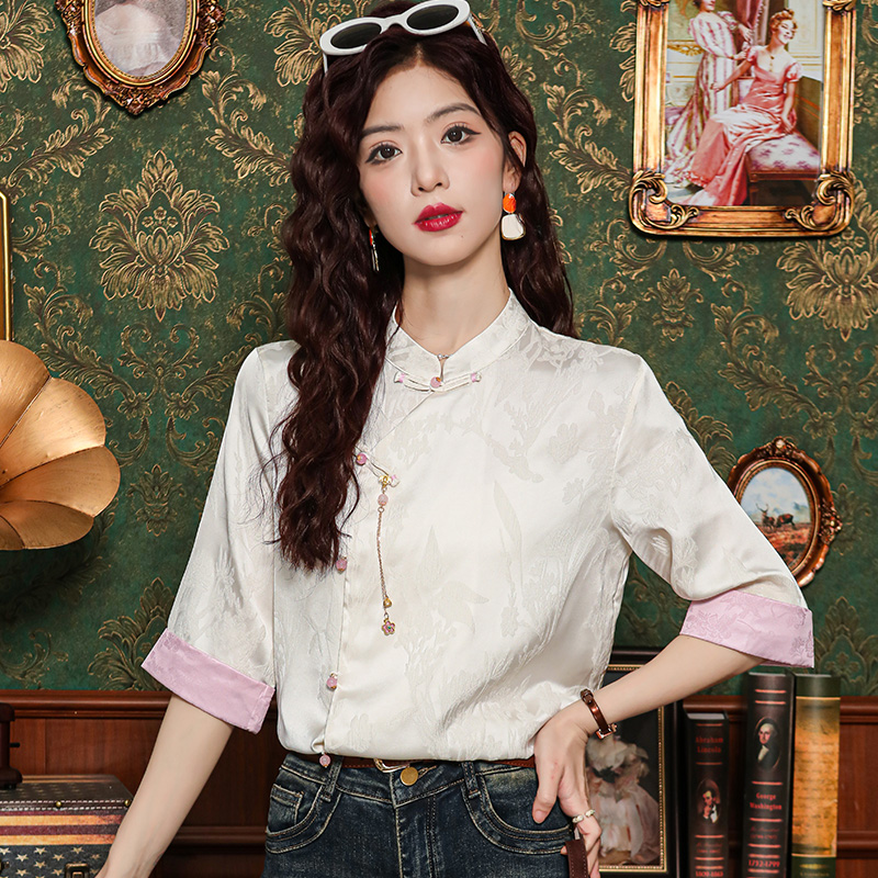 레트로 새로운 중식 자카드 단추 스탠드 칼라 새틴 여성 셔츠 2026 여름 새로운 국풍 작은 대중 반팔 맨위