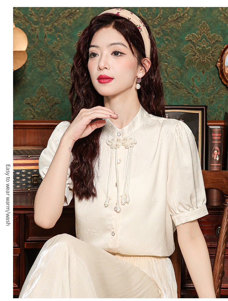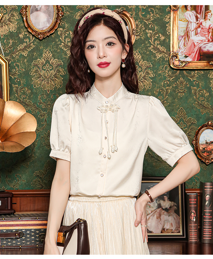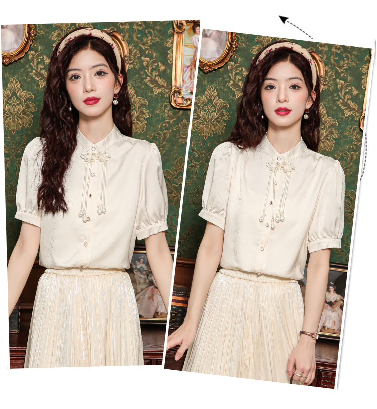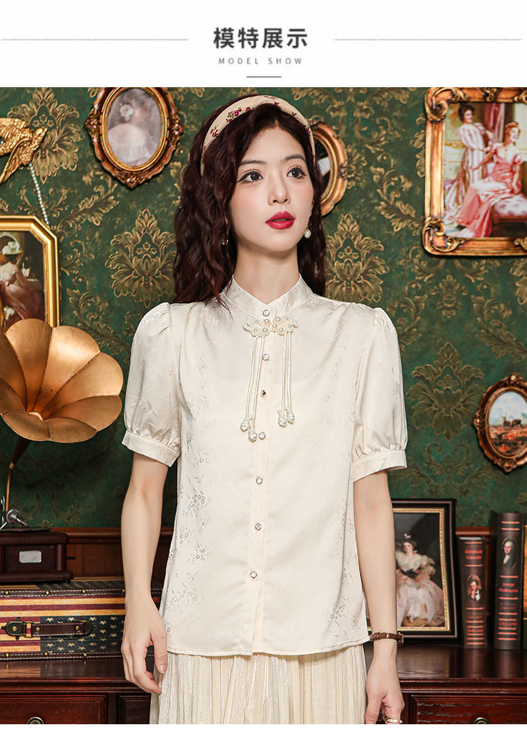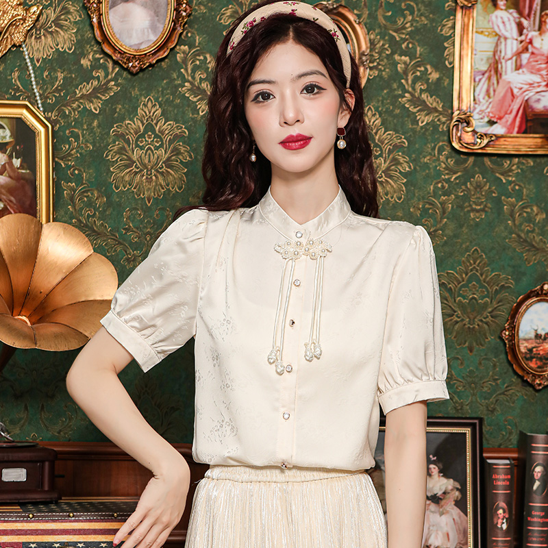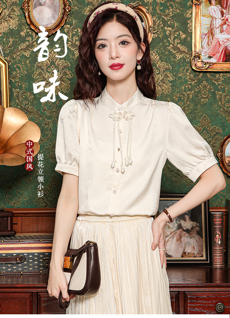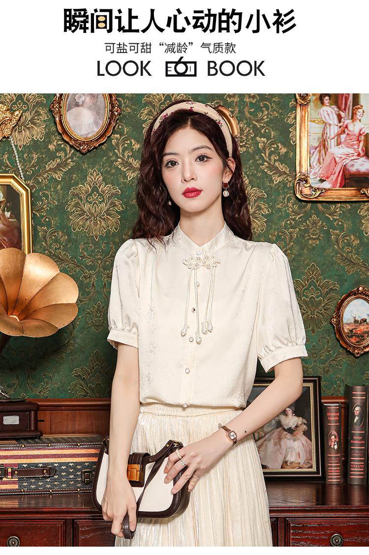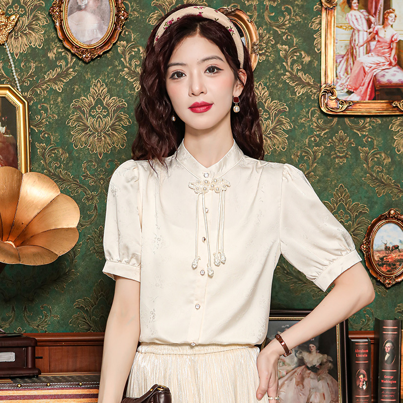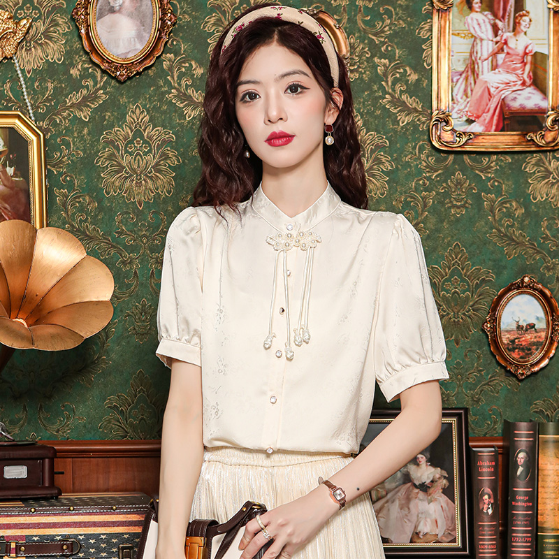 레트로 새로운 중식 자카드 단추 스탠드 칼라 새틴 여성 셔츠 2026 여름 새로운 국풍 작은 대중 반팔 맨위