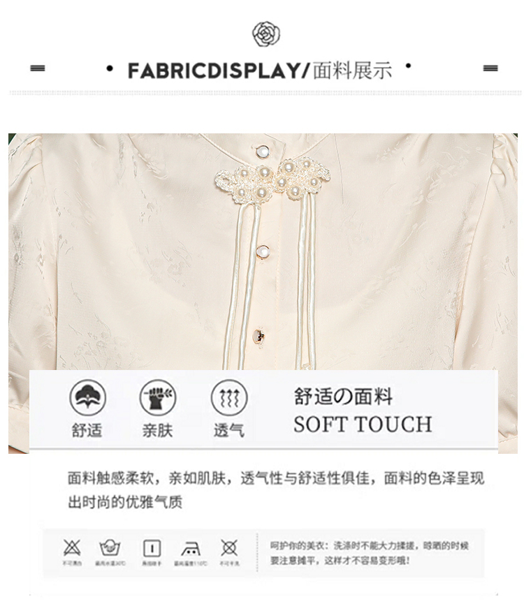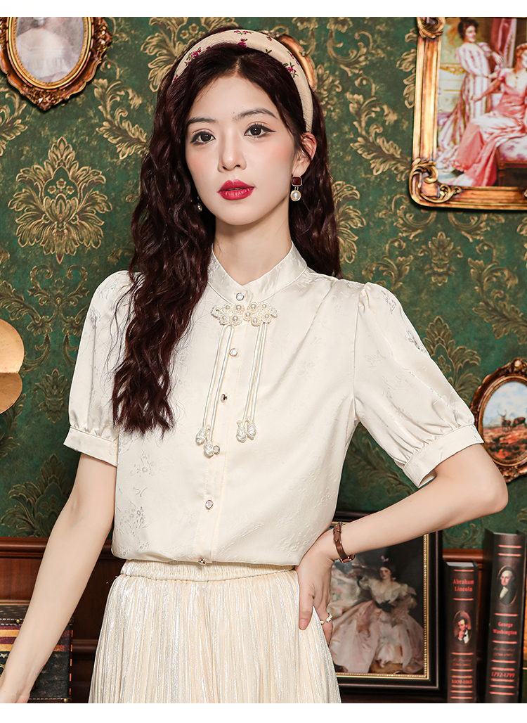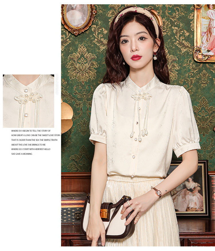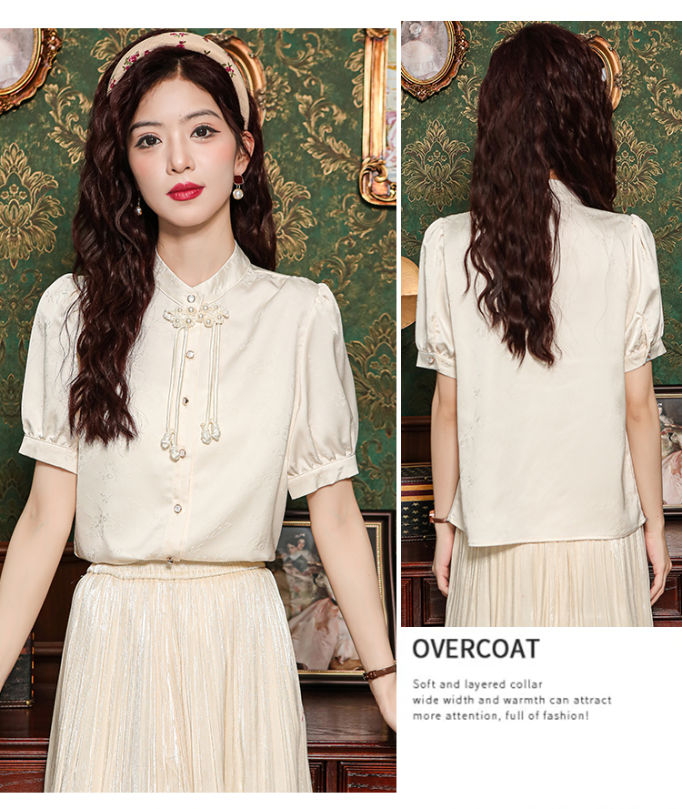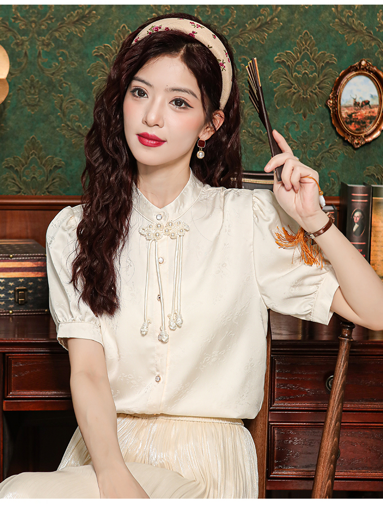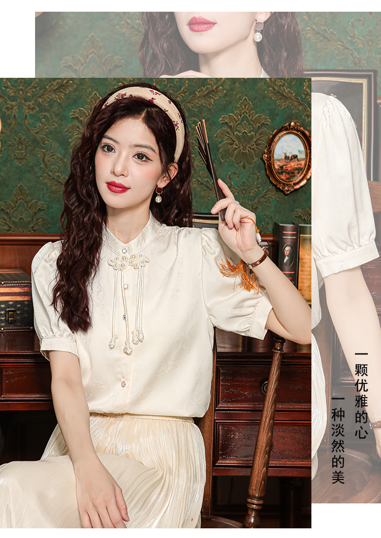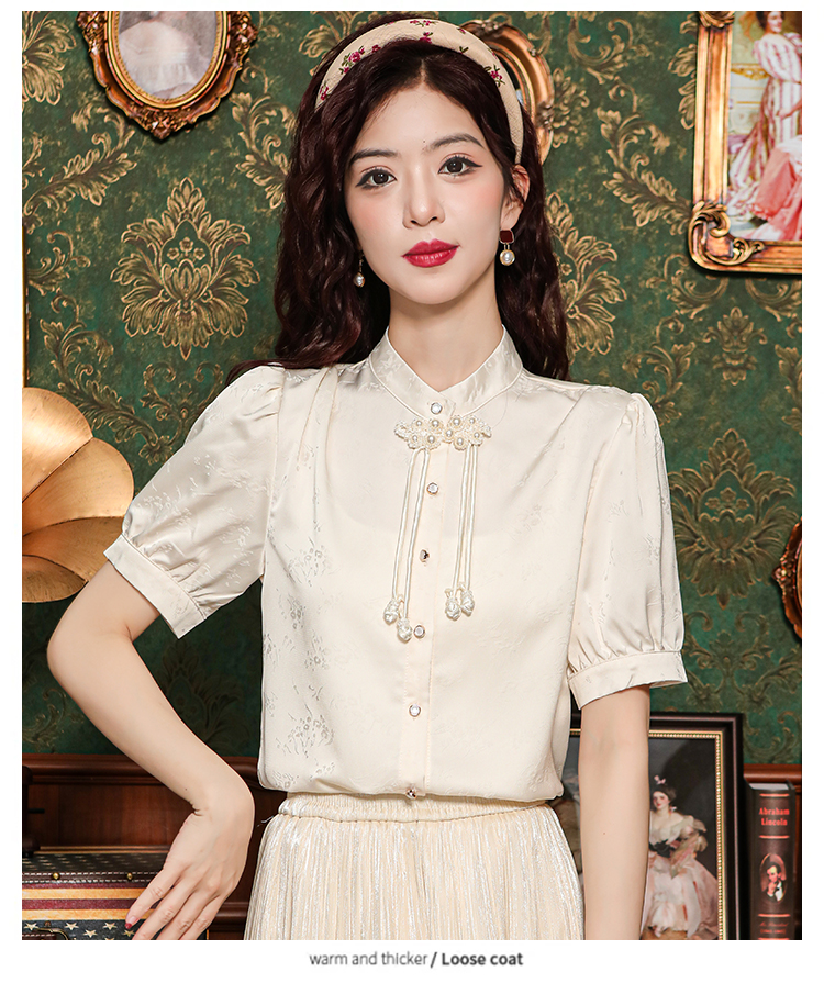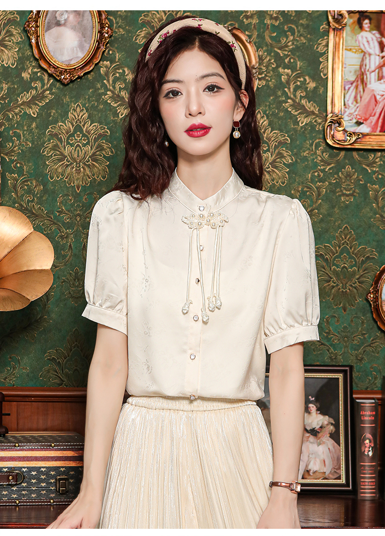 레트로 새로운 중식 자카드 단추 스탠드 칼라 새틴 여성 셔츠 2026 여름 새로운 국풍 작은 대중 반팔 맨위