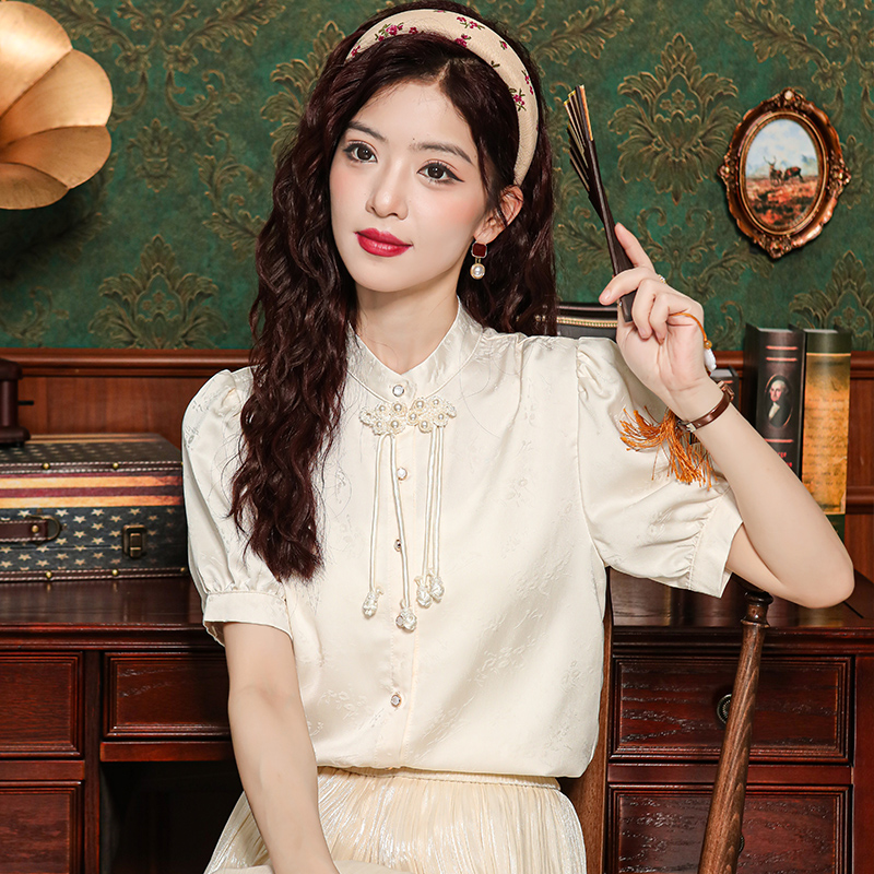 새로운 중식 스탠드 칼라 비즈 박기 술 단추 반팔 여성 셔츠 여름 레트로 국풍 자카드 쉬폰 작은 셔츠 맨위