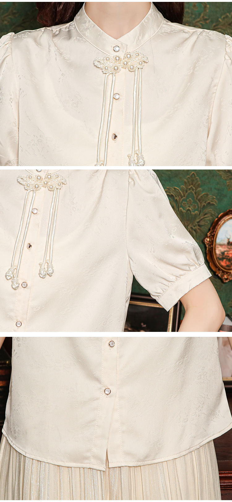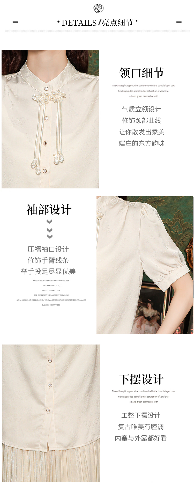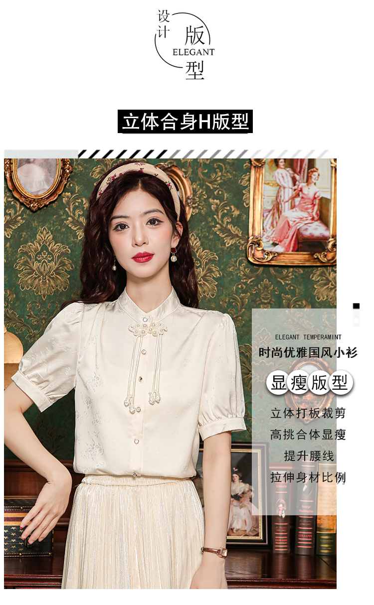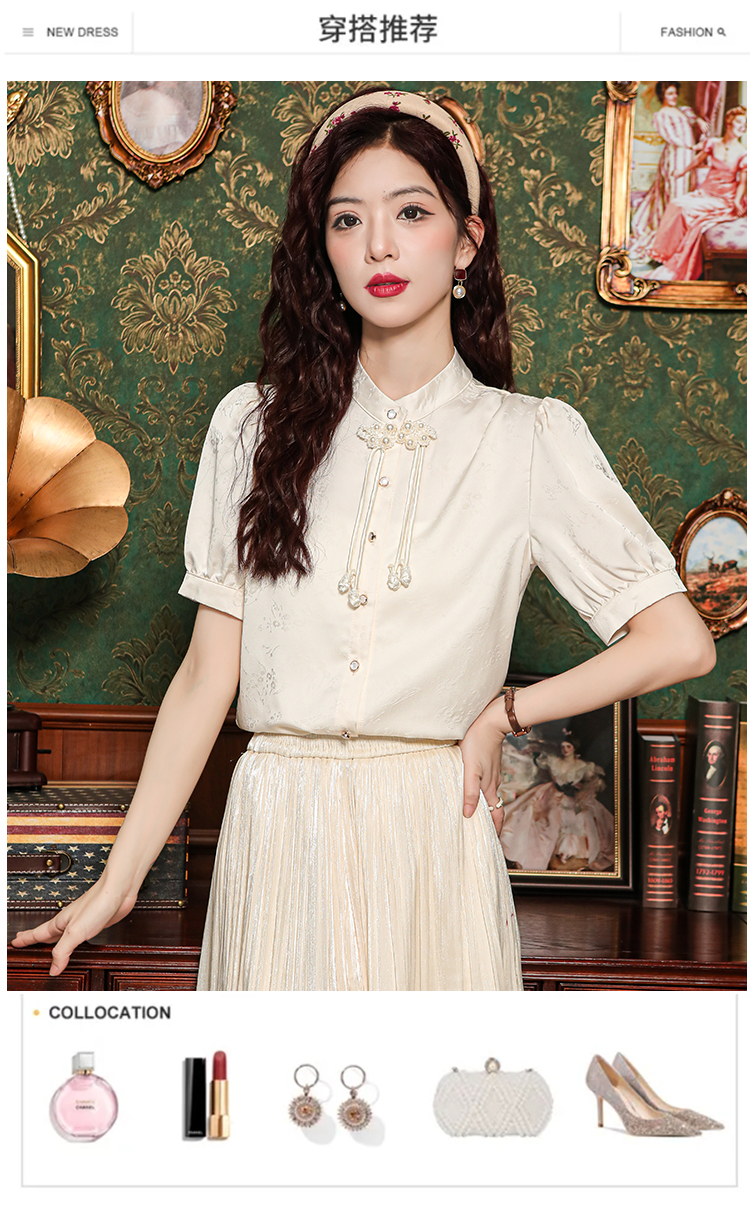 새로운 중식 스탠드 칼라 반팔 여성 셔츠 여름 국풍 레트로 자카드 말 얼굴 치마 맨위 출퇴근 면접 품격 셔츠