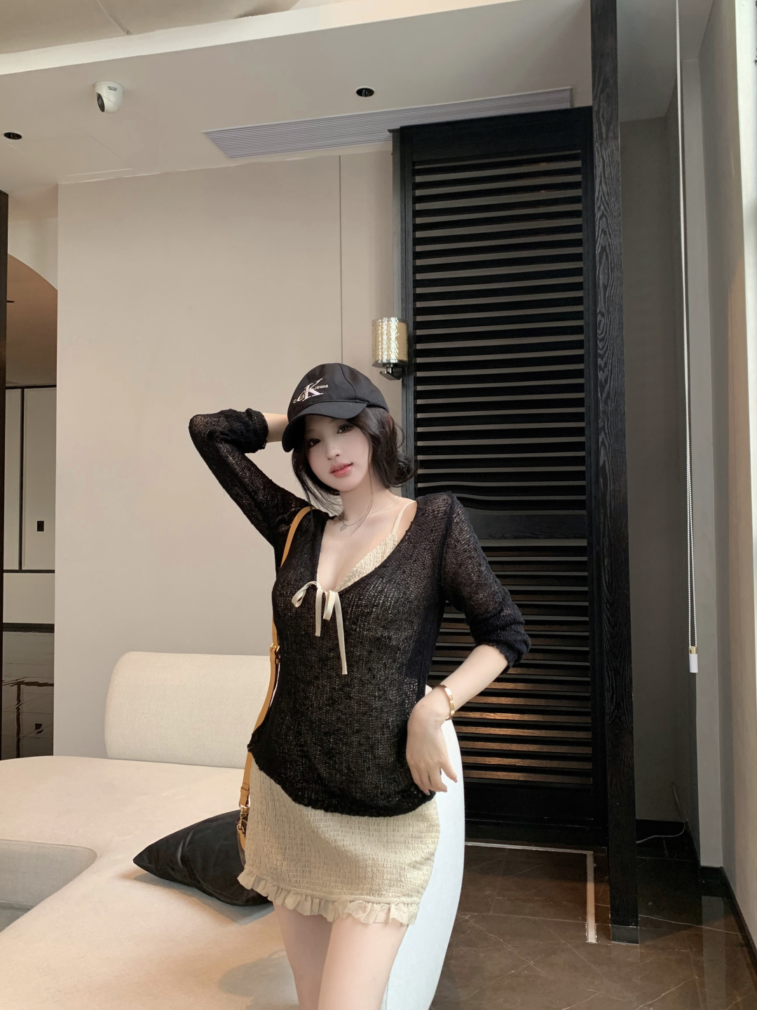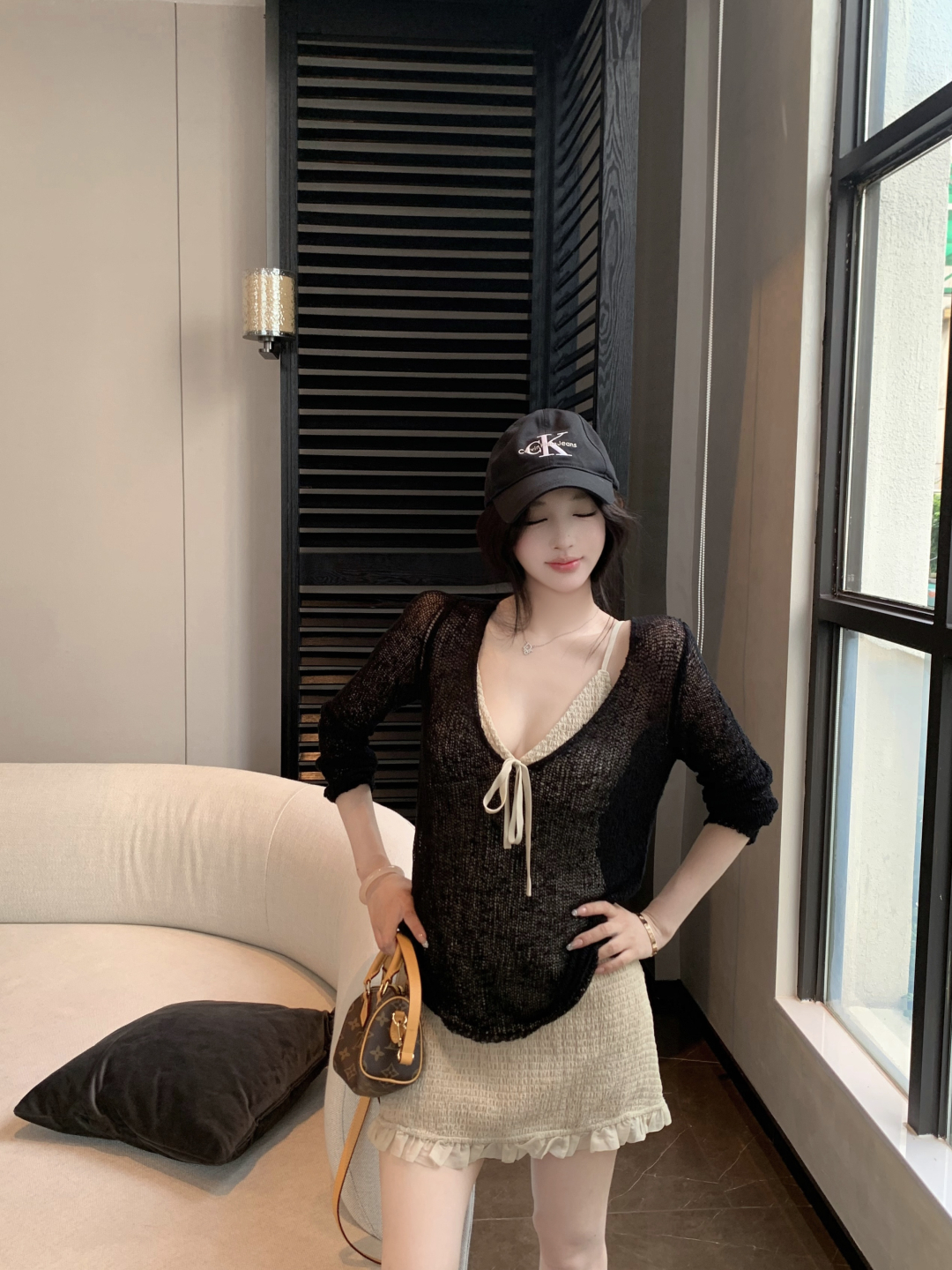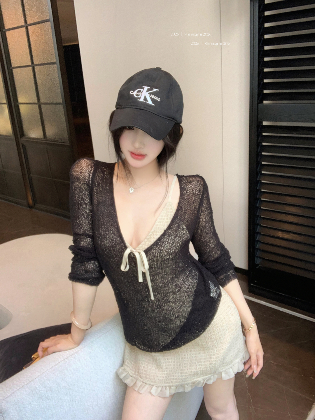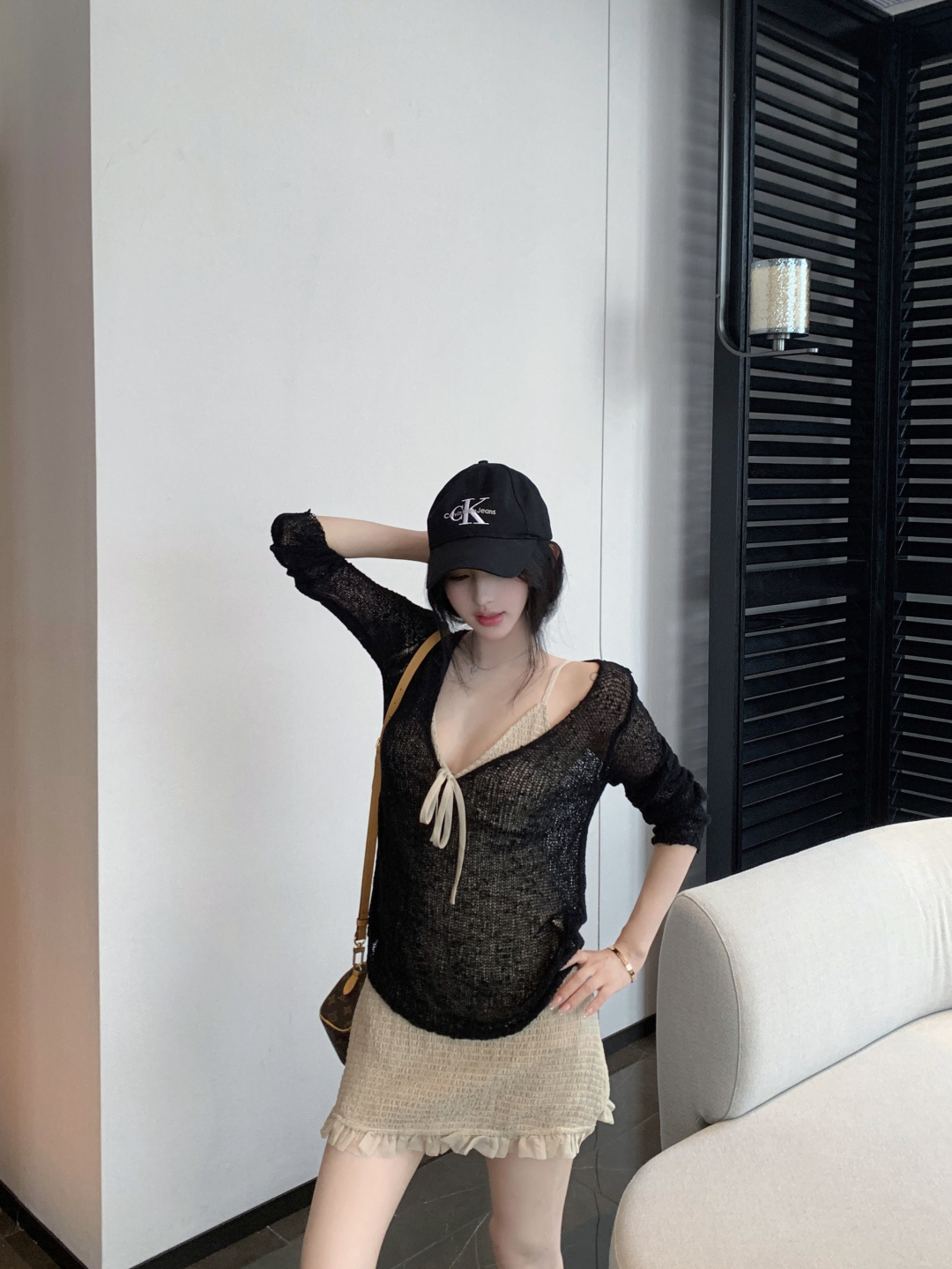 실사 정가 이슬 실크 착용 가져 가라. 시스루 홀로우 아웃 V넥 긴팔 자외선 차단 블라우스 명중 가져 가라. V넥 슬립 드레스