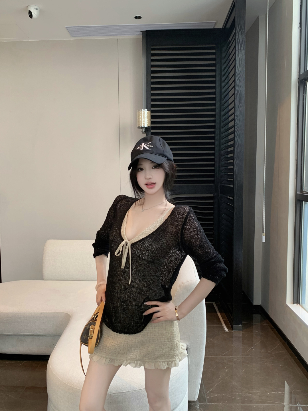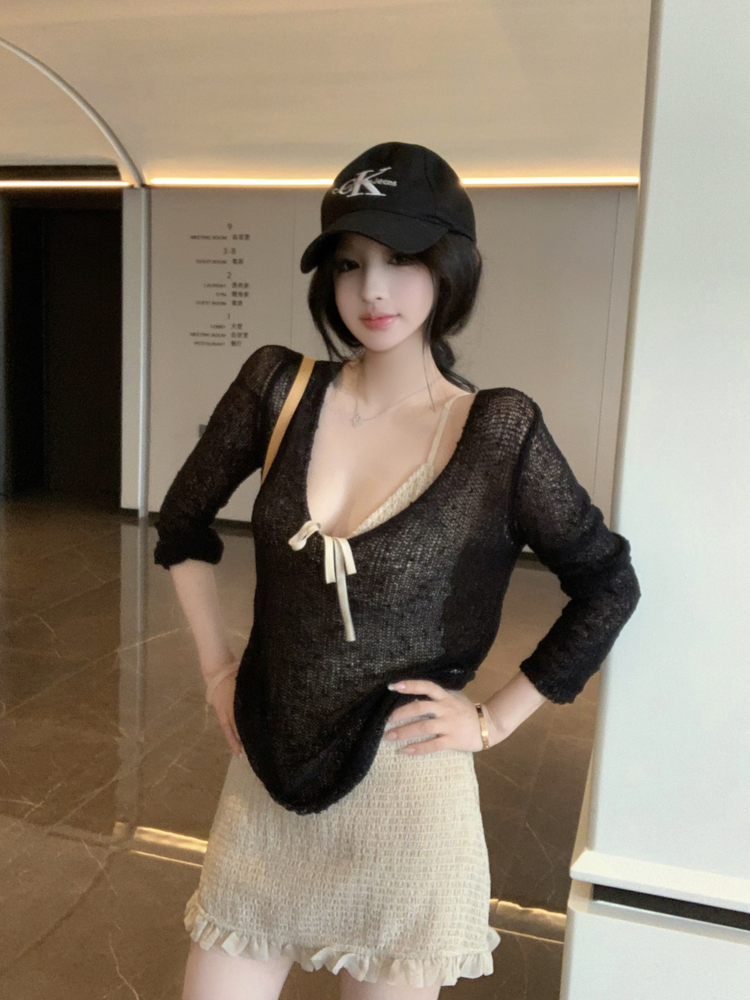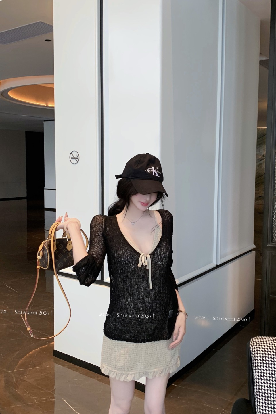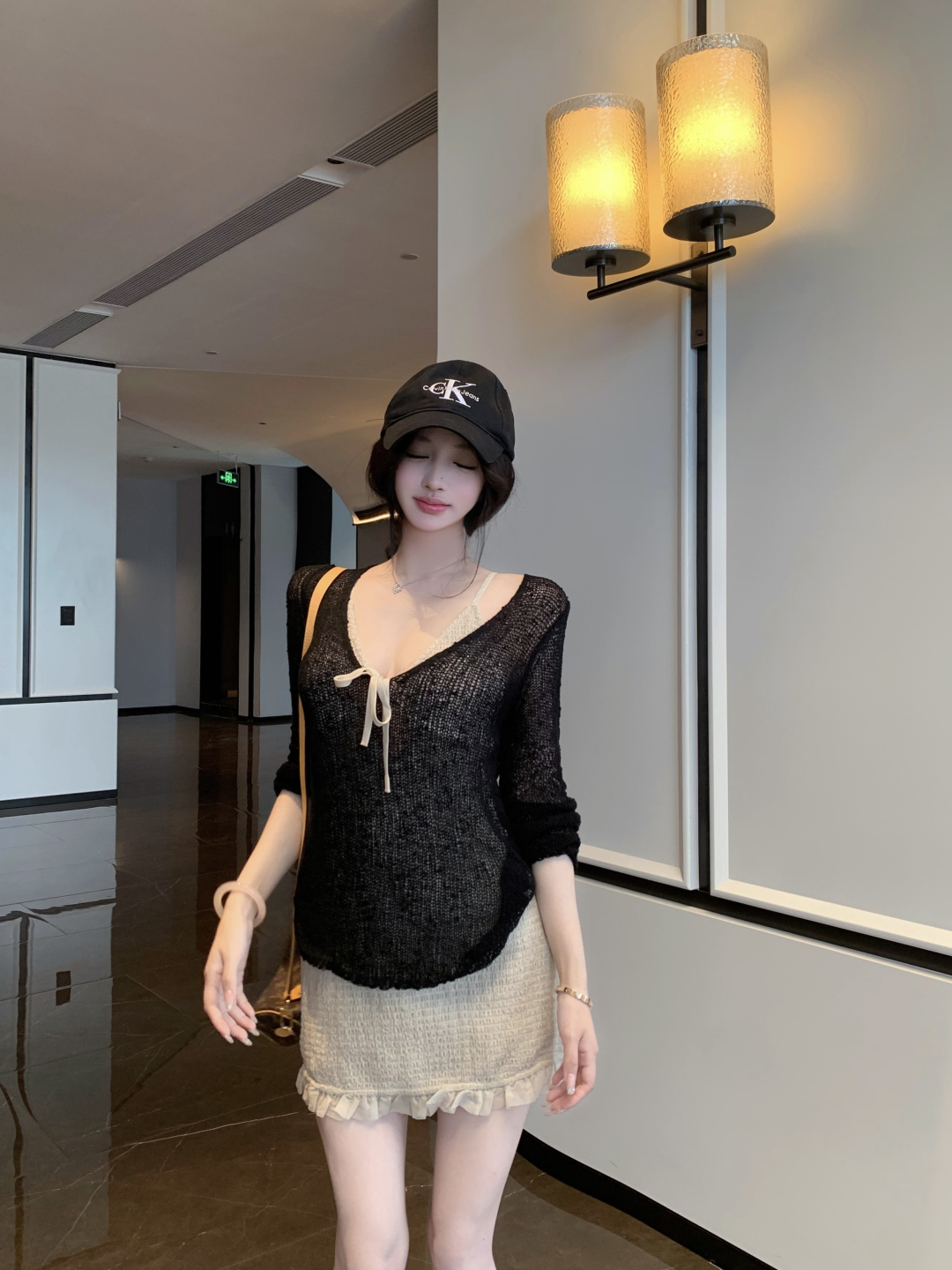 실사 정가 이슬 실크 착용 가져 가라. 시스루 홀로우 아웃 V넥 긴팔 자외선 차단 블라우스 명중 가져 가라. V넥 슬립 드레스