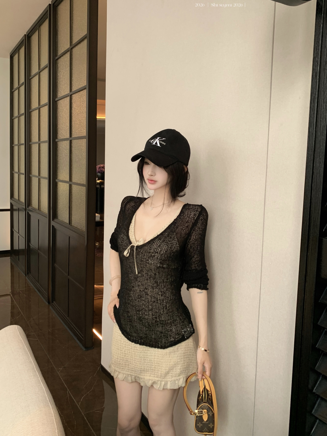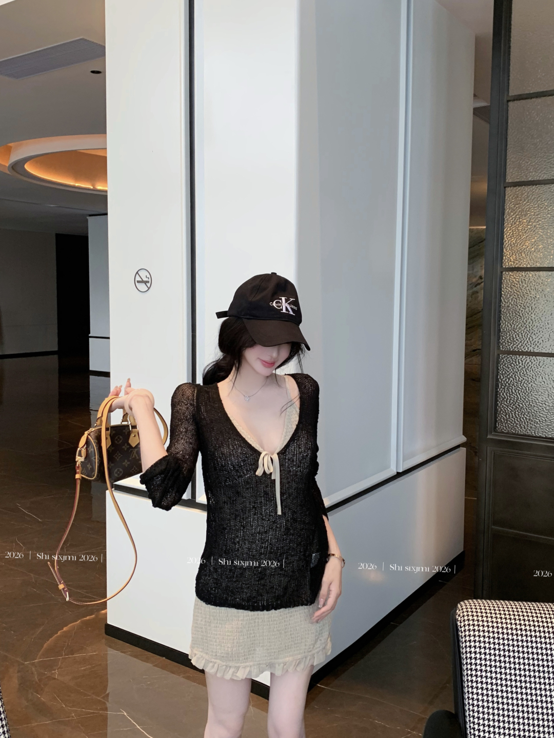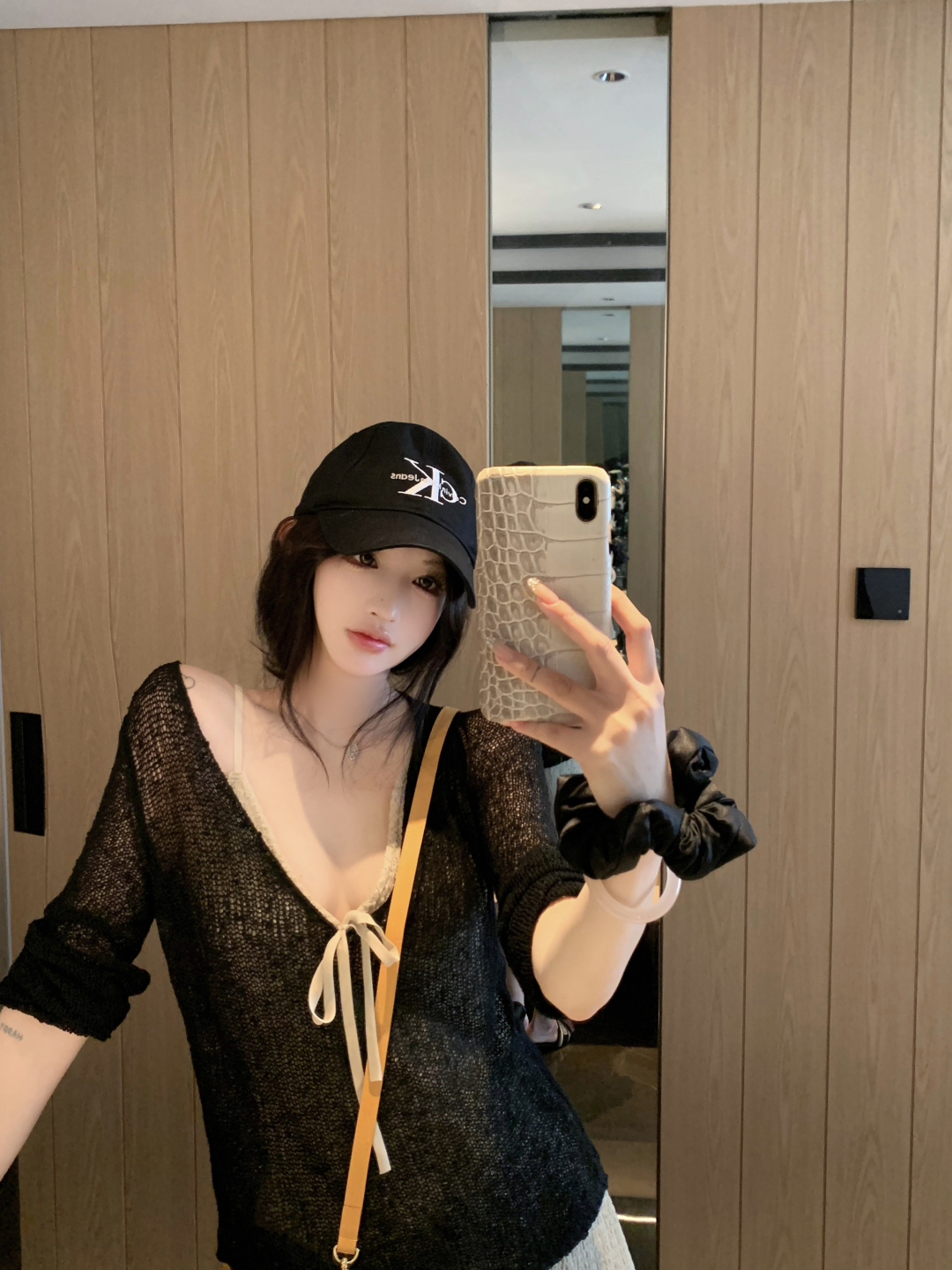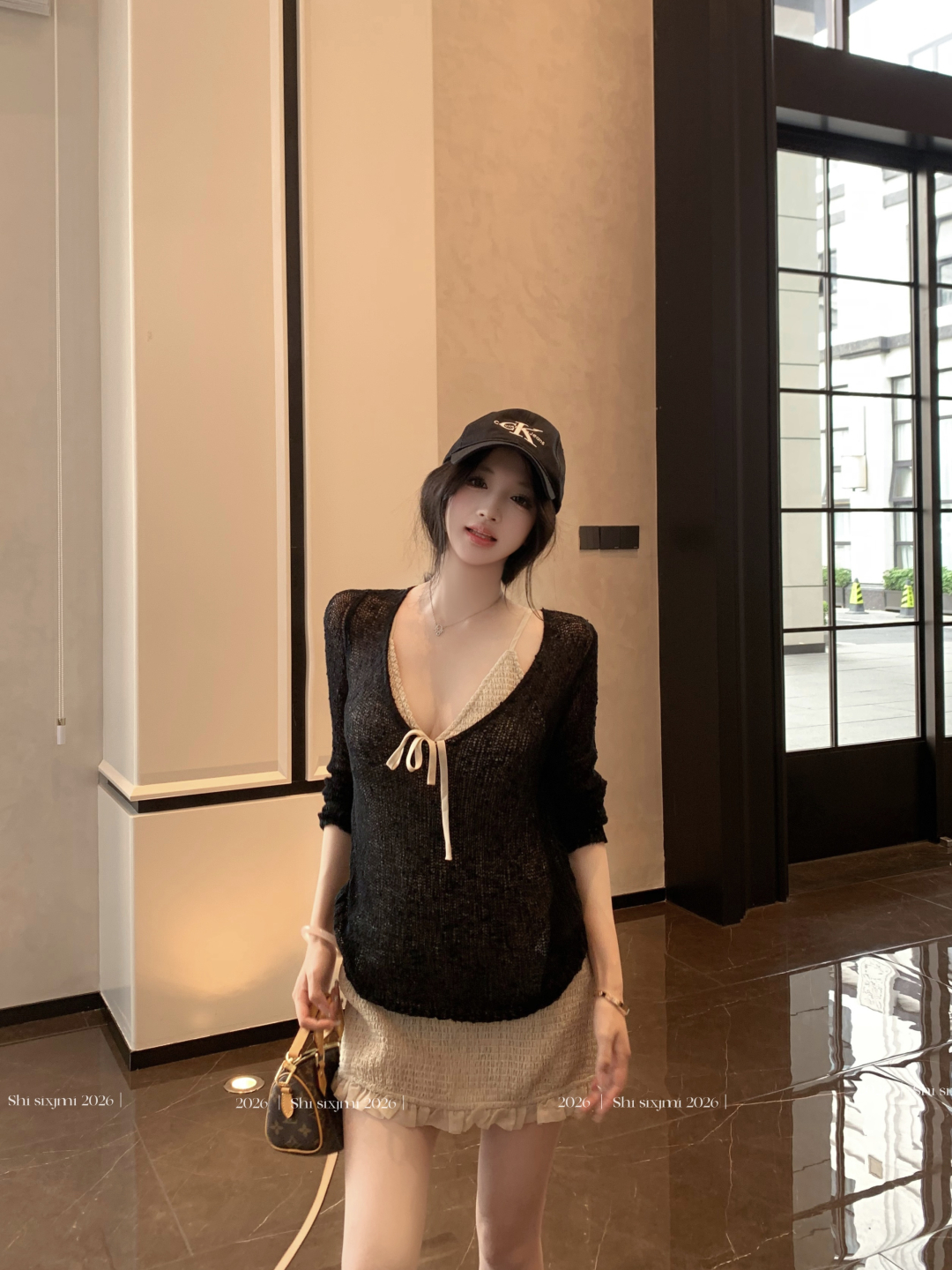 실사 정가 이슬 실크 착용 가져 가라. 시스루 홀로우 아웃 V넥 긴팔 자외선 차단 블라우스 명중 가져 가라. V넥 슬립 드레스