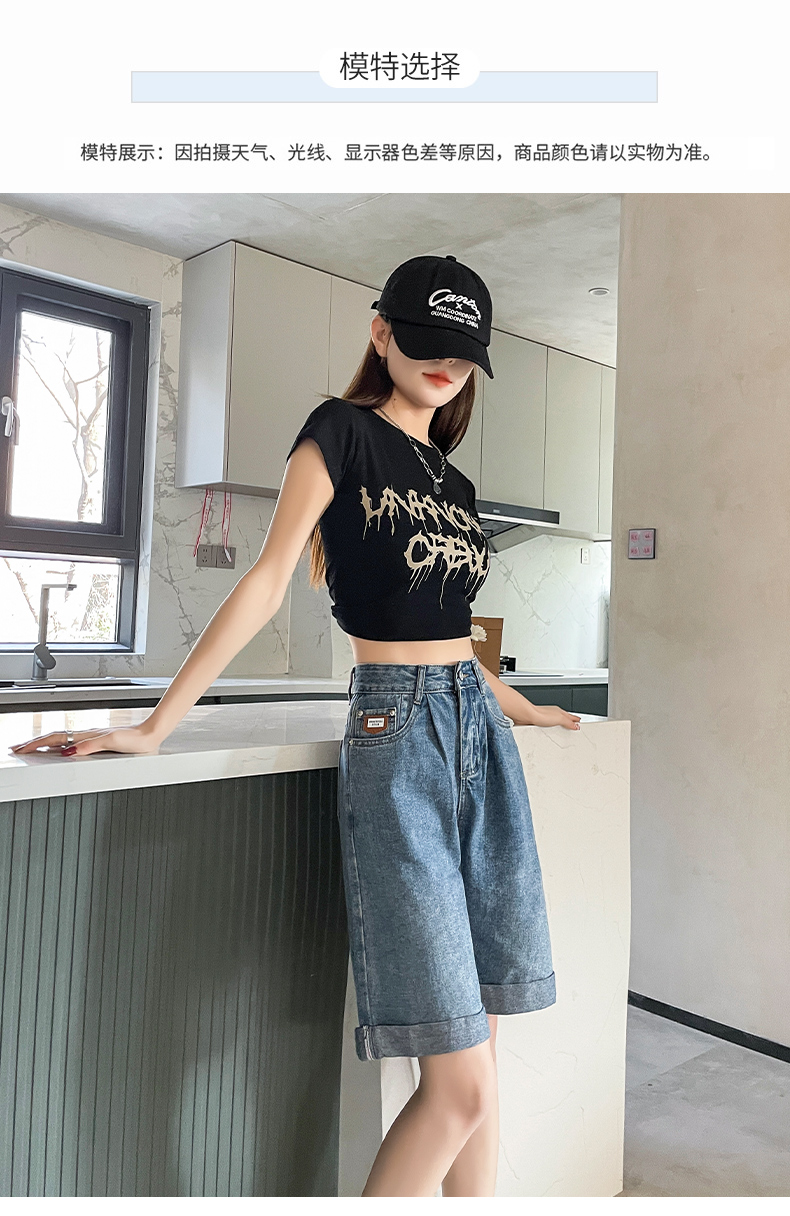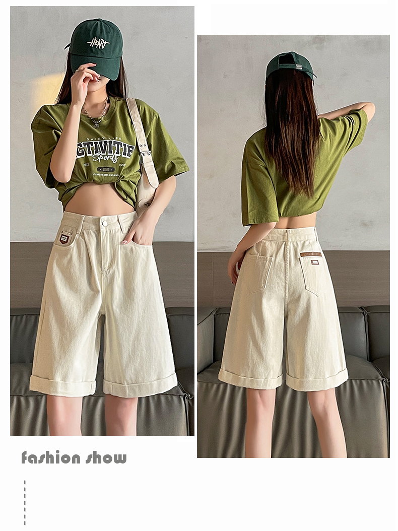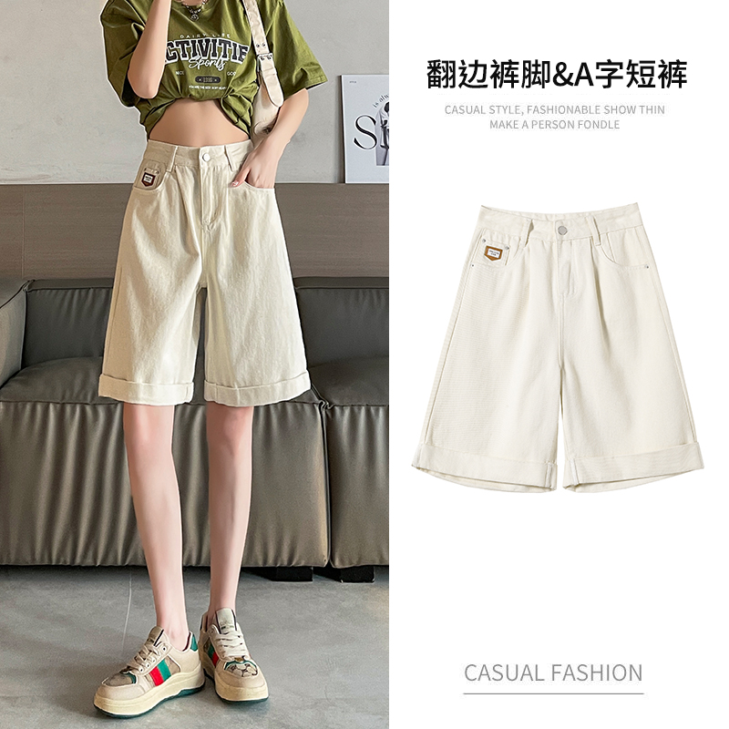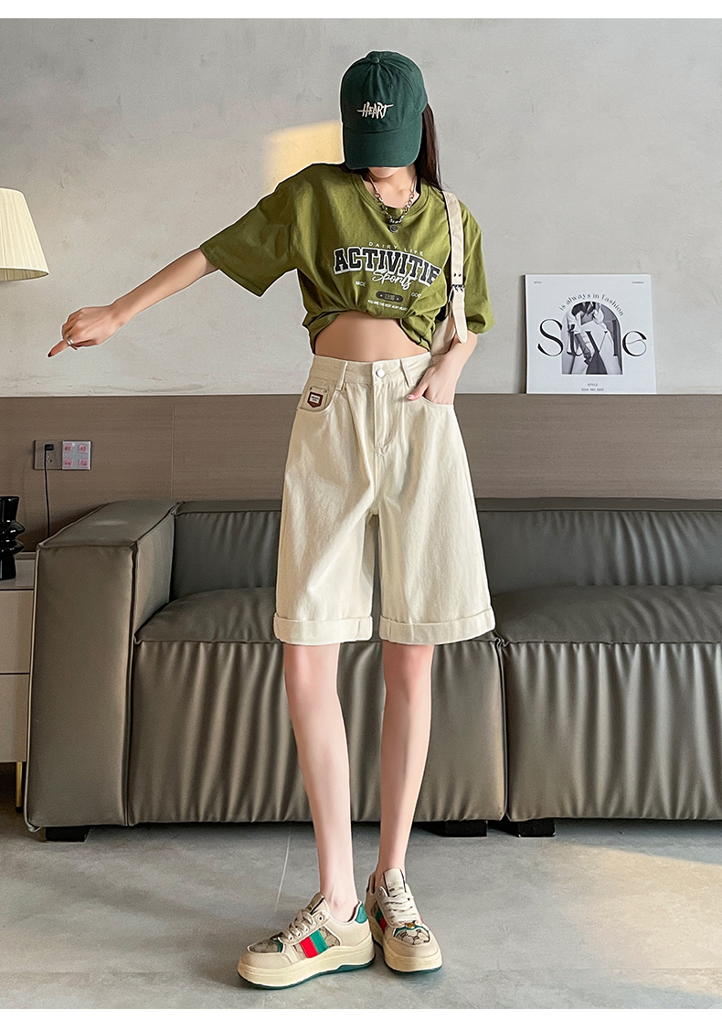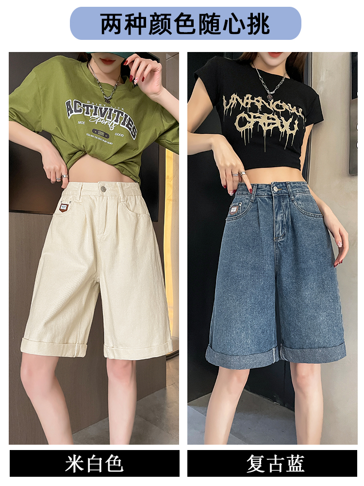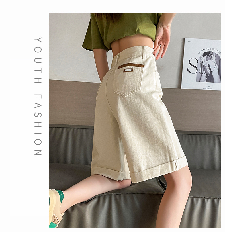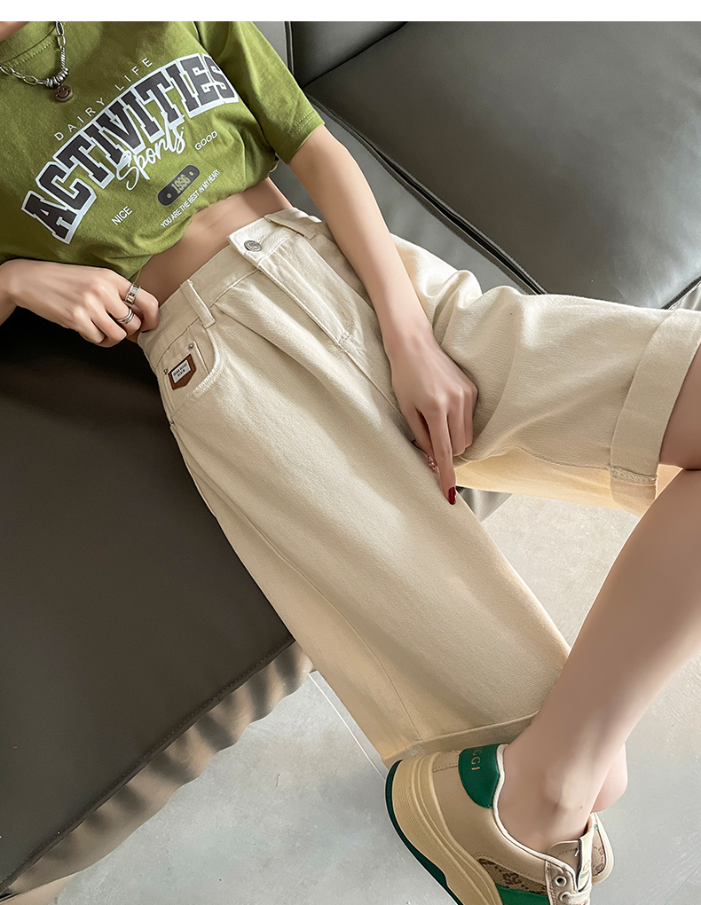 실사 베이지 색 5 점 데님 반바지 여성 여름 얇은 스타일 하이웨이스트 슬림해 보이는 볼륨 측면 루즈핏 넓은 다리 스트레이트 바지