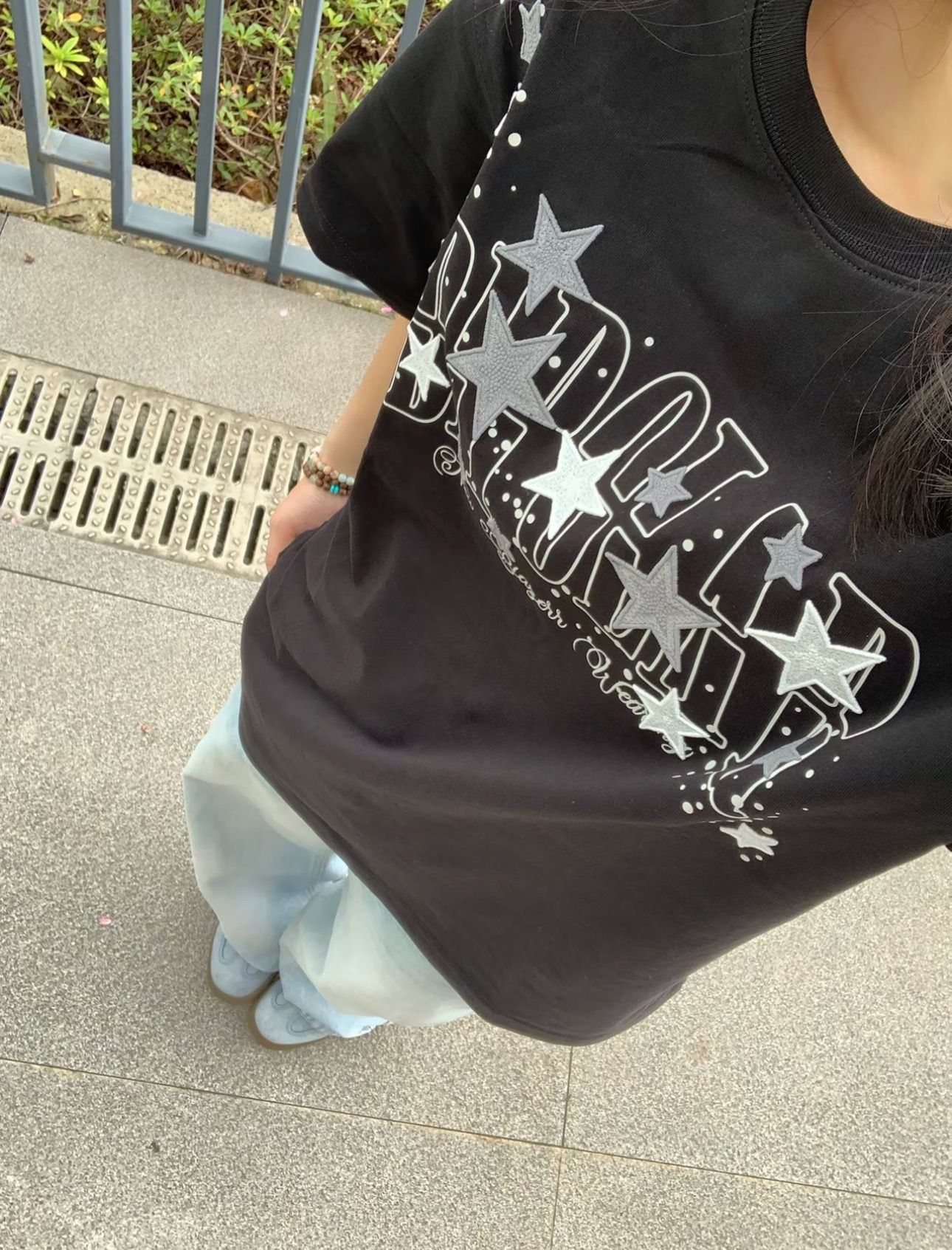 프린트 구슬 조각 자수 네리 가게 천 순면 220 그램 반팔 티셔츠 여성