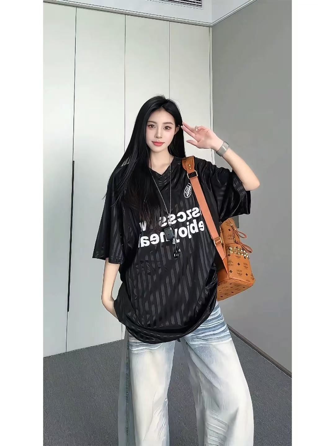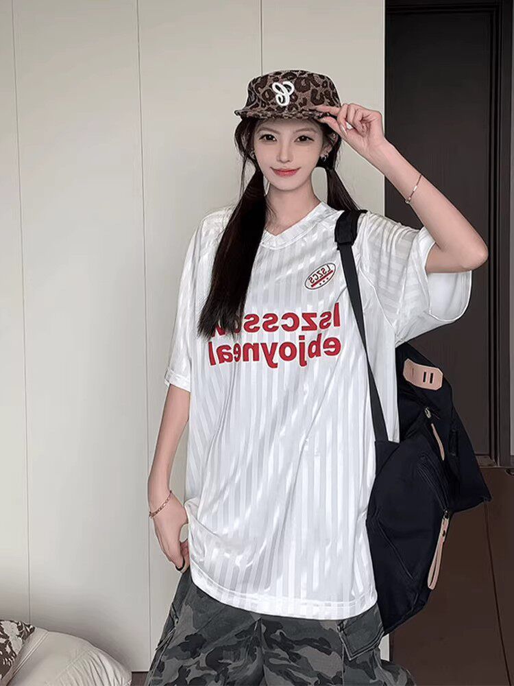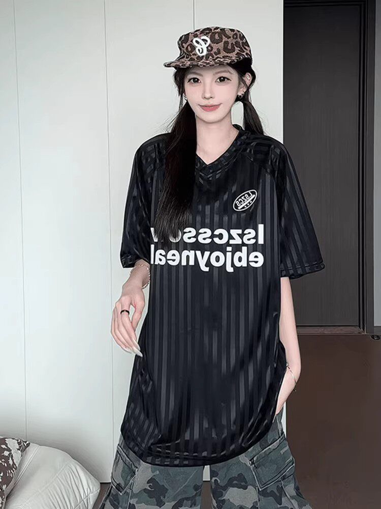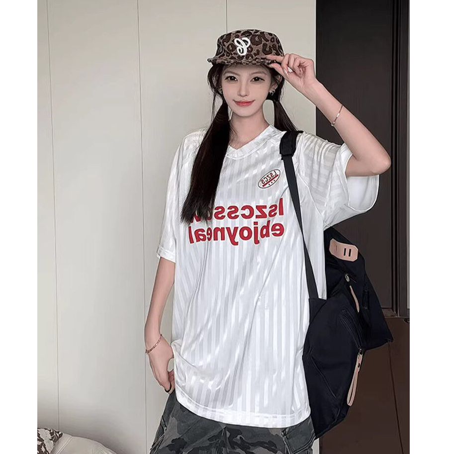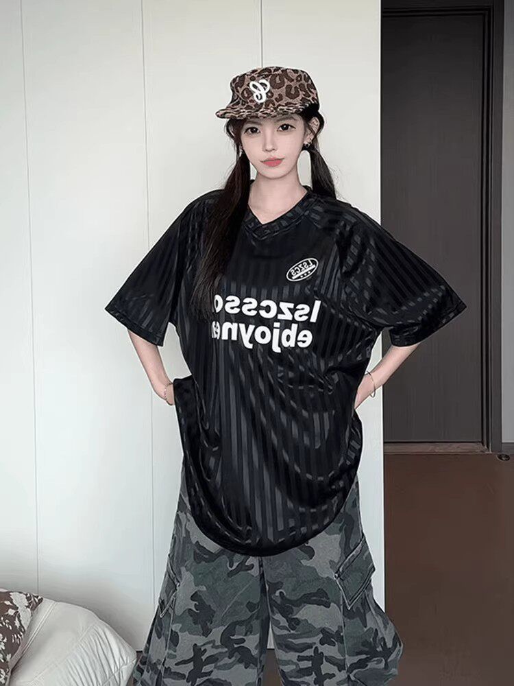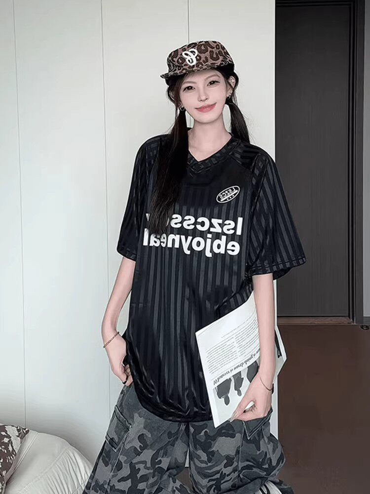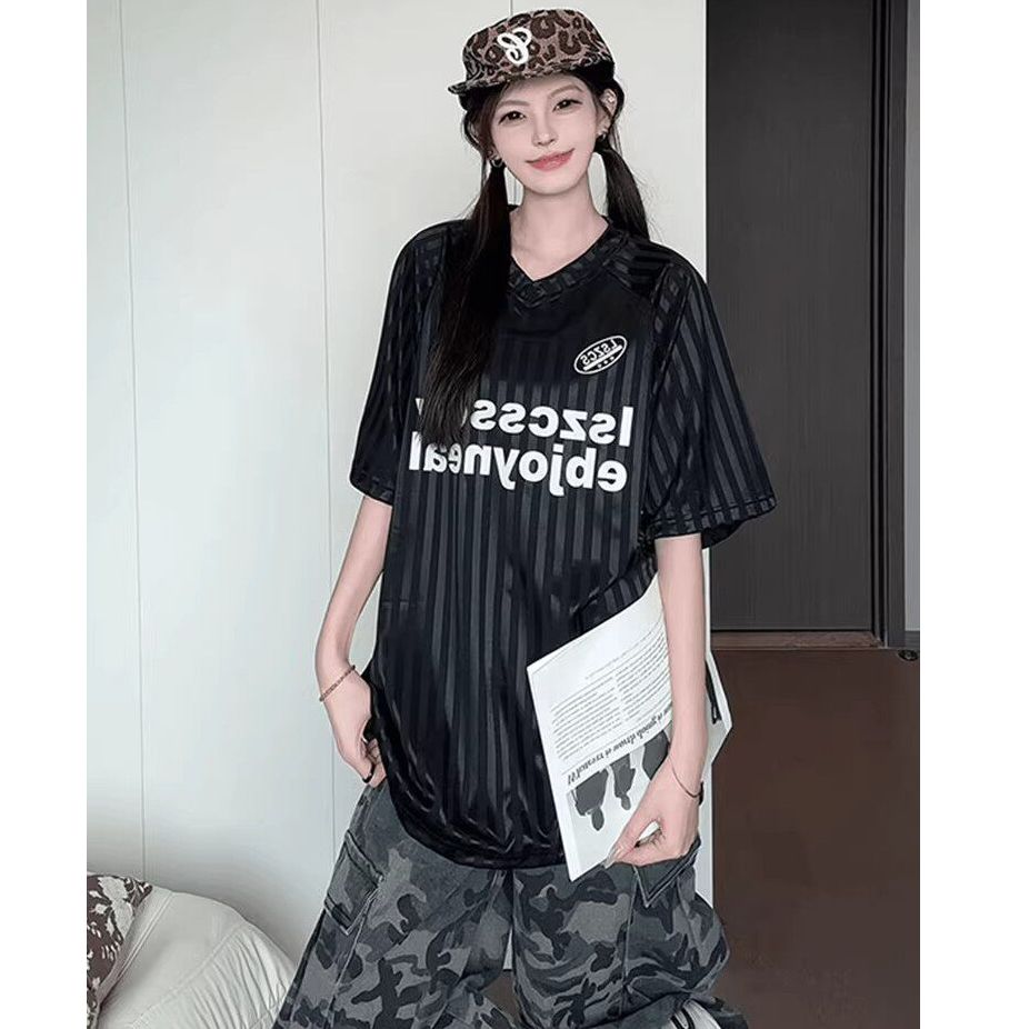 원본 자카드 원단 원본 솜씨 아메리칸 스트라이프 알파벳 프린트 저지 V넥 티셔츠 맨위 남녀 커플 여름