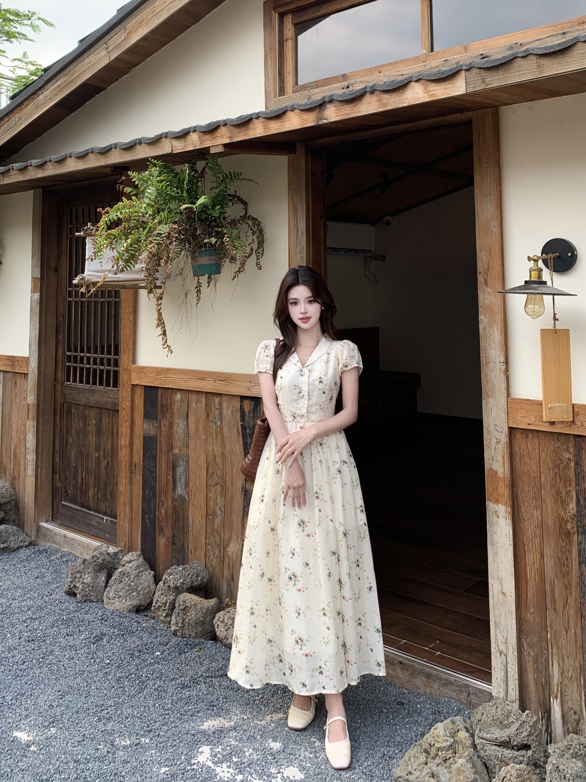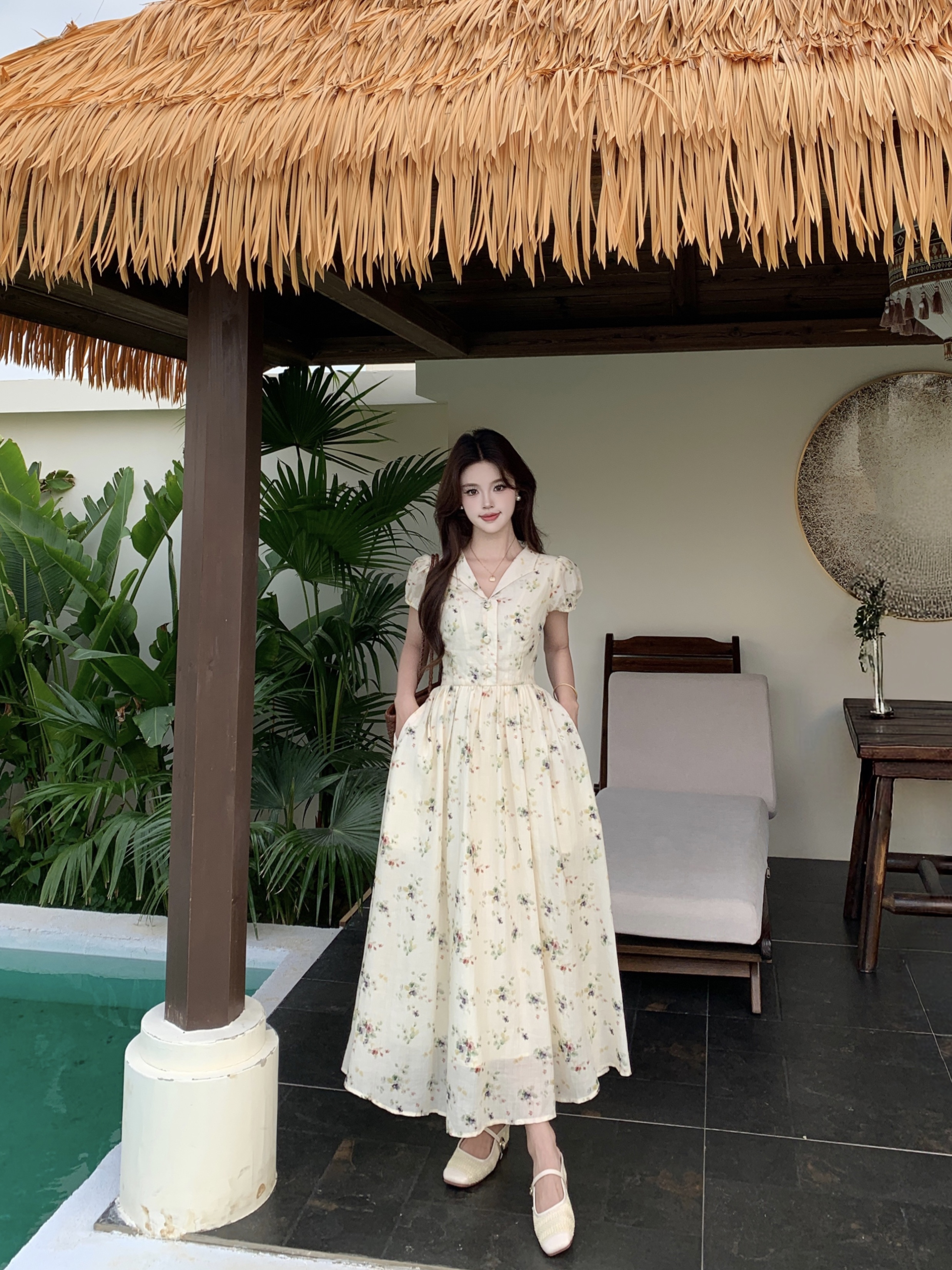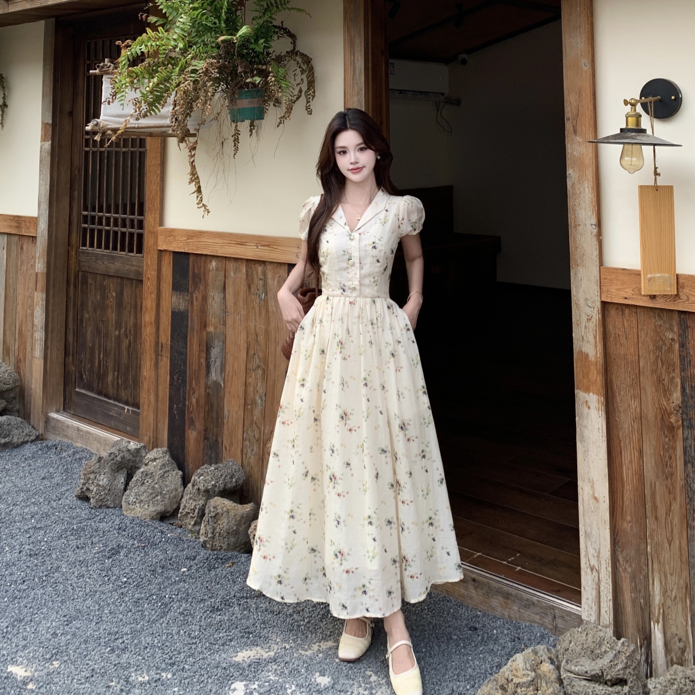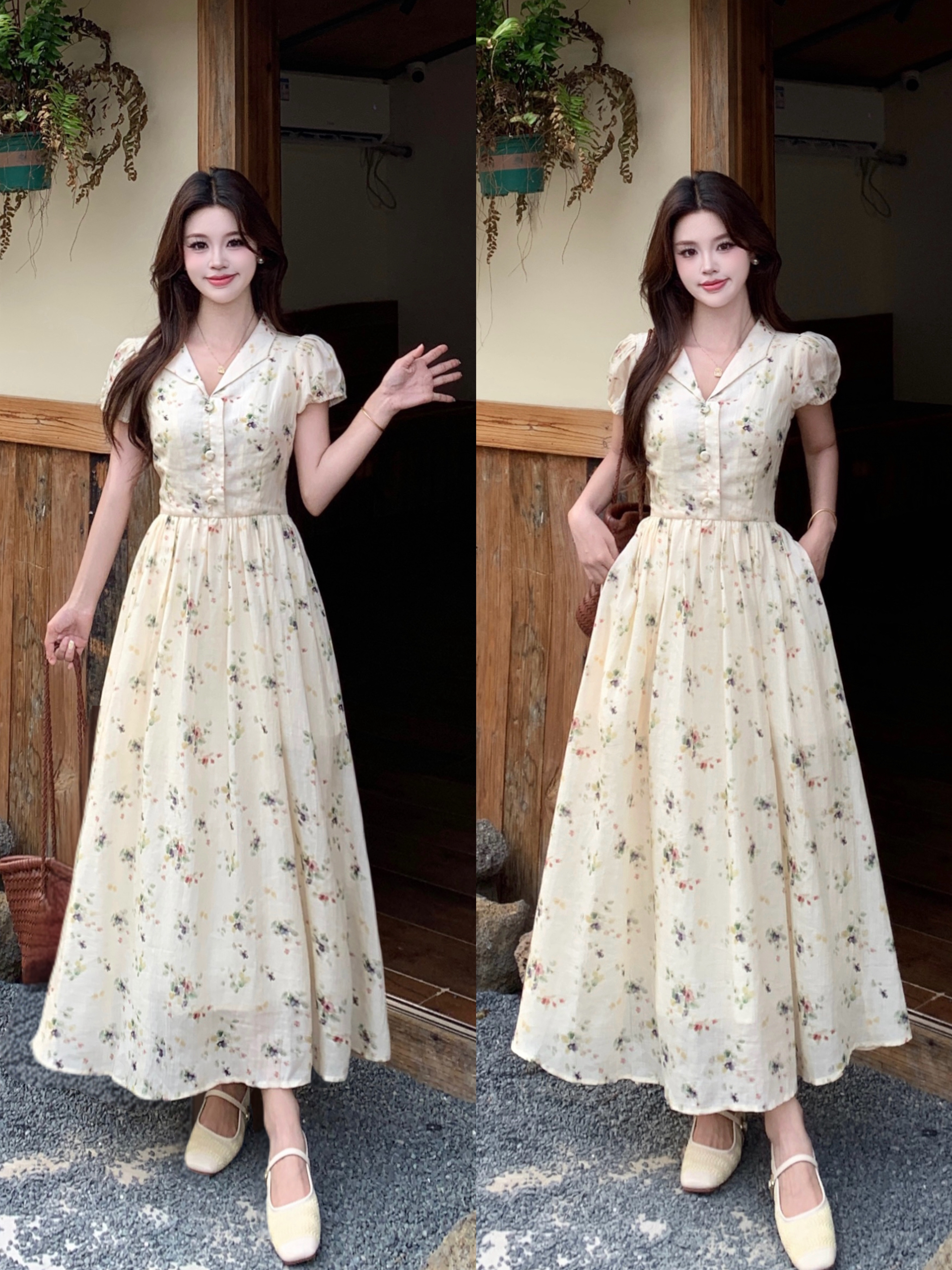 빅 사이즈 26 프랑스식 레트로 차 휴식 품격 롱 스커트 슬림해 보이는 꽃무늬 프린트 여름 중간 길이 허리 수축 여성 드레스