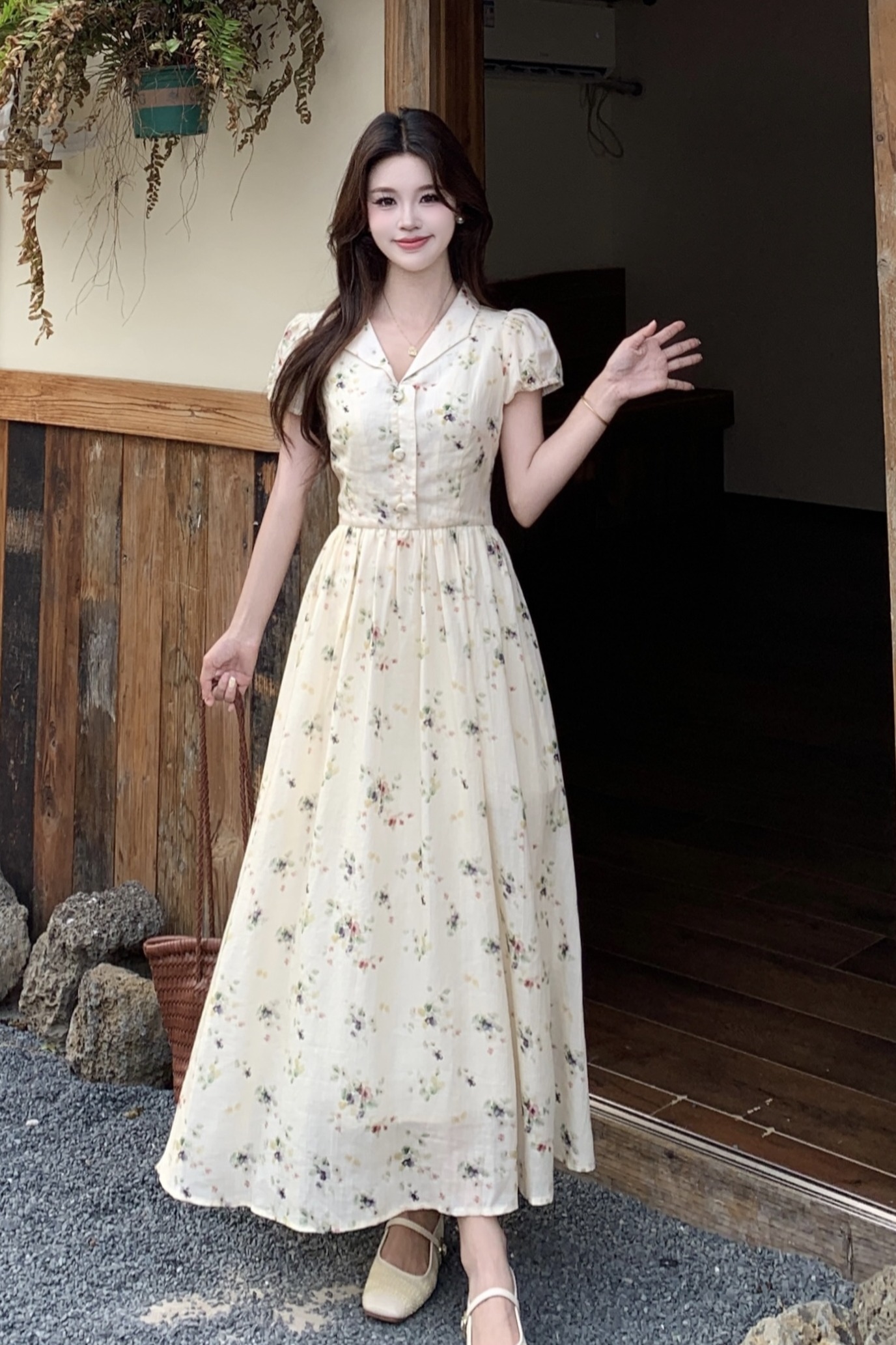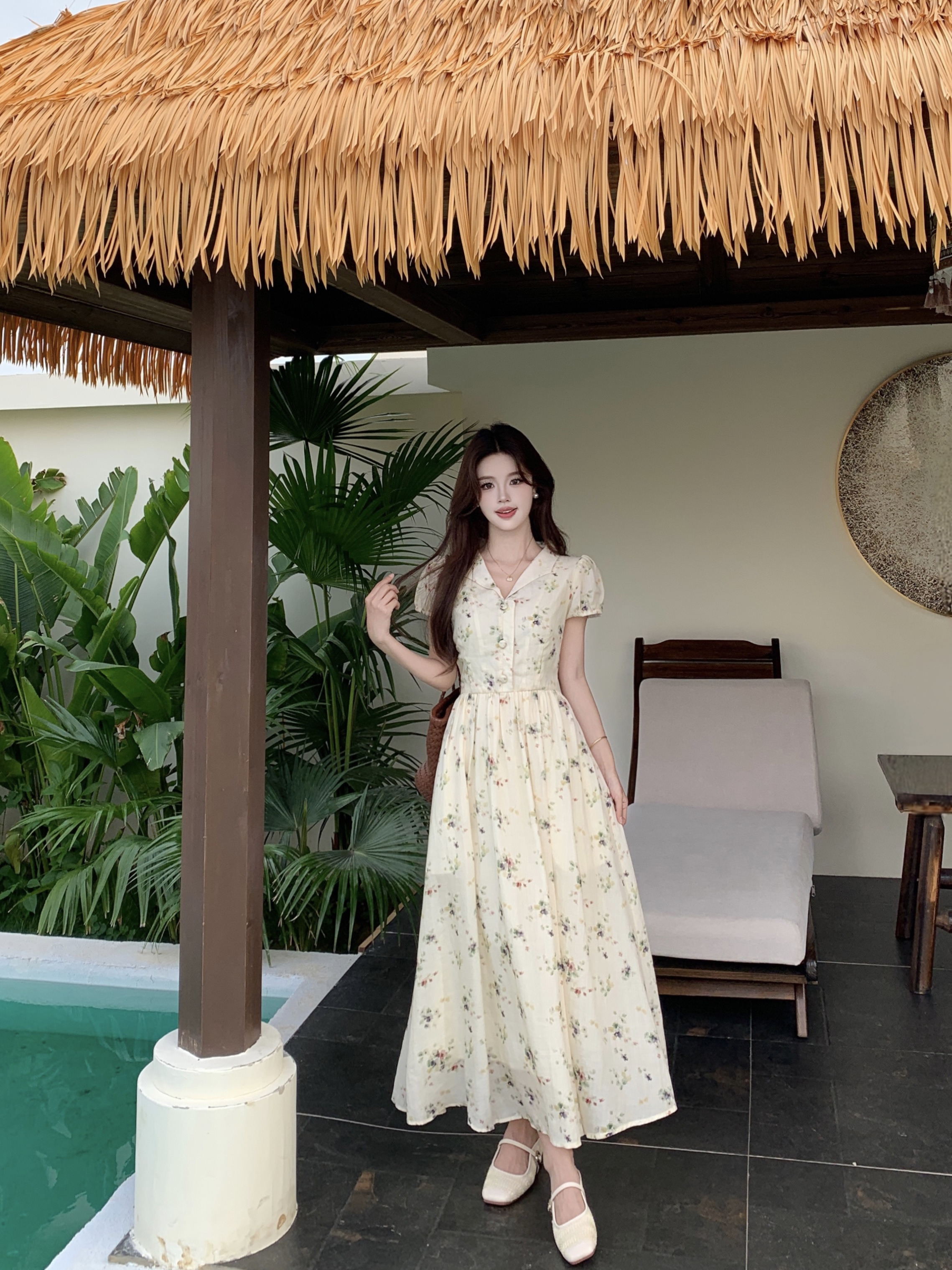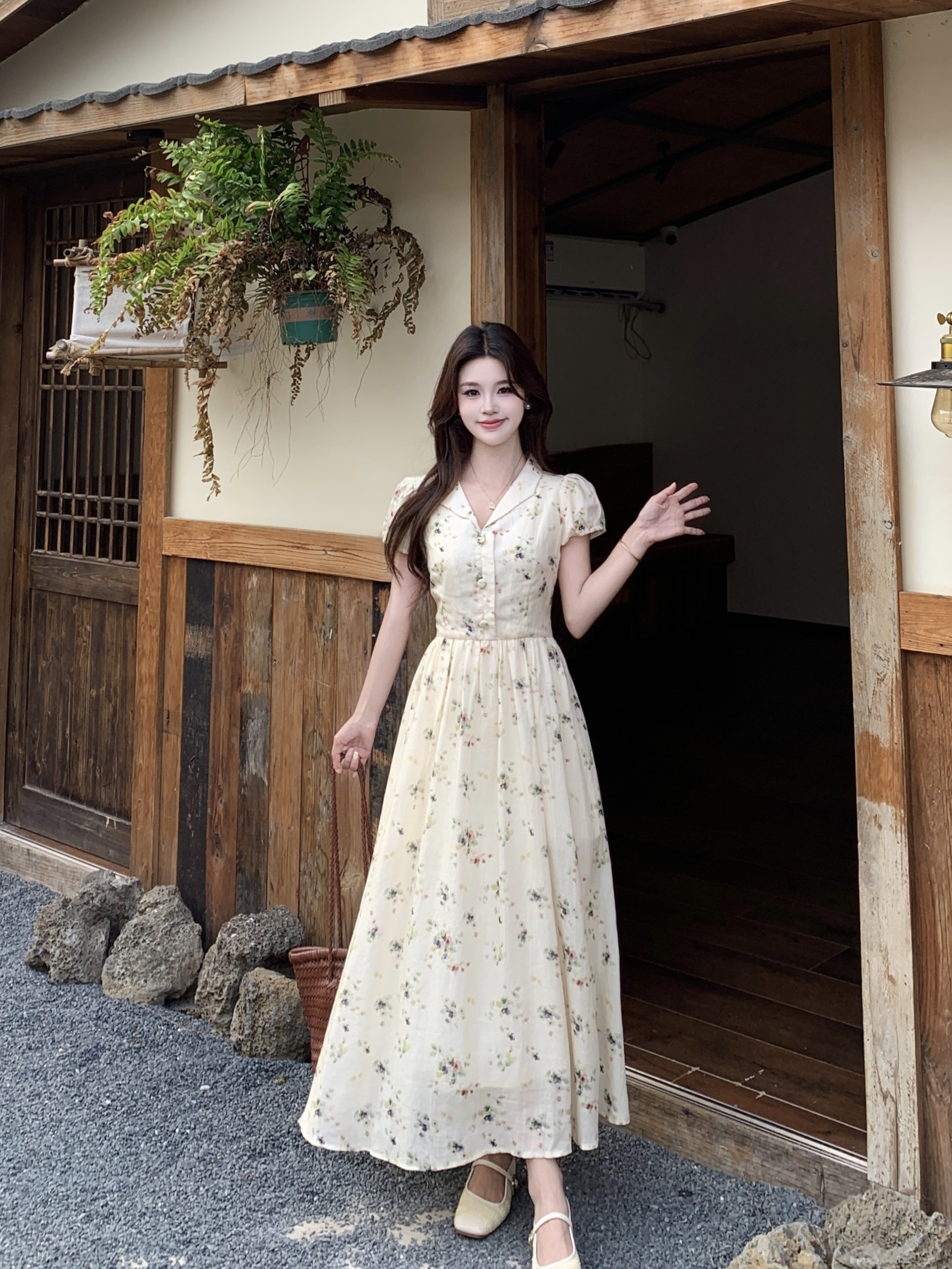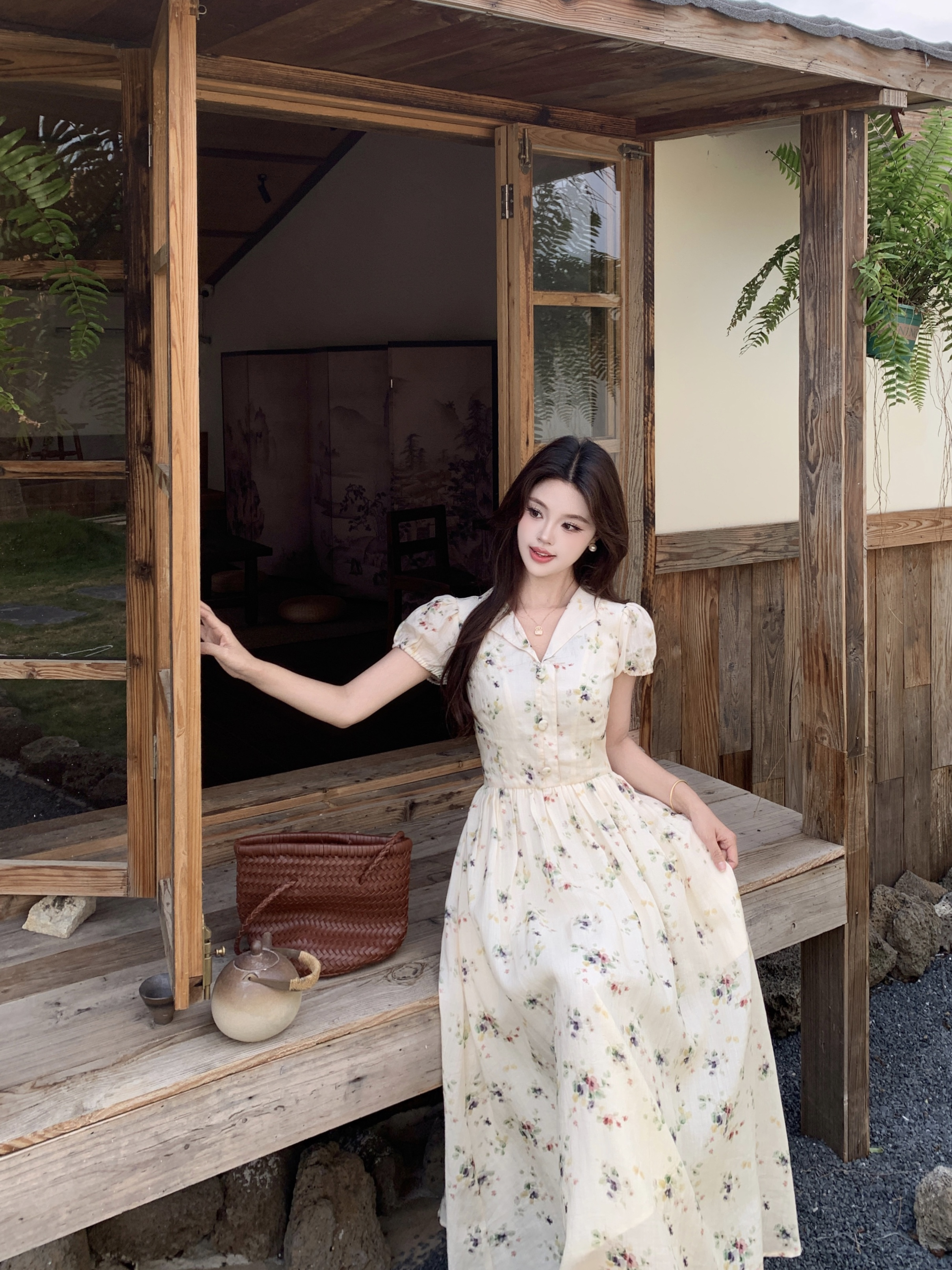 빅 사이즈 26 프랑스식 레트로 차 휴식 품격 롱 스커트 슬림해 보이는 꽃무늬 프린트 여름 중간 길이 허리 수축 여성 드레스