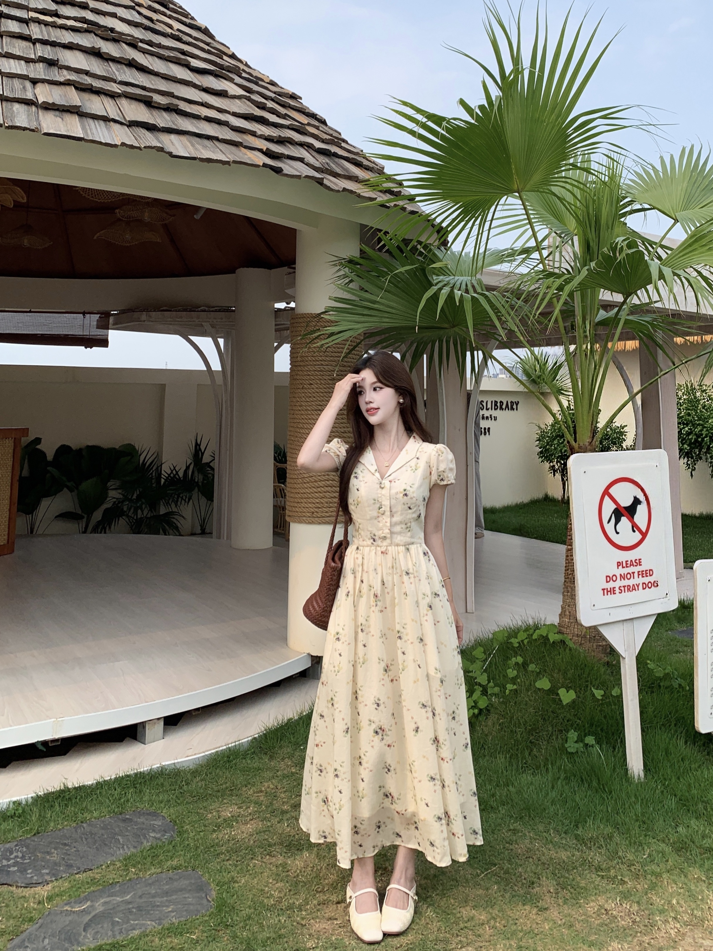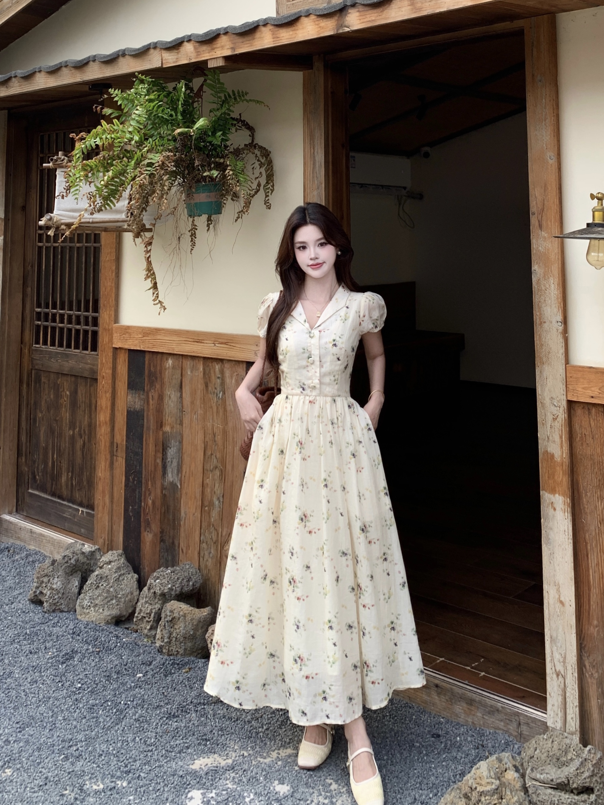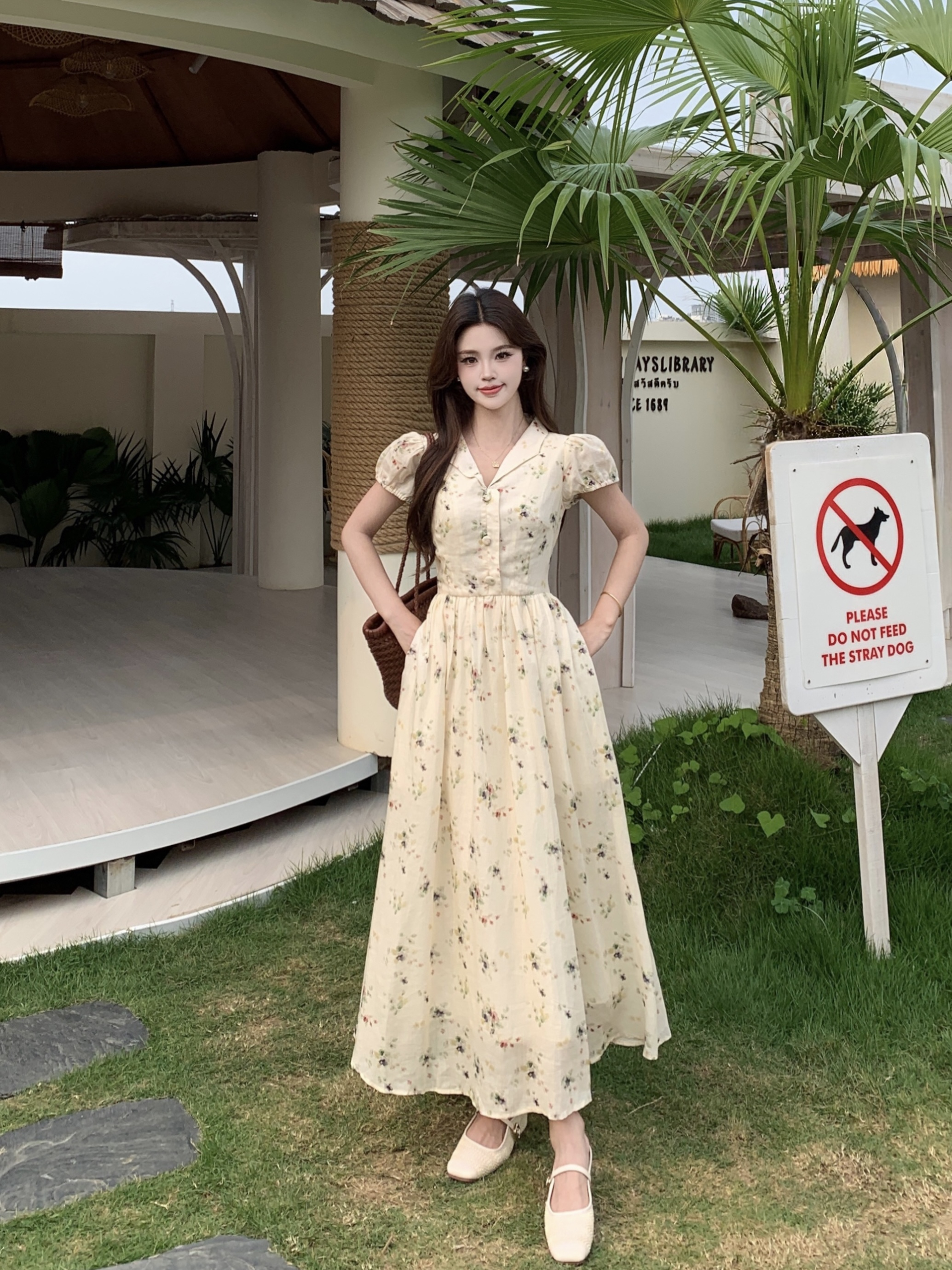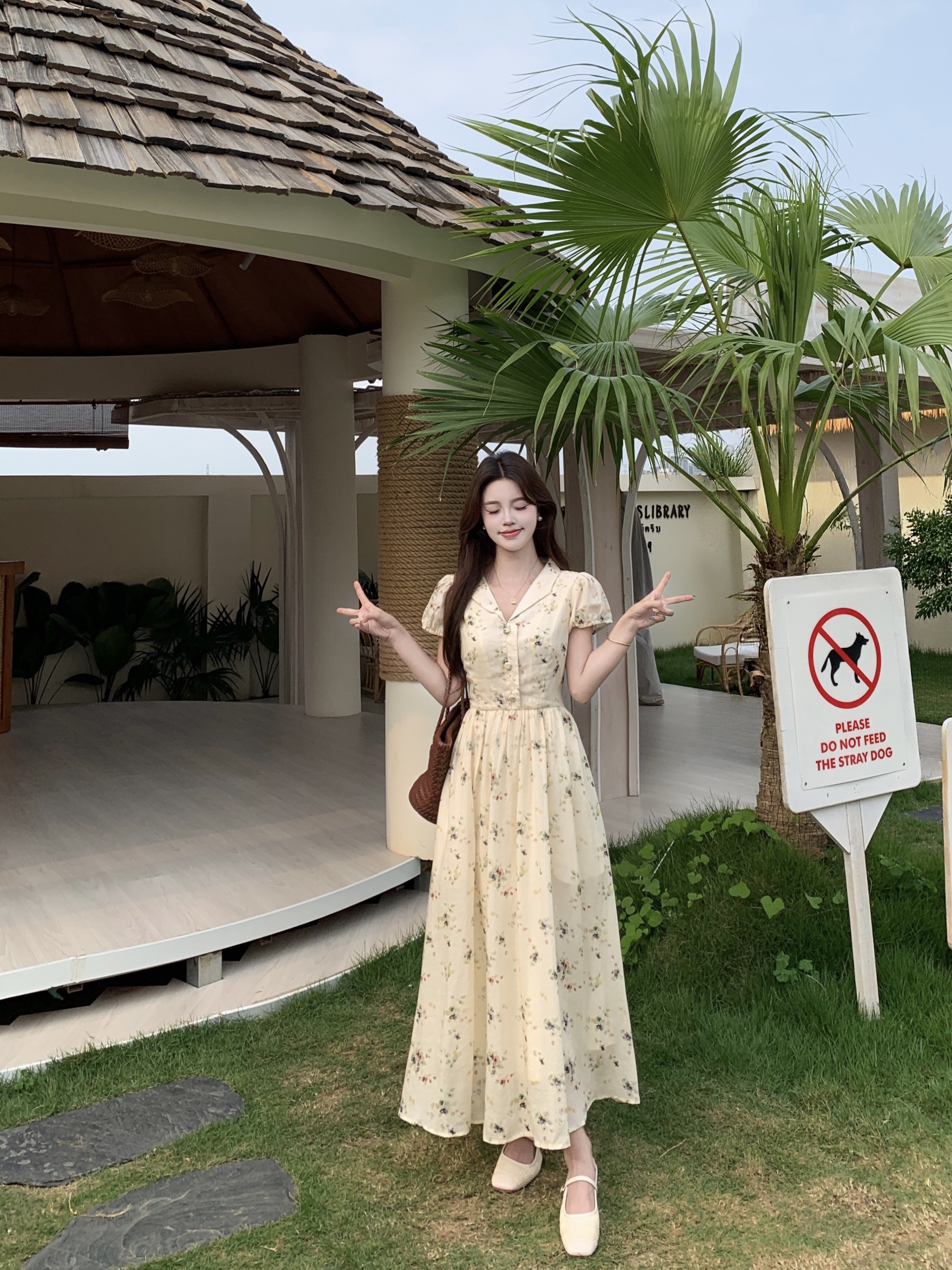 빅 사이즈 26 프랑스식 레트로 차 휴식 품격 롱 스커트 슬림해 보이는 꽃무늬 프린트 여름 중간 길이 허리 수축 여성 드레스