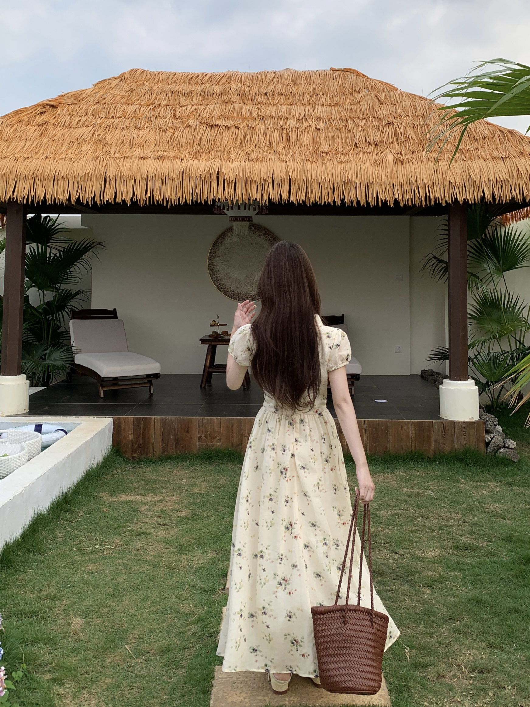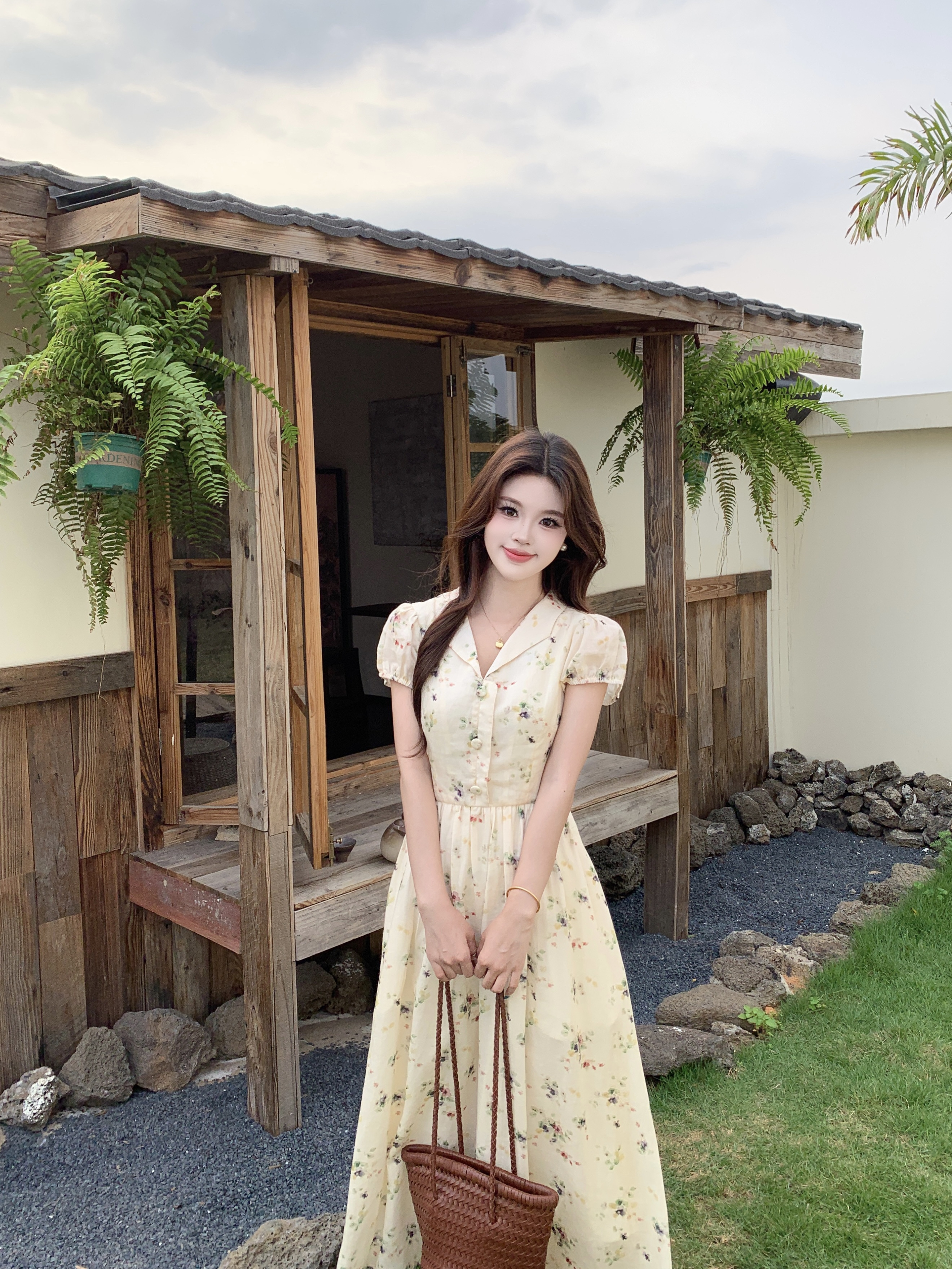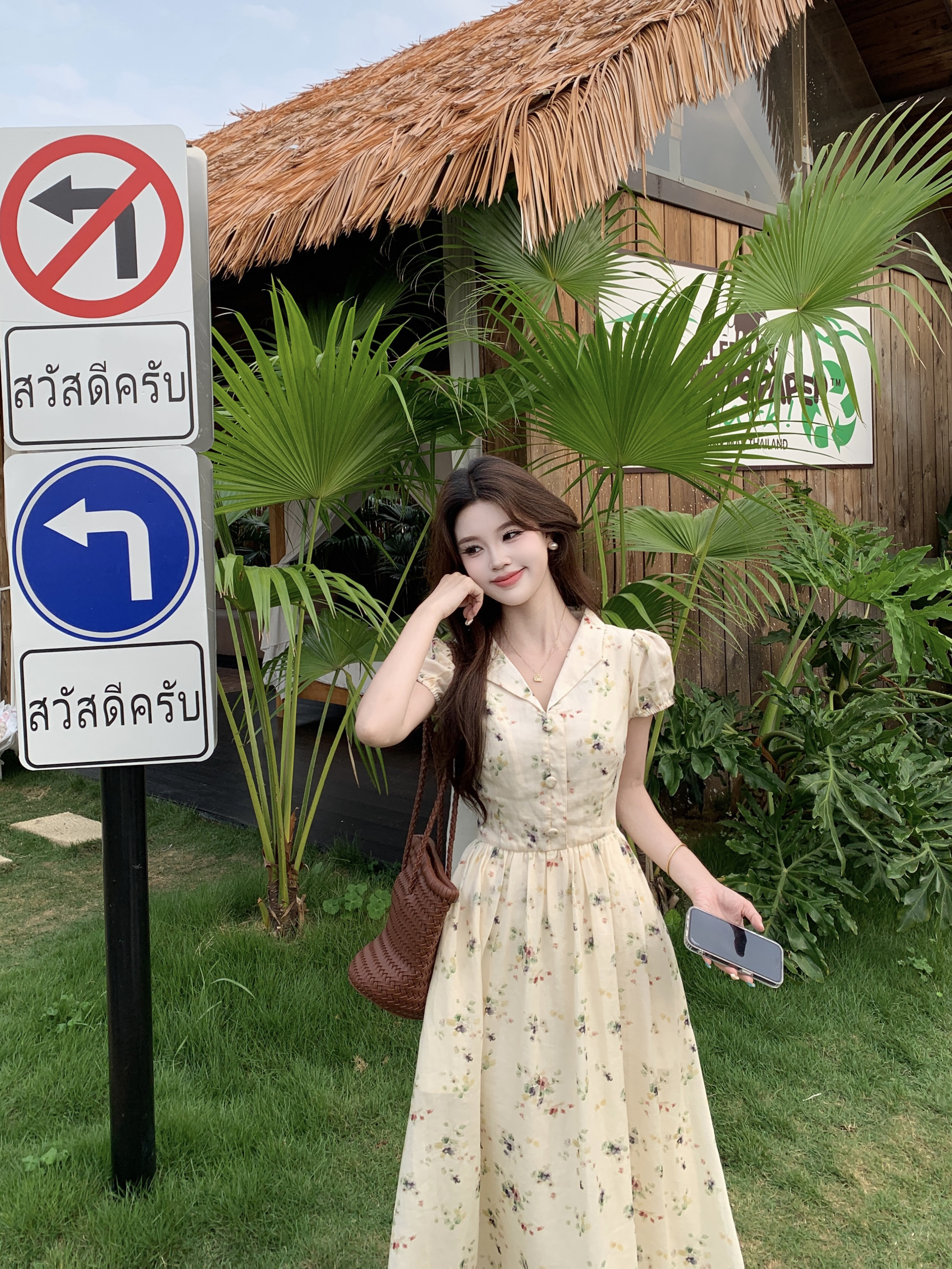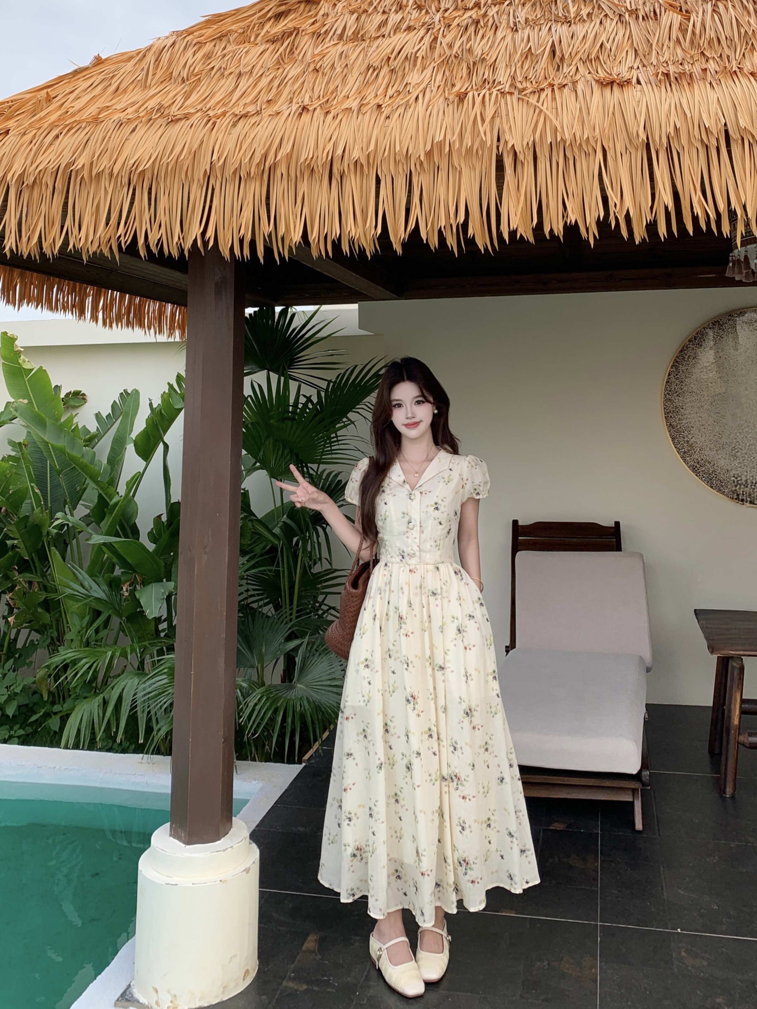 빅 사이즈 26 프랑스식 레트로 차 휴식 품격 롱 스커트 슬림해 보이는 꽃무늬 프린트 여름 중간 길이 허리 수축 여성 드레스