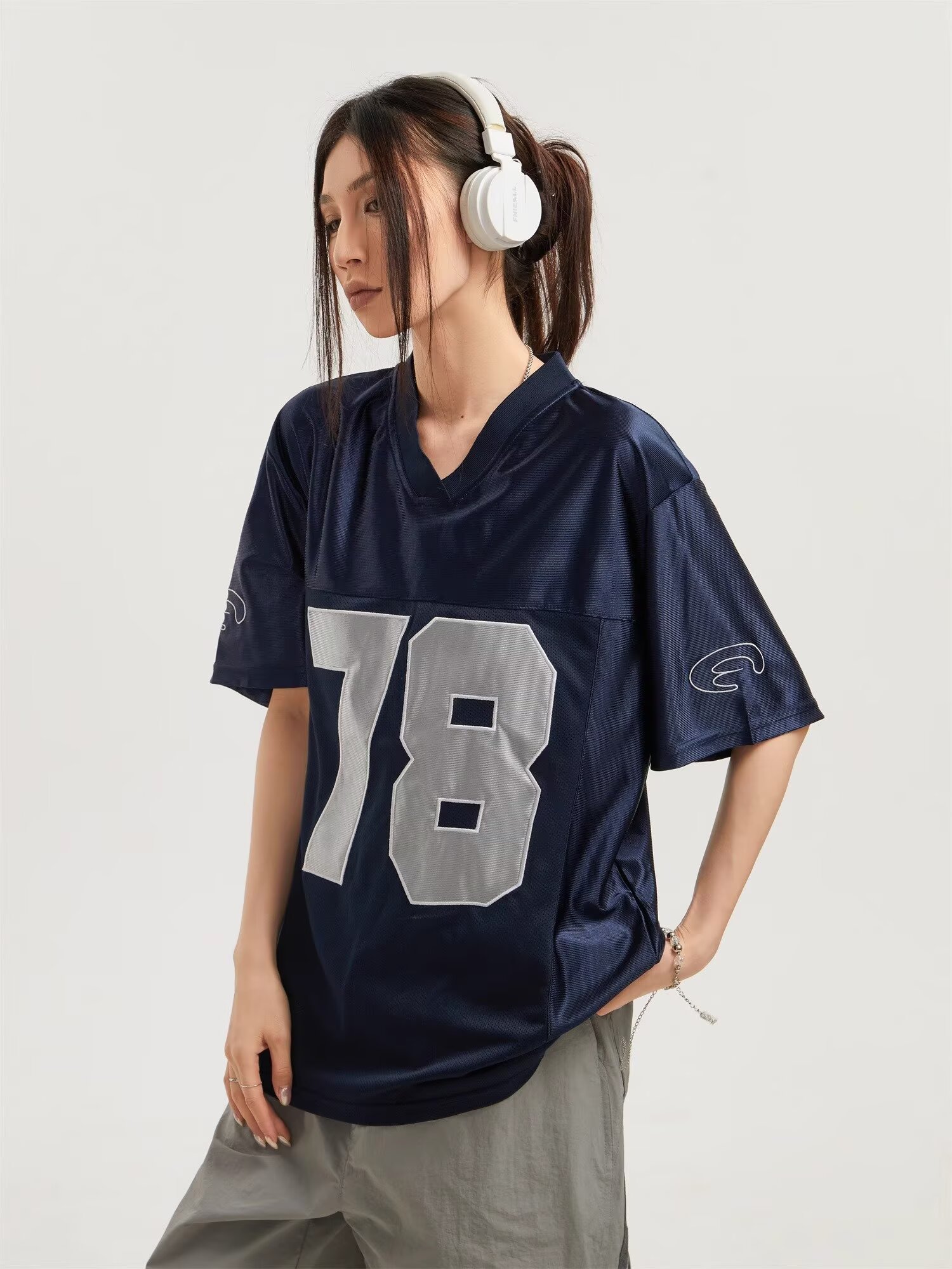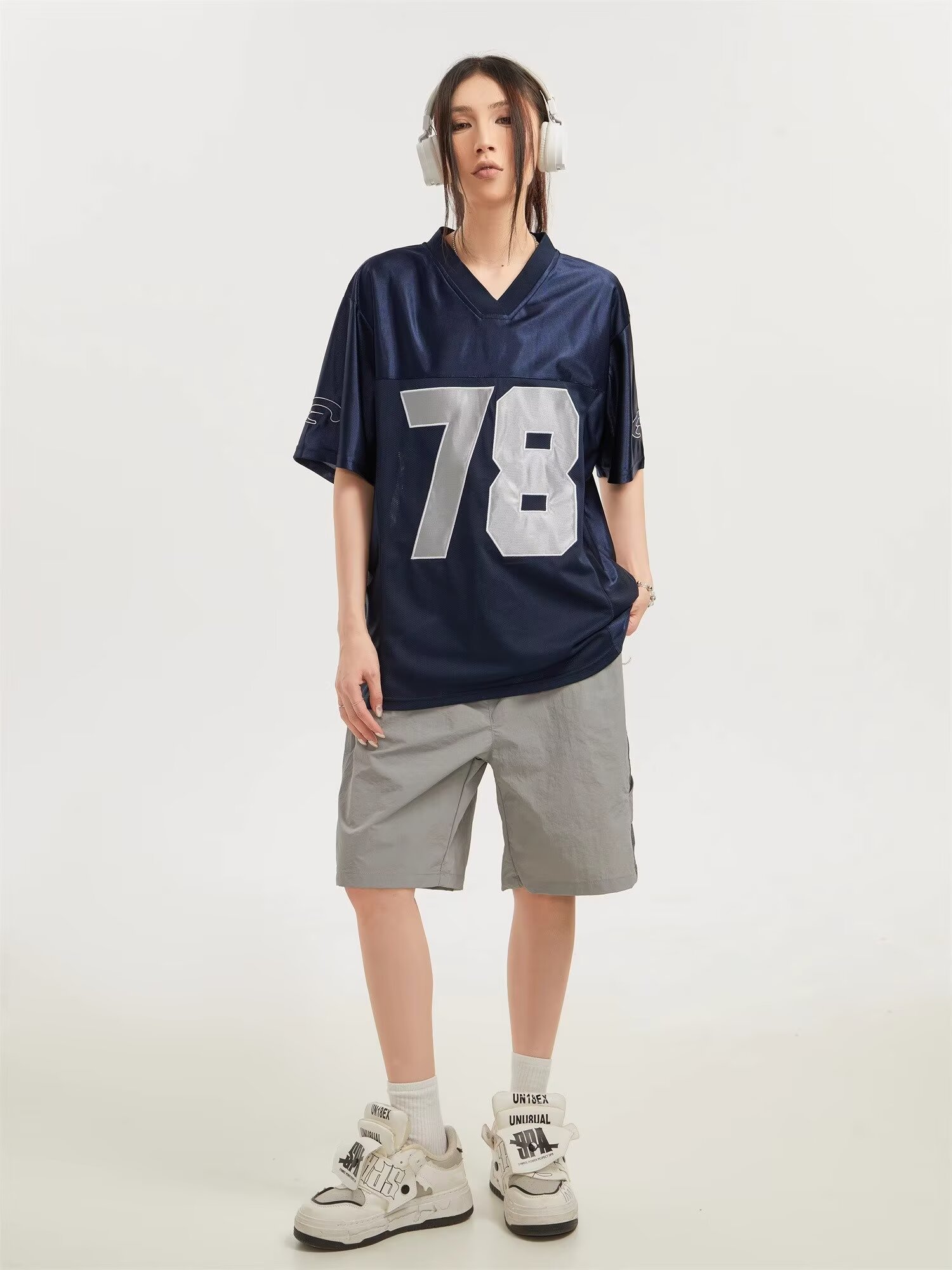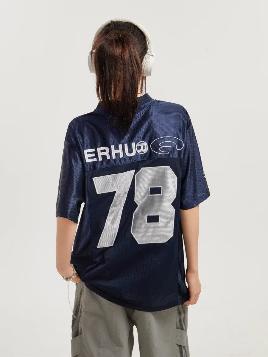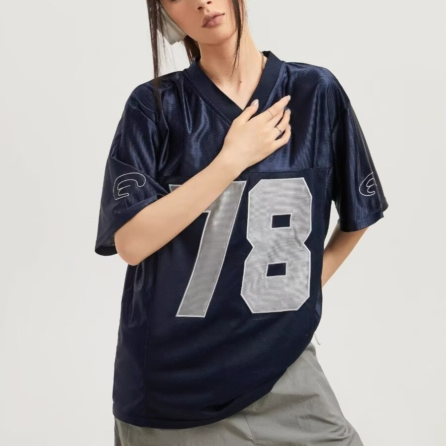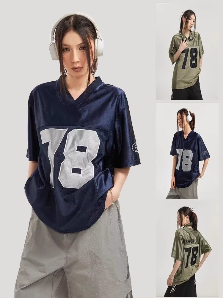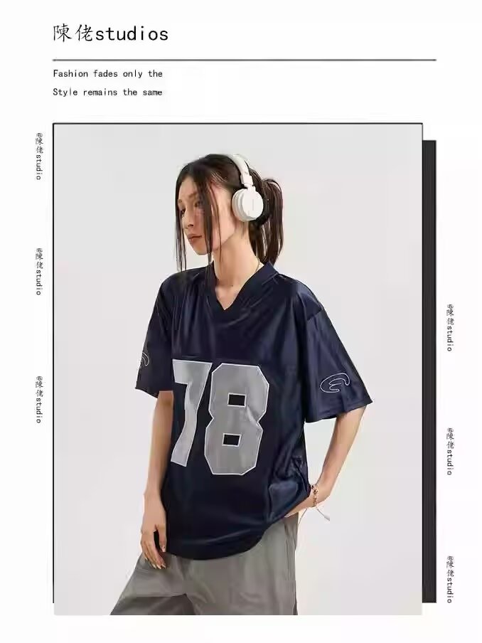 원본 자카드 원단 원본 솜씨 아메리칸 스트라이프 알파벳 프린트 저지 V넥 티셔츠 맨위 남녀 커플 여름