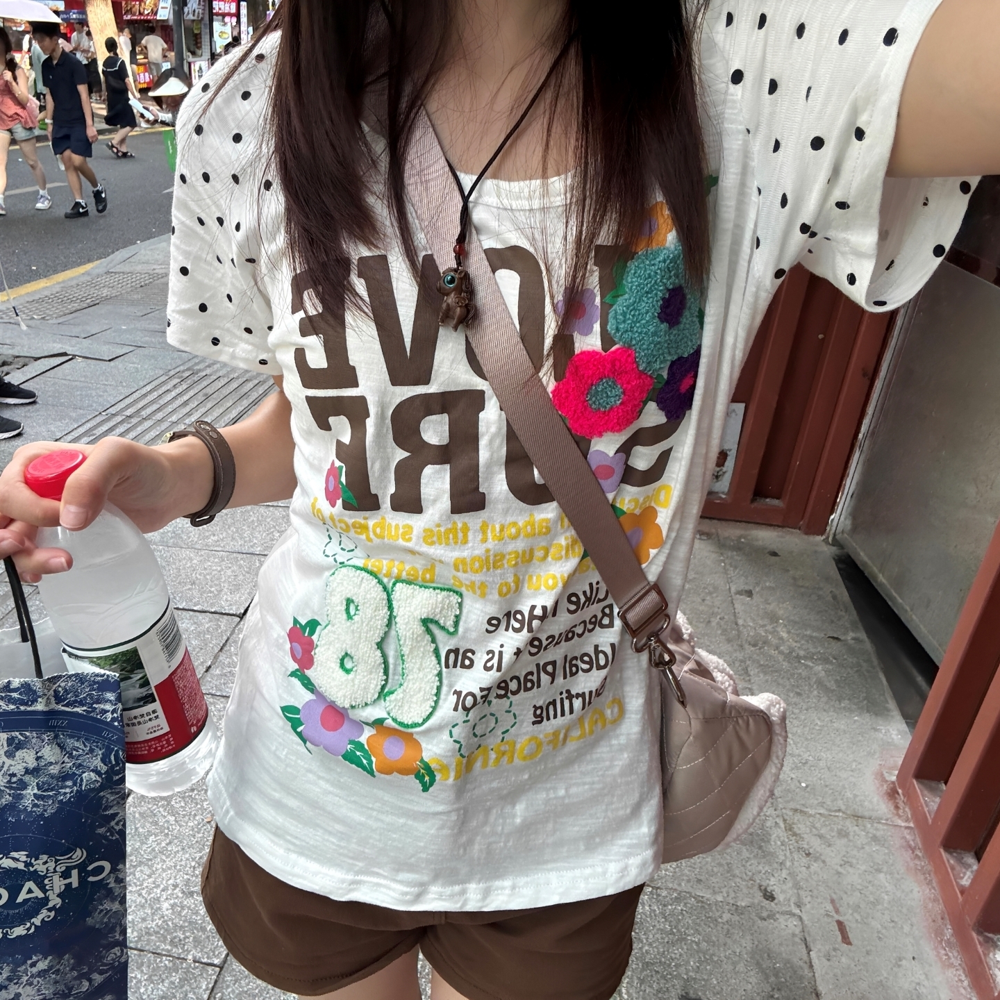 프린트 구슬 조각 자수 네리 가게 천 순면 220 그램 반팔 티셔츠 여성