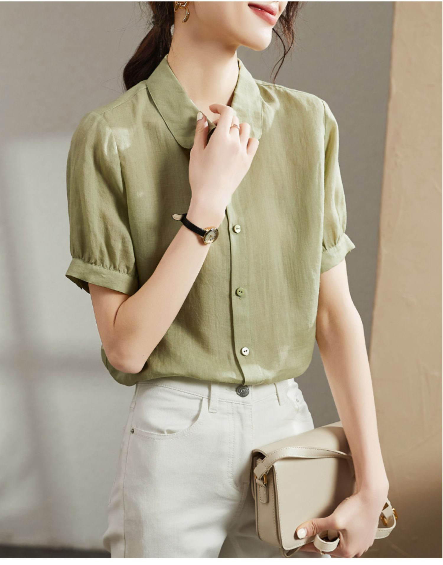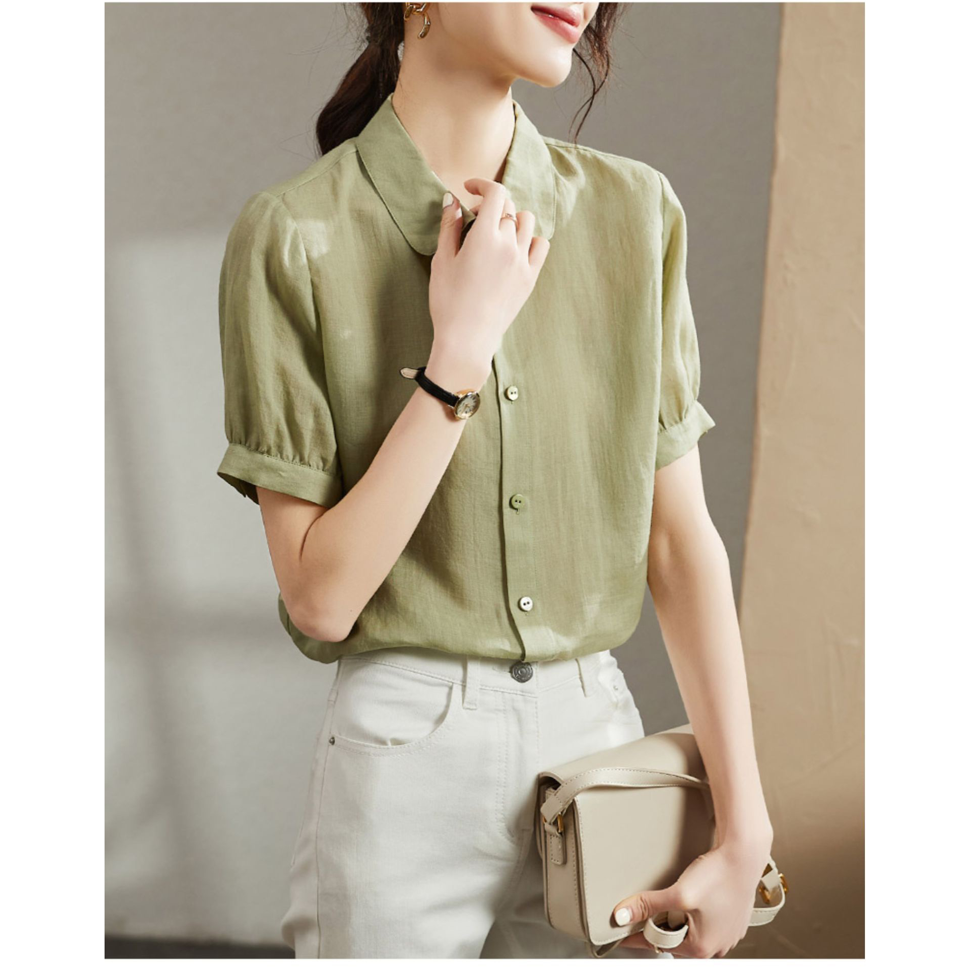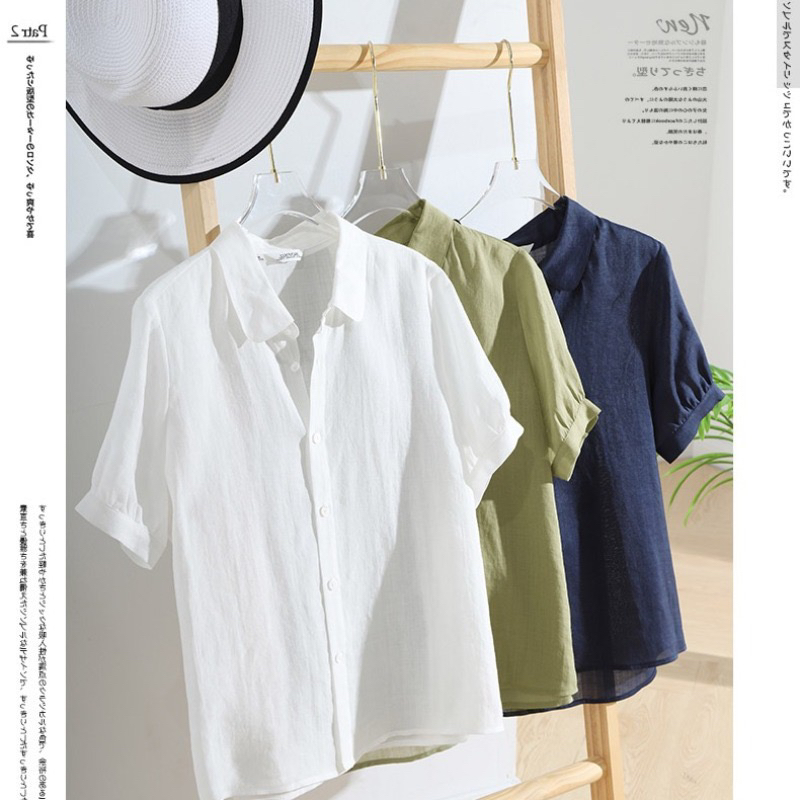 프랑스식 화이트 면 린넨 여성 셔츠 여름 얇은 스타일 아마 거품 소매 셔츠 품격 중간 소매 5 점 소매 맨위
