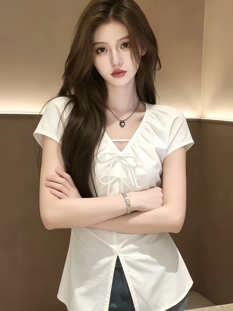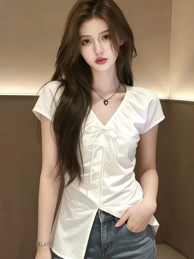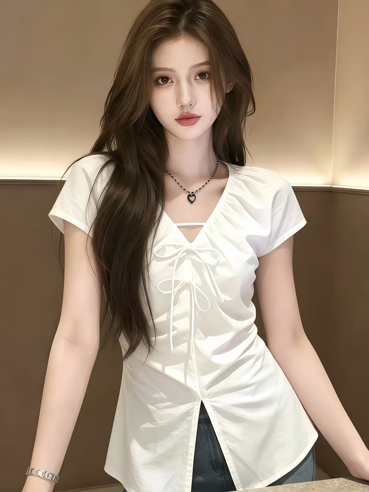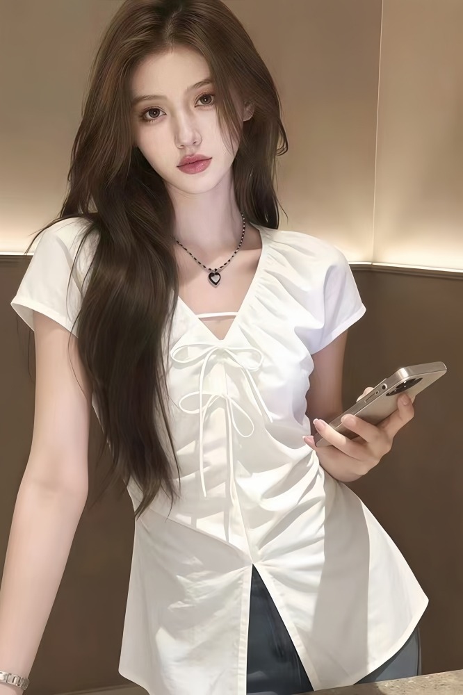 여름 화이트 스트랩 트임 V넥 여성 셔츠 2026 새로운 그레이트 봐라. 프랑스식 사소한 아름다운 품격 맨위