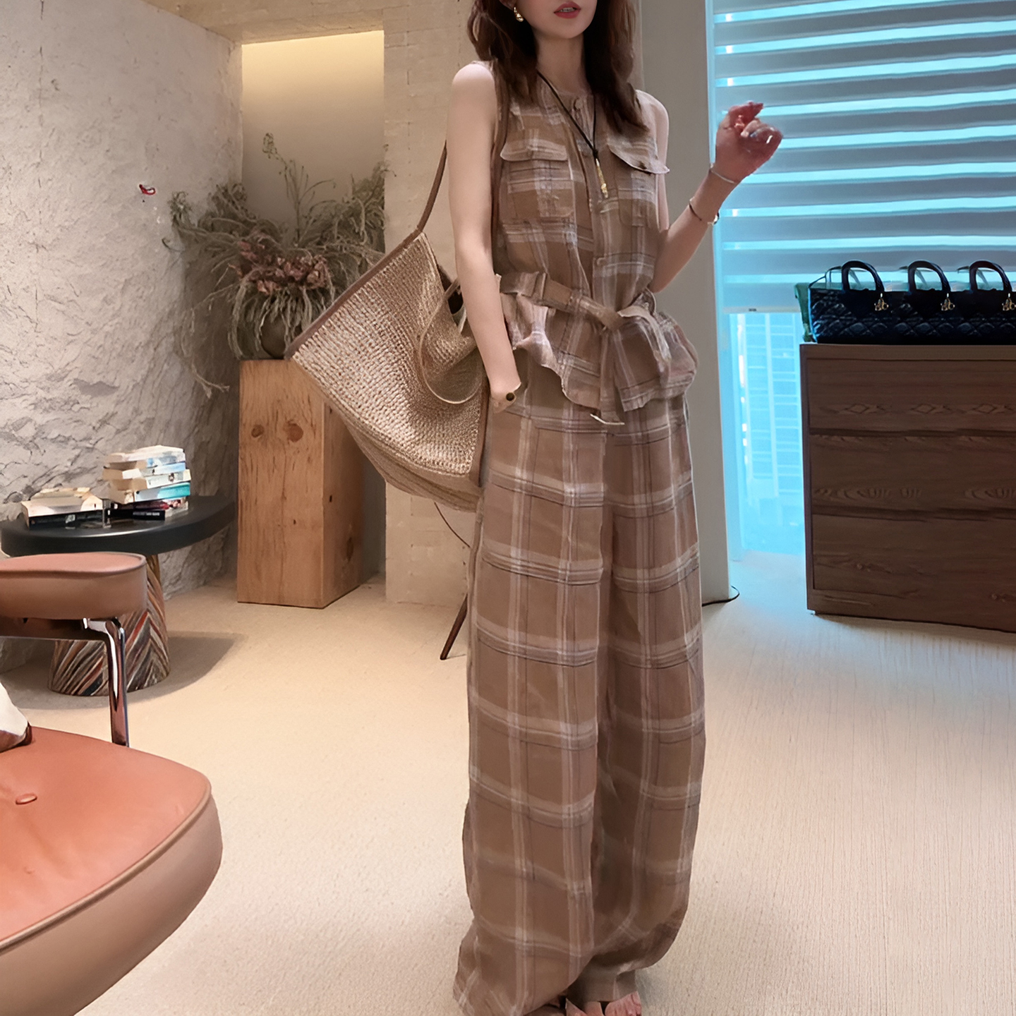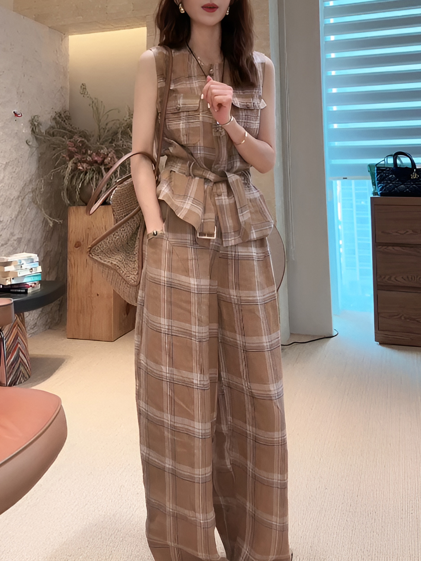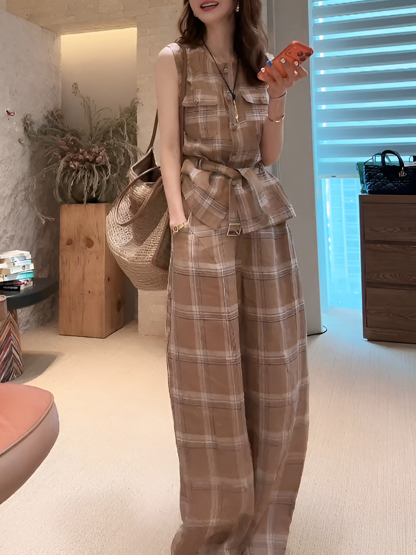 경관 그림 민소매 베스트 와이드 레그 팬츠 세트 2026 새로운 오래된 돈 바람 빛 요리 한 빛 사람들 코치 착용 가져 가라. 전체 집합