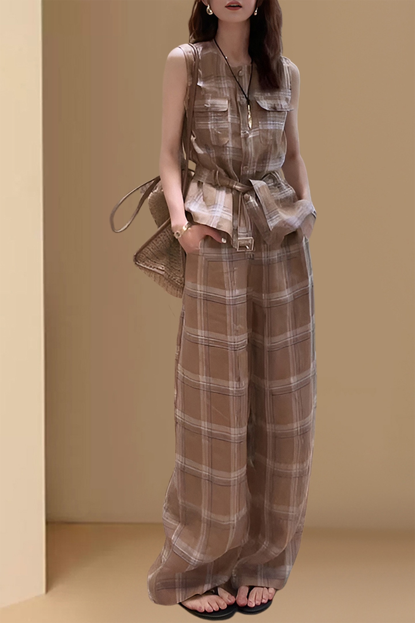 경관 그림 프랑스식 빛 요리 한 우아함 착용 가져 가라. 민소매 베스트 여름 새로운 고급 절묘한 와이드 레그 팬츠 투피스 슈트