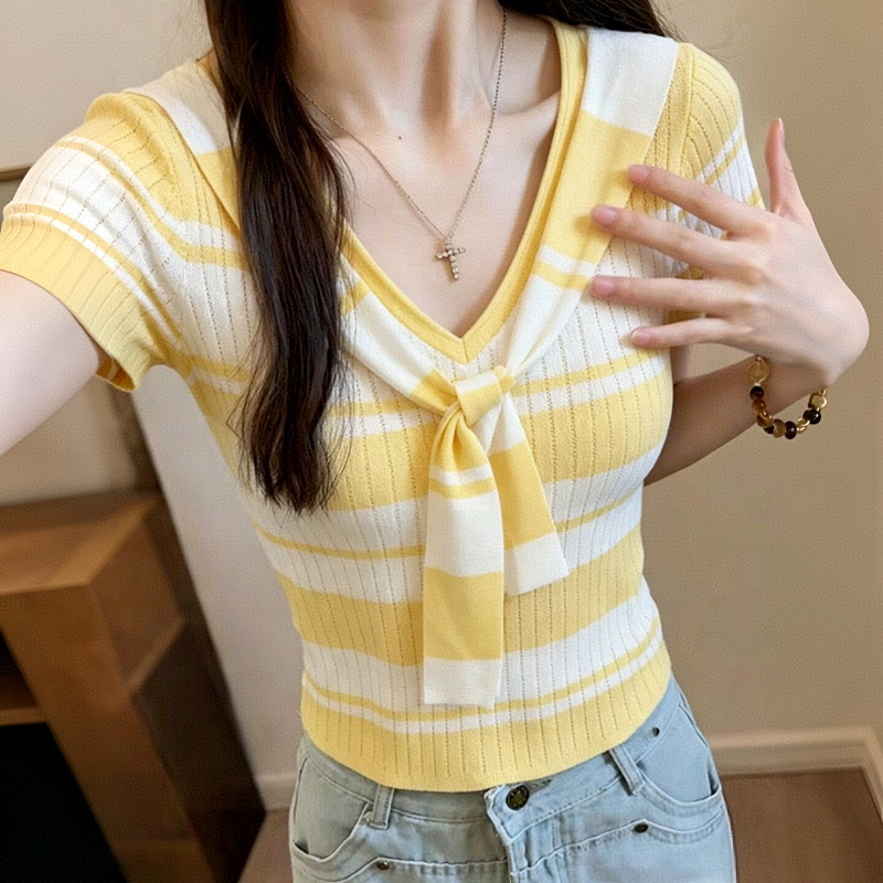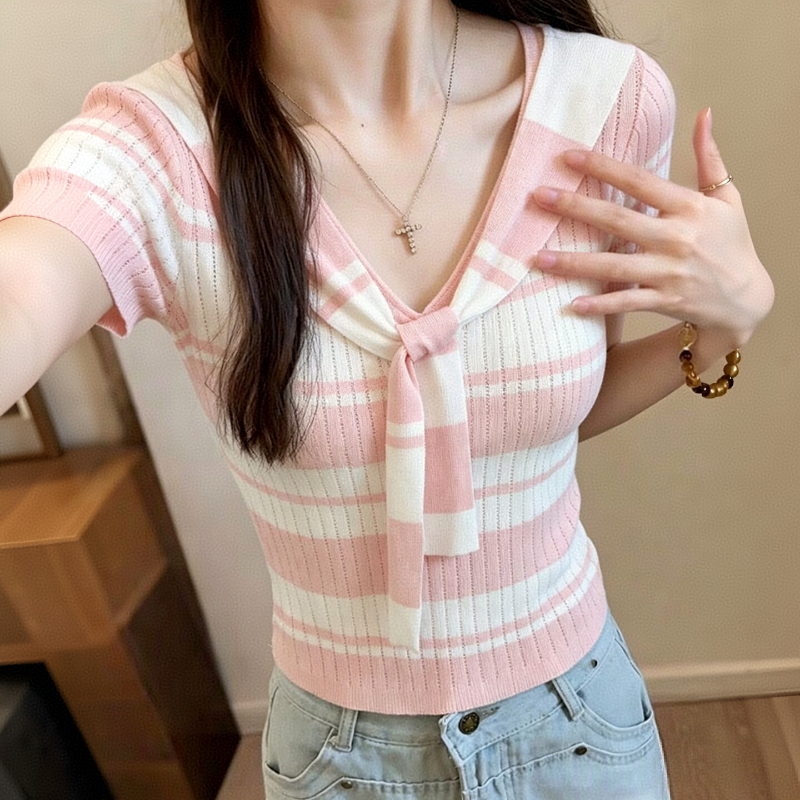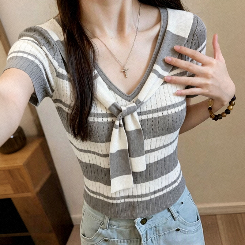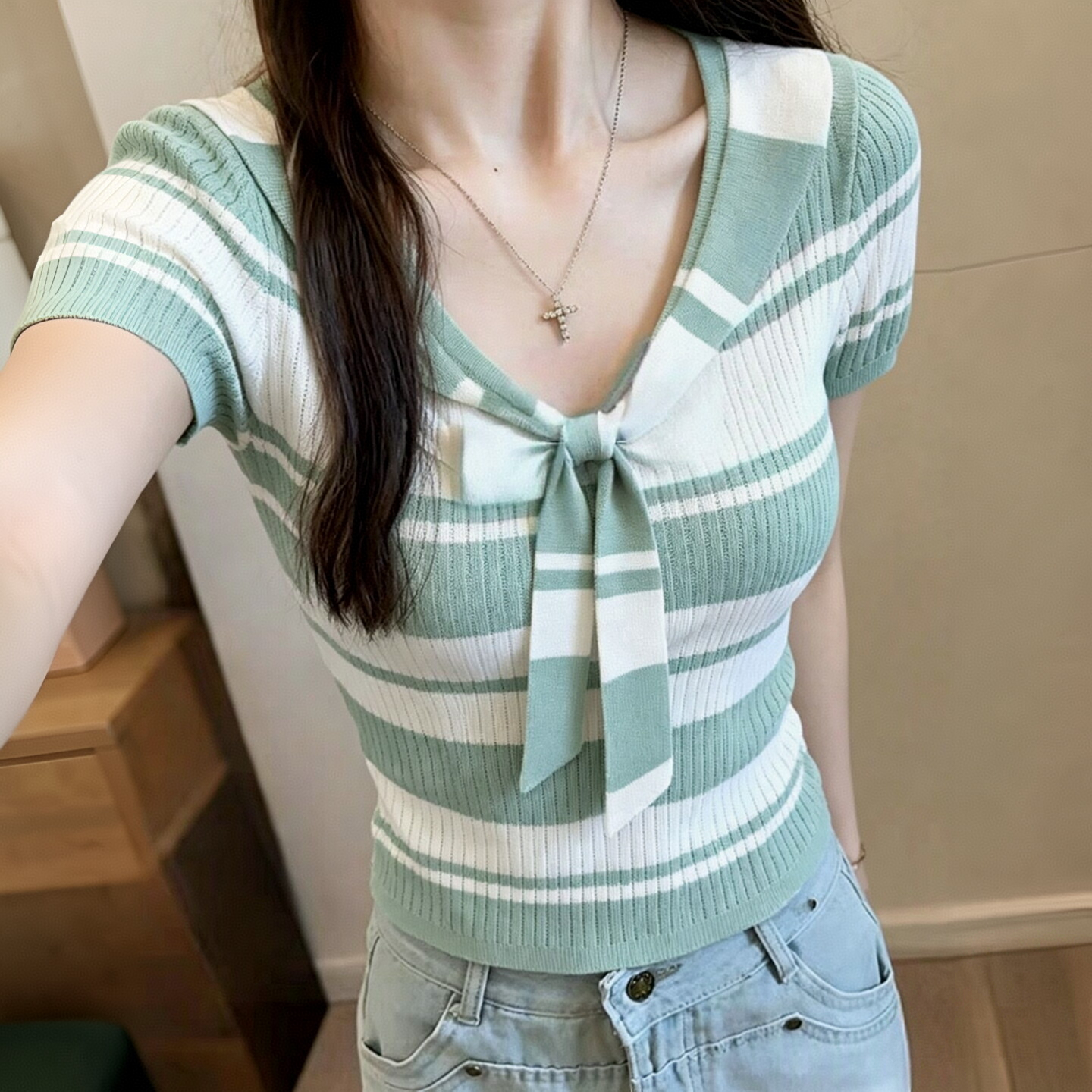 스트라이프 얼음 실크 니트 스웨터 반팔 티셔츠 여성 여름 얇은 쇼트 스타일 긍정적 인 어깨 라운드 넥 부드러운 달콤함 몸매 가꾸기 맨위