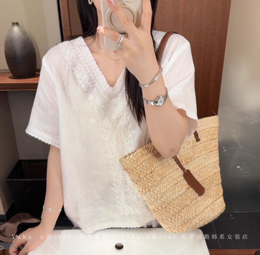 여름 드레스 새로운 빅 사이즈 여성 의류 무거운 작업 자수 V넥 면 린넨 반팔 작은 셔츠 슈퍼 잘 생긴 프랑스식 맨위 셔츠