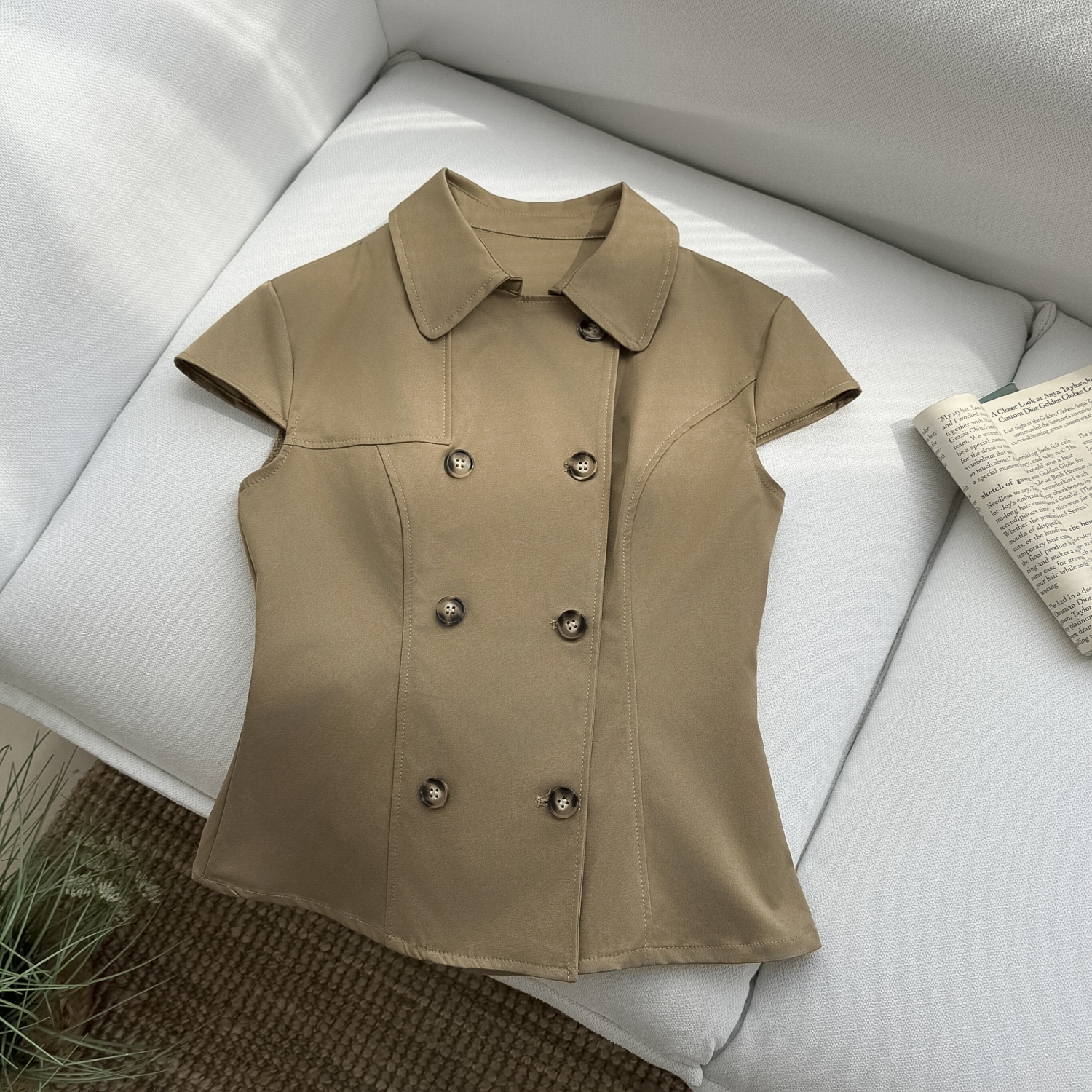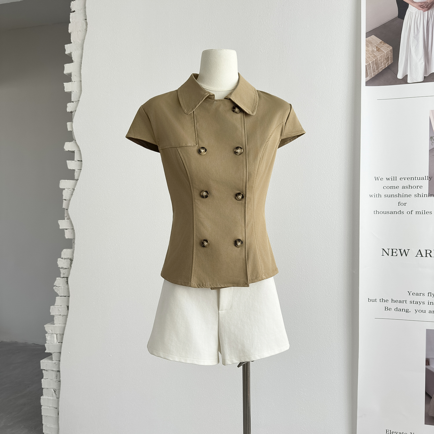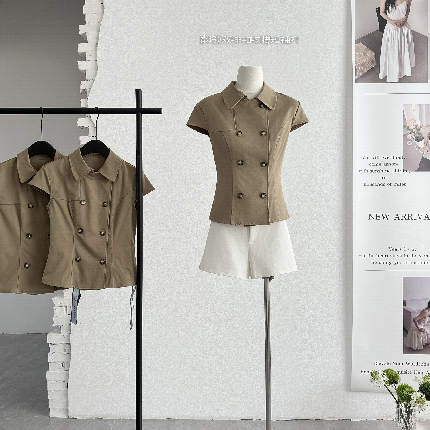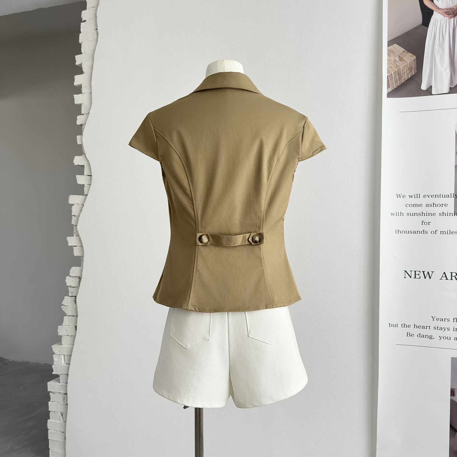 call a day 카키 색 화이트 폴로 칼라 이중 버튼 허리 수축 반팔 여성 셔츠 긍정적 인 어깨 슬림해 보이는 셔츠