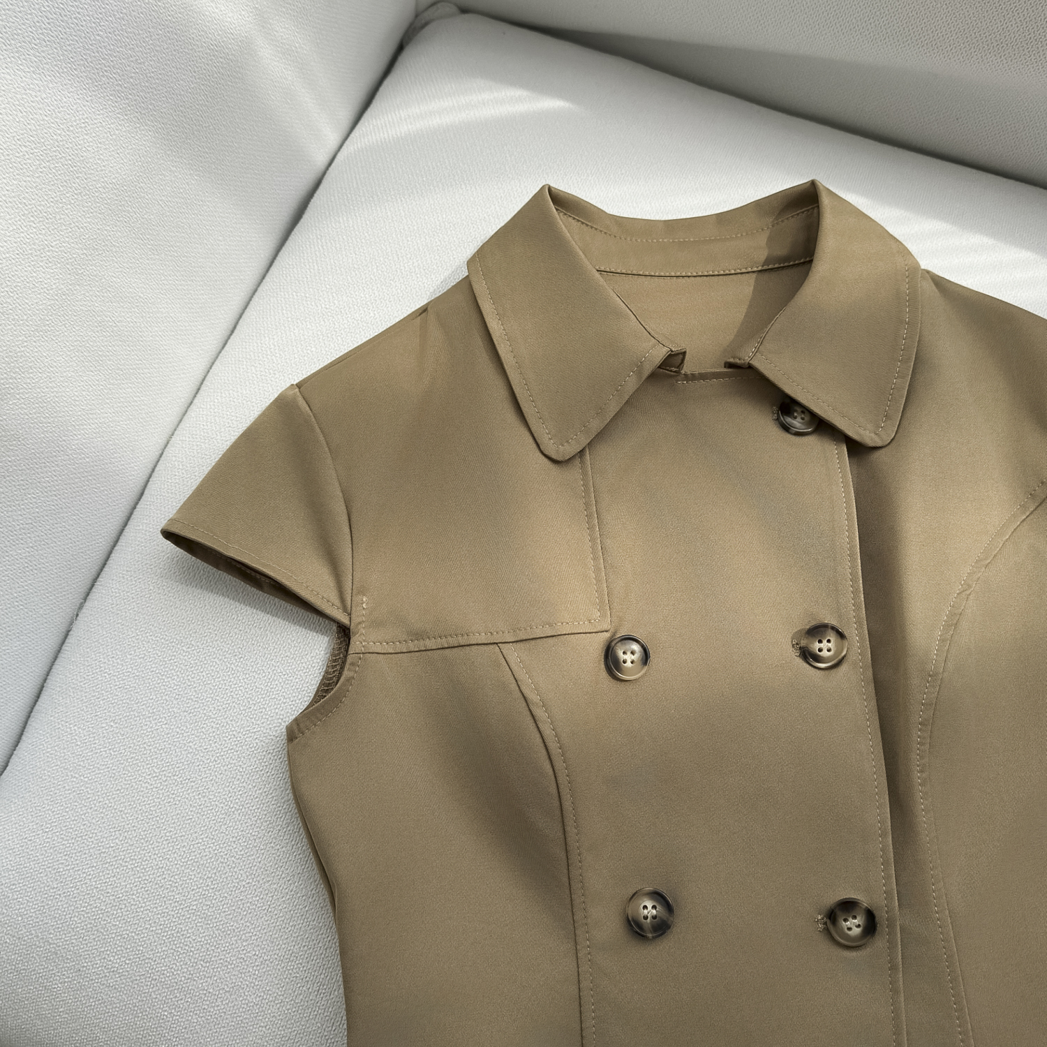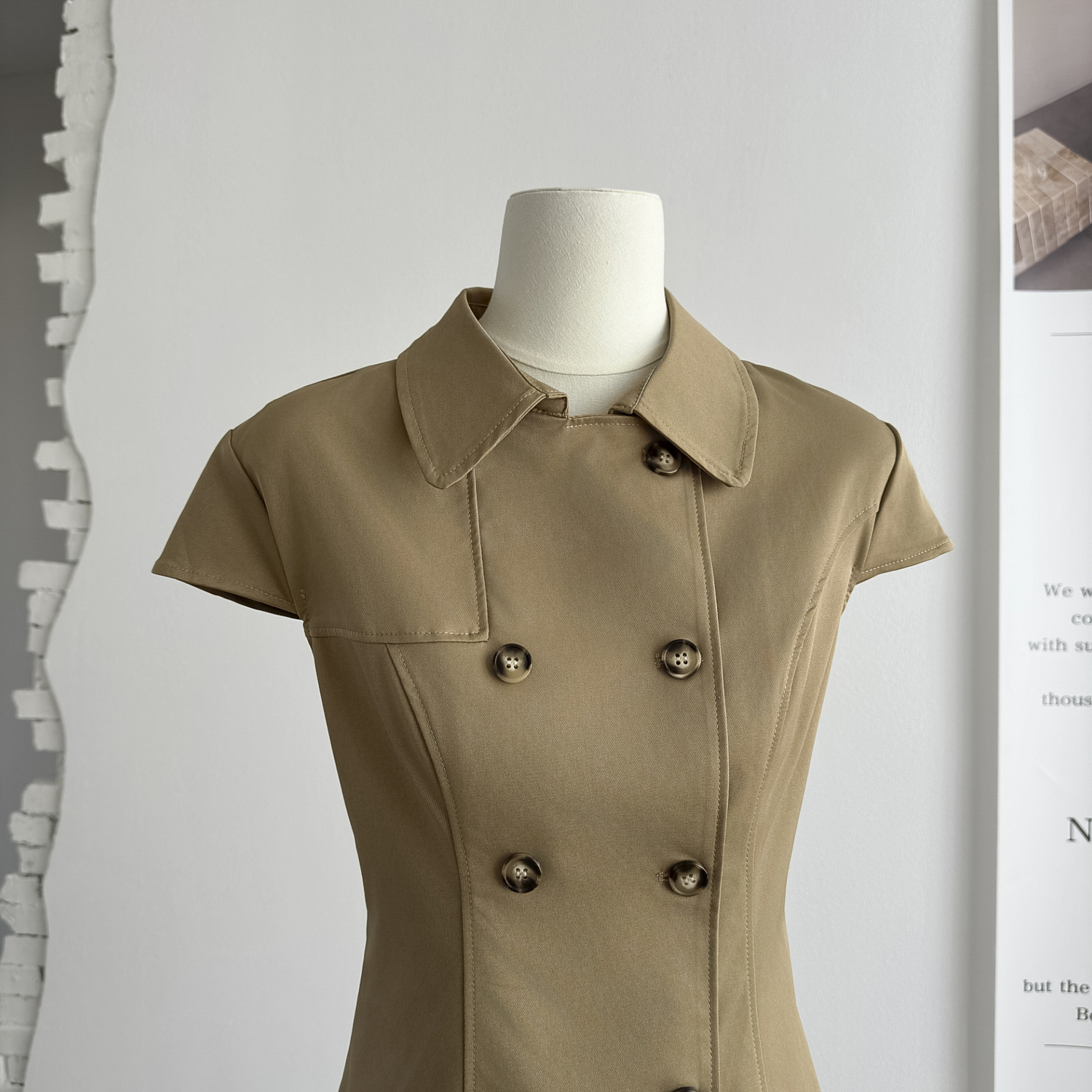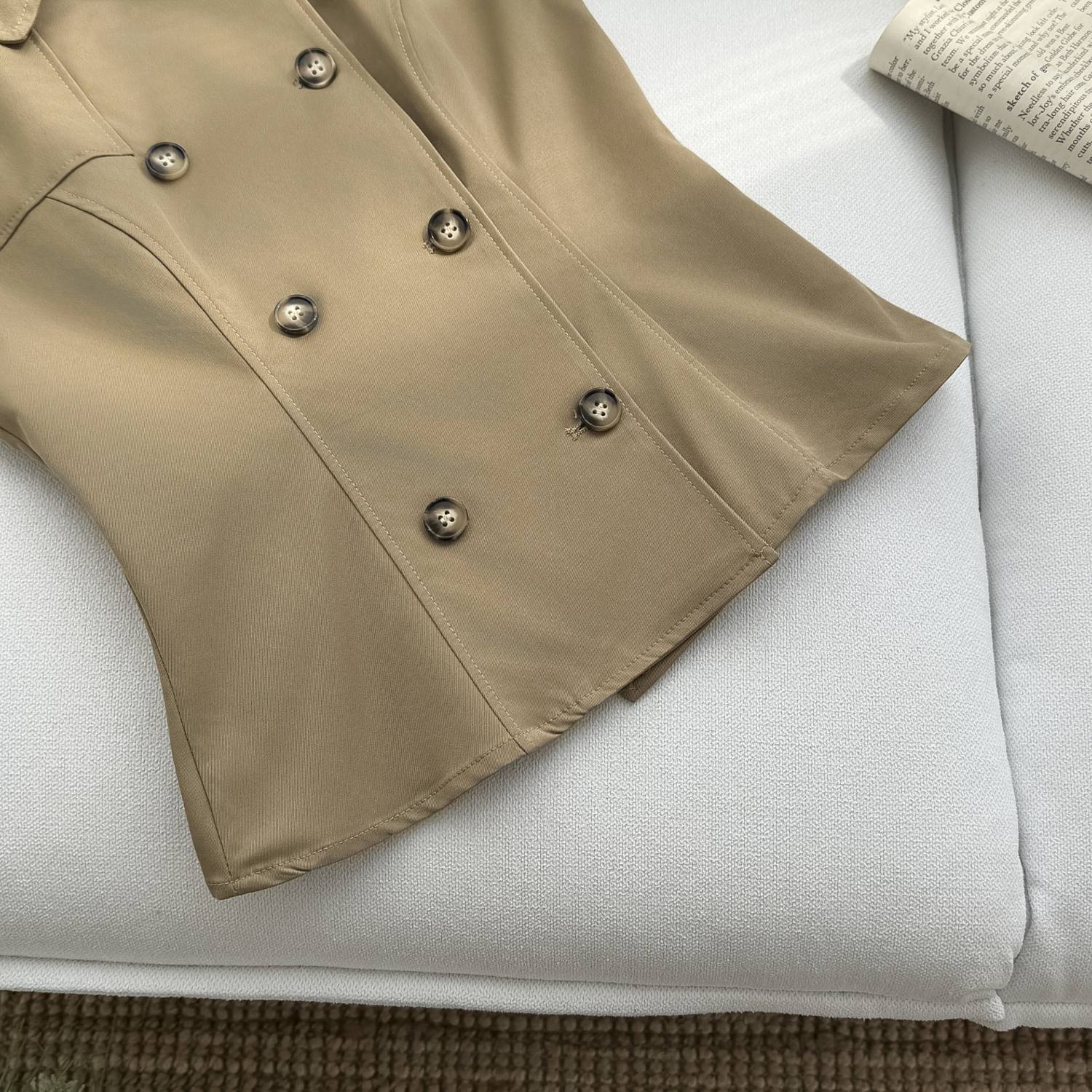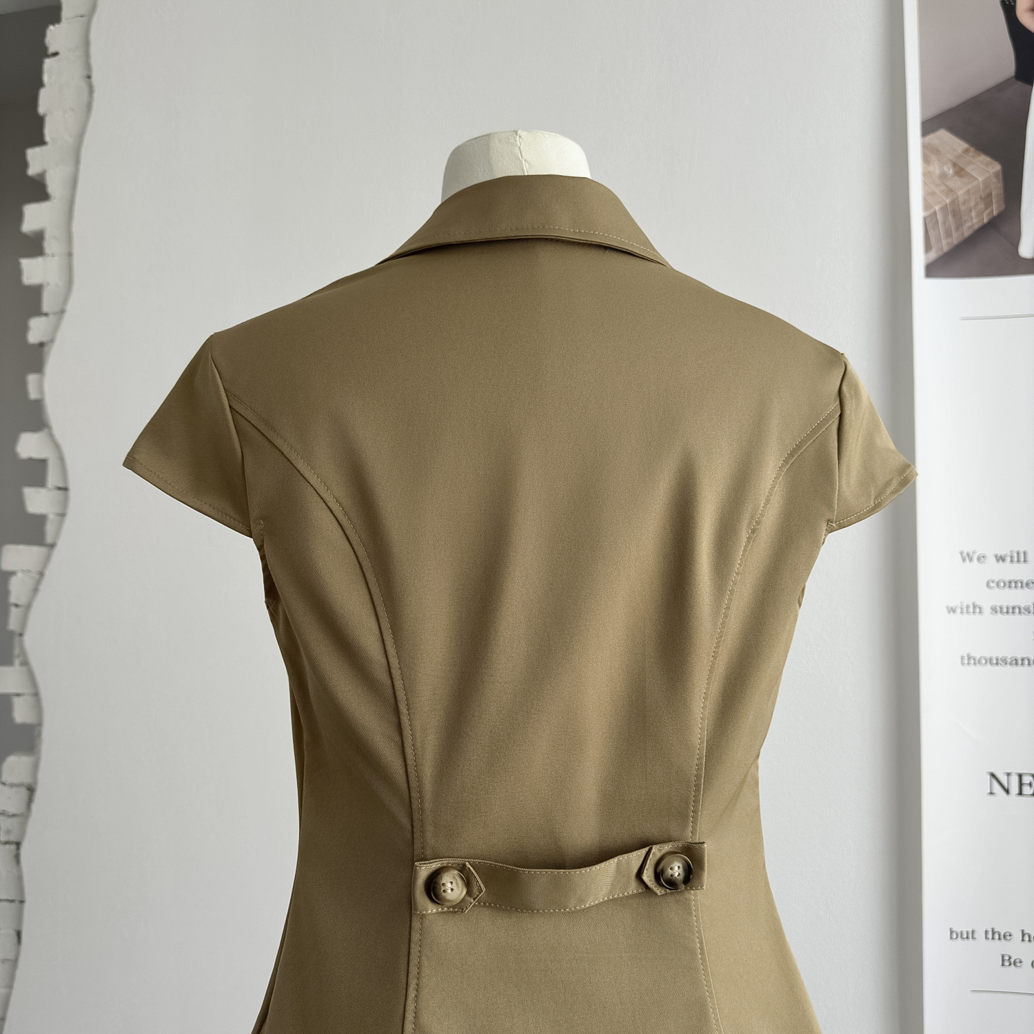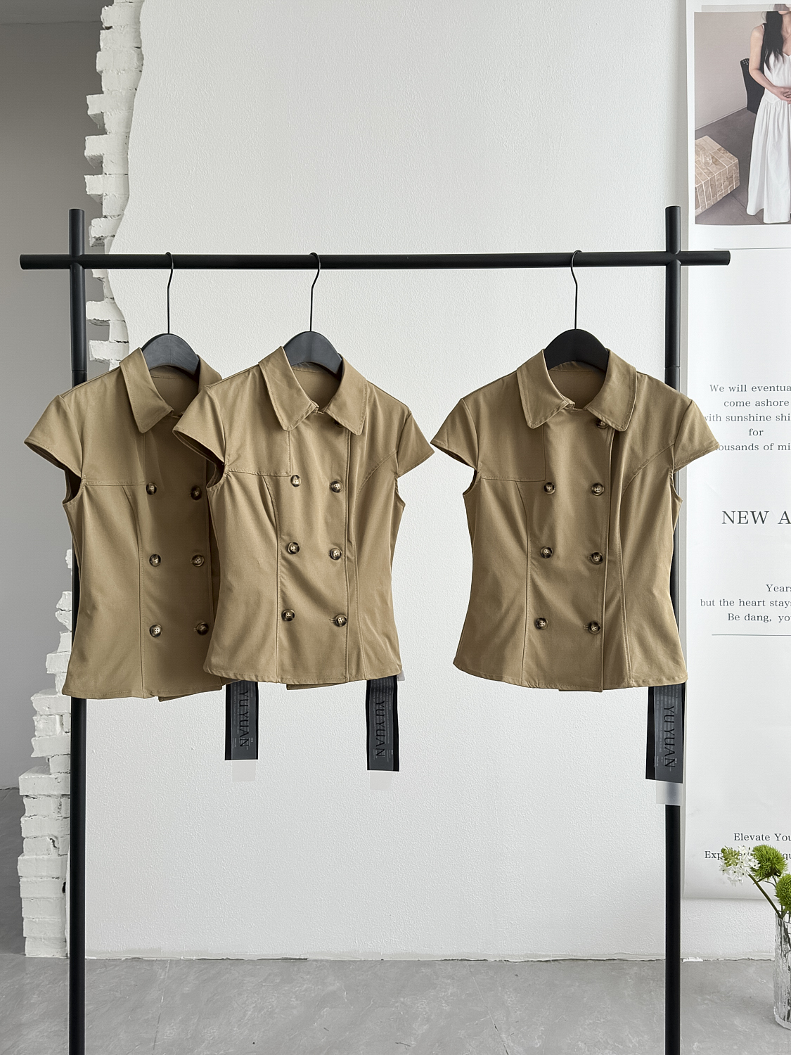 call a day 카키 색 화이트 폴로 칼라 이중 버튼 허리 수축 반팔 여성 셔츠 긍정적 인 어깨 슬림해 보이는 셔츠