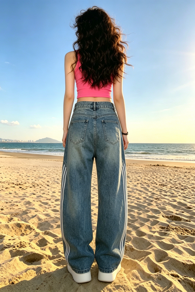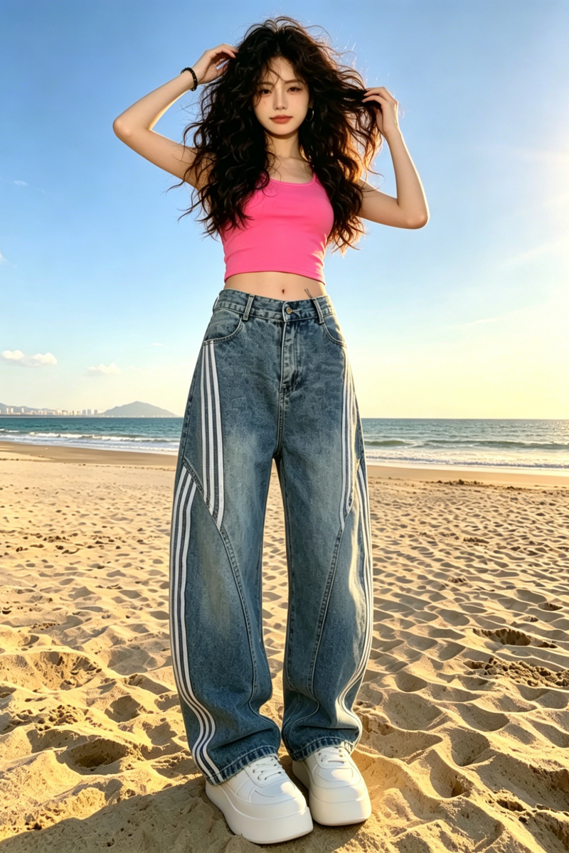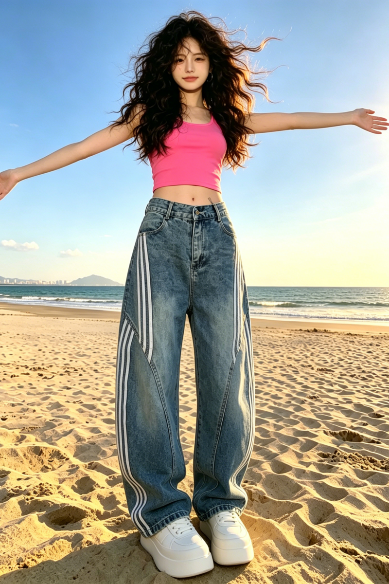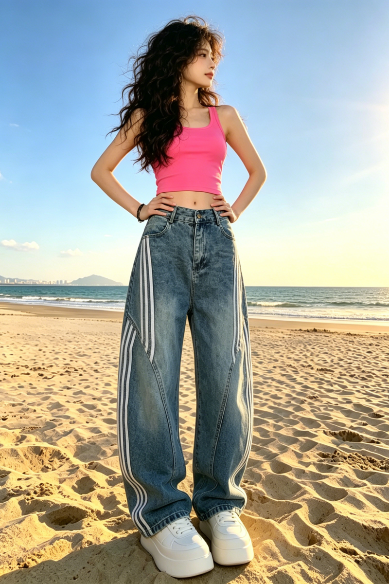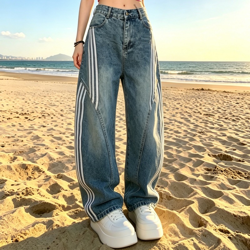 아메리칸 레트로 워싱 해체 모통이 칼 청바지 여성 2026 봄 여름 3개 바 스트라이프 바지 패치워크 와이드 레그 팬츠