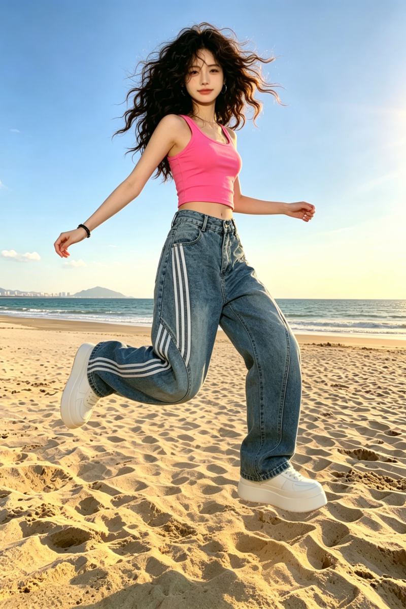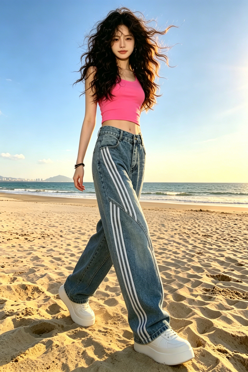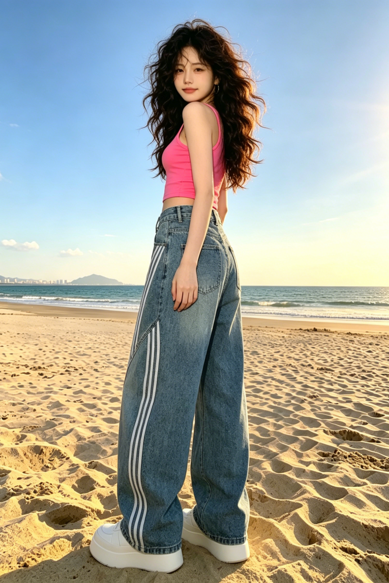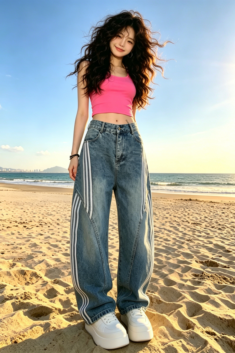 아메리칸 레트로 워싱 해체 모통이 칼 청바지 여성 2026 봄 여름 3개 바 스트라이프 바지 패치워크 와이드 레그 팬츠