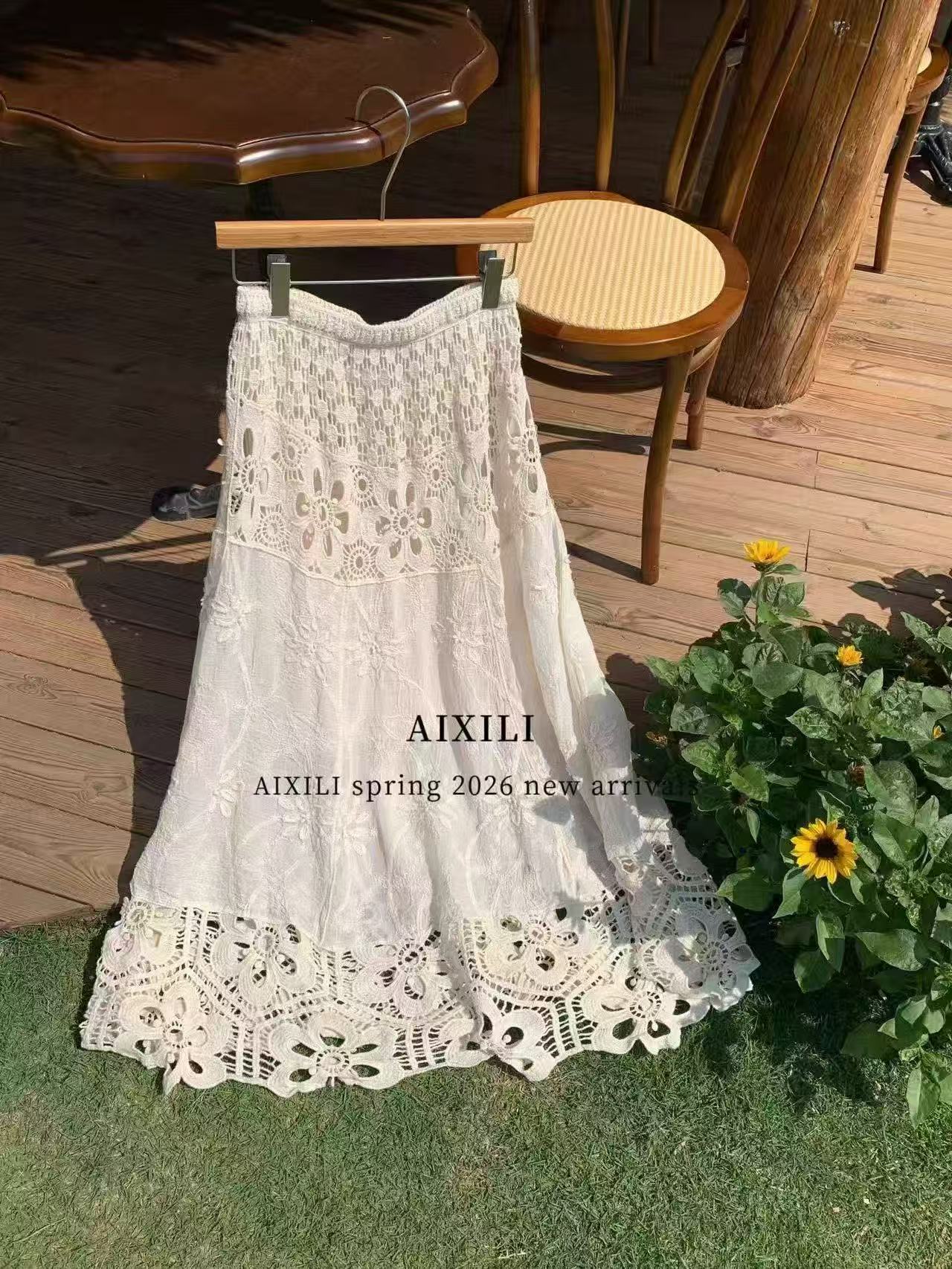 사랑 시리 2026 여름 새로운 낭만주의 분위기 무거운 작업 홀로우 아웃 꽃 자수 반신 스커트 여성 슬림해 보이는 하이웨이스트 롱 스커트