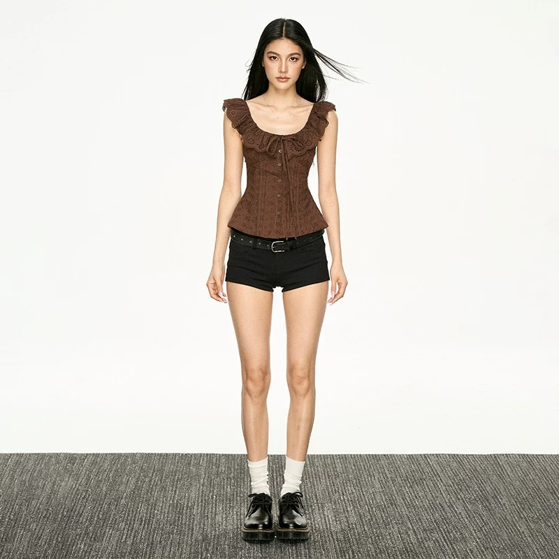 아메리칸 레트로 프릴 셔츠 레이스업 티셔츠 여성 여름 홀로우 아웃 레이스 몸매 가꾸기 허리 수축 짧은 맨위