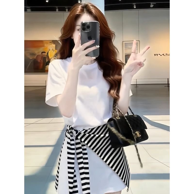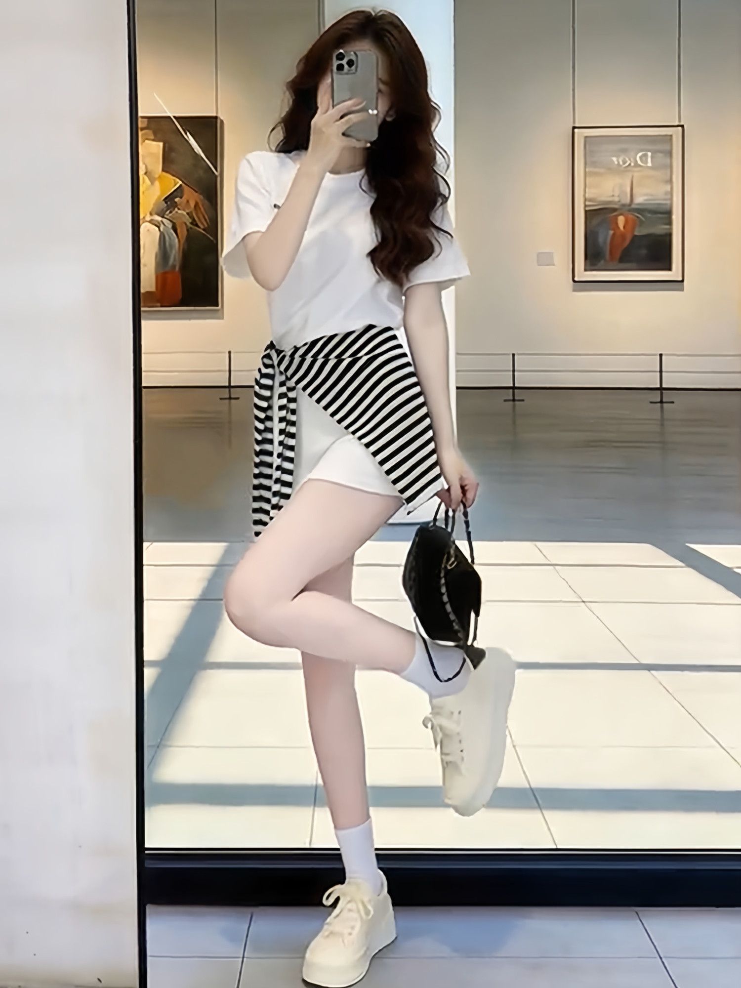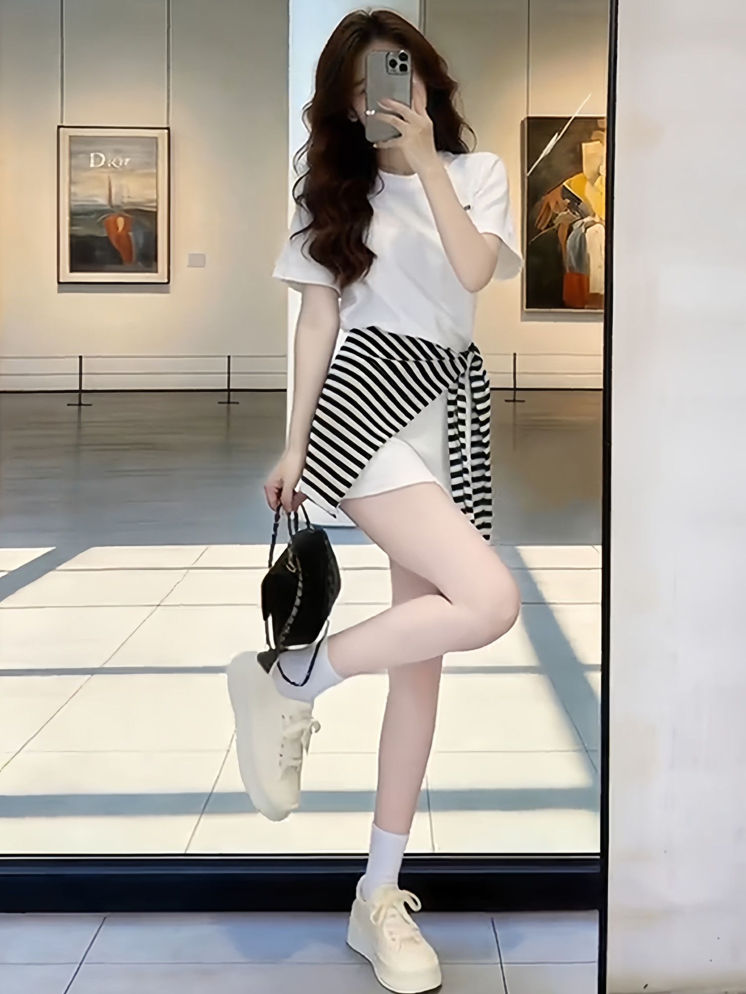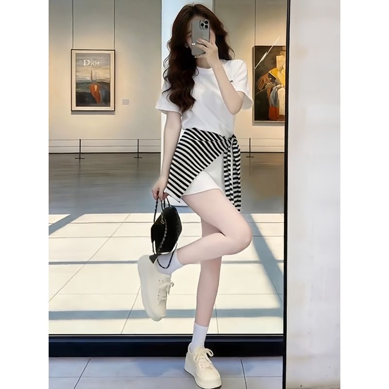 여름 운동 패션 세트 여성 느긋한 바람 스트라이프 숄 루즈핏 반팔 티셔츠 하이웨이스트 짧은 치마바지 3종 세트
