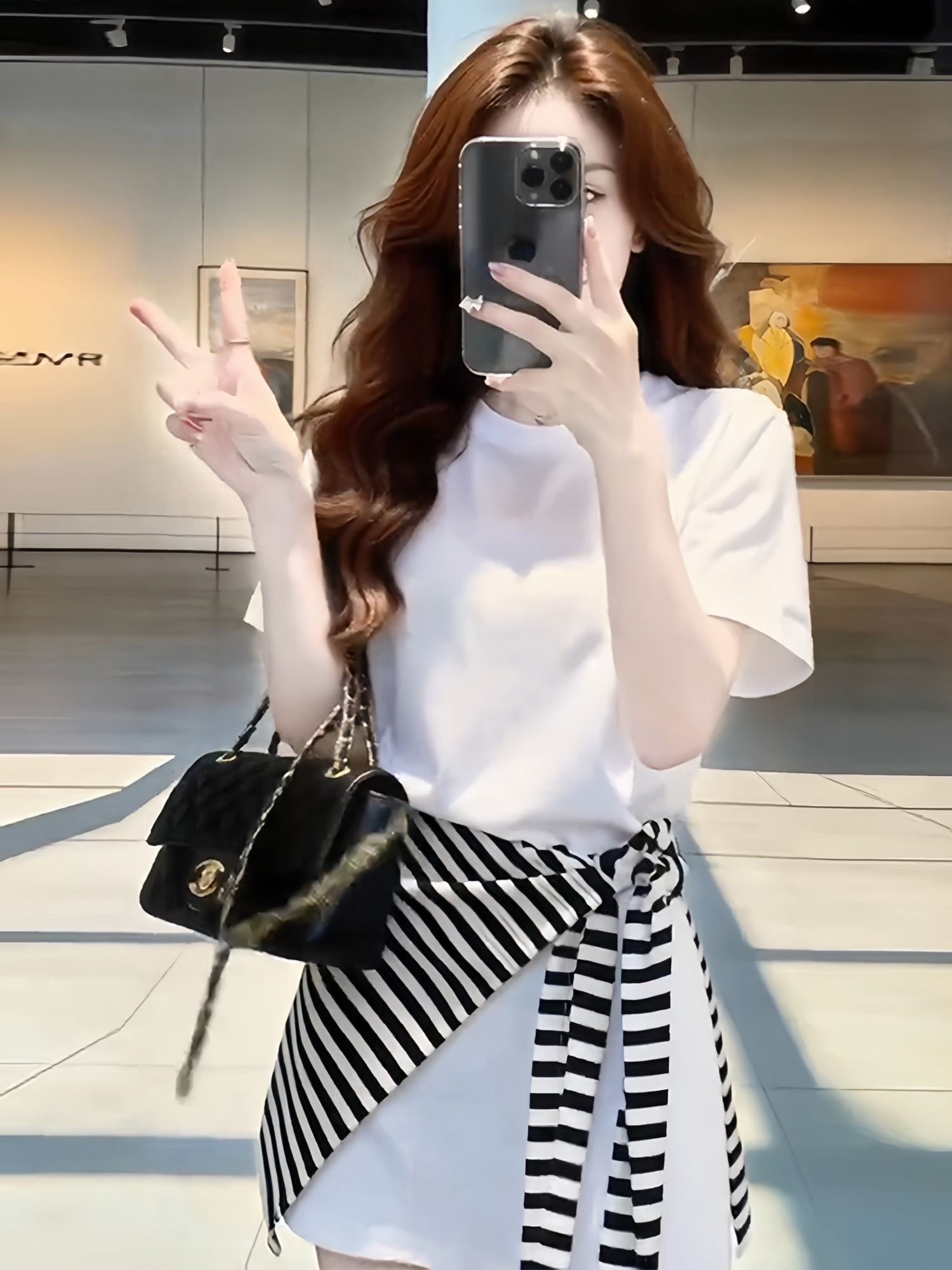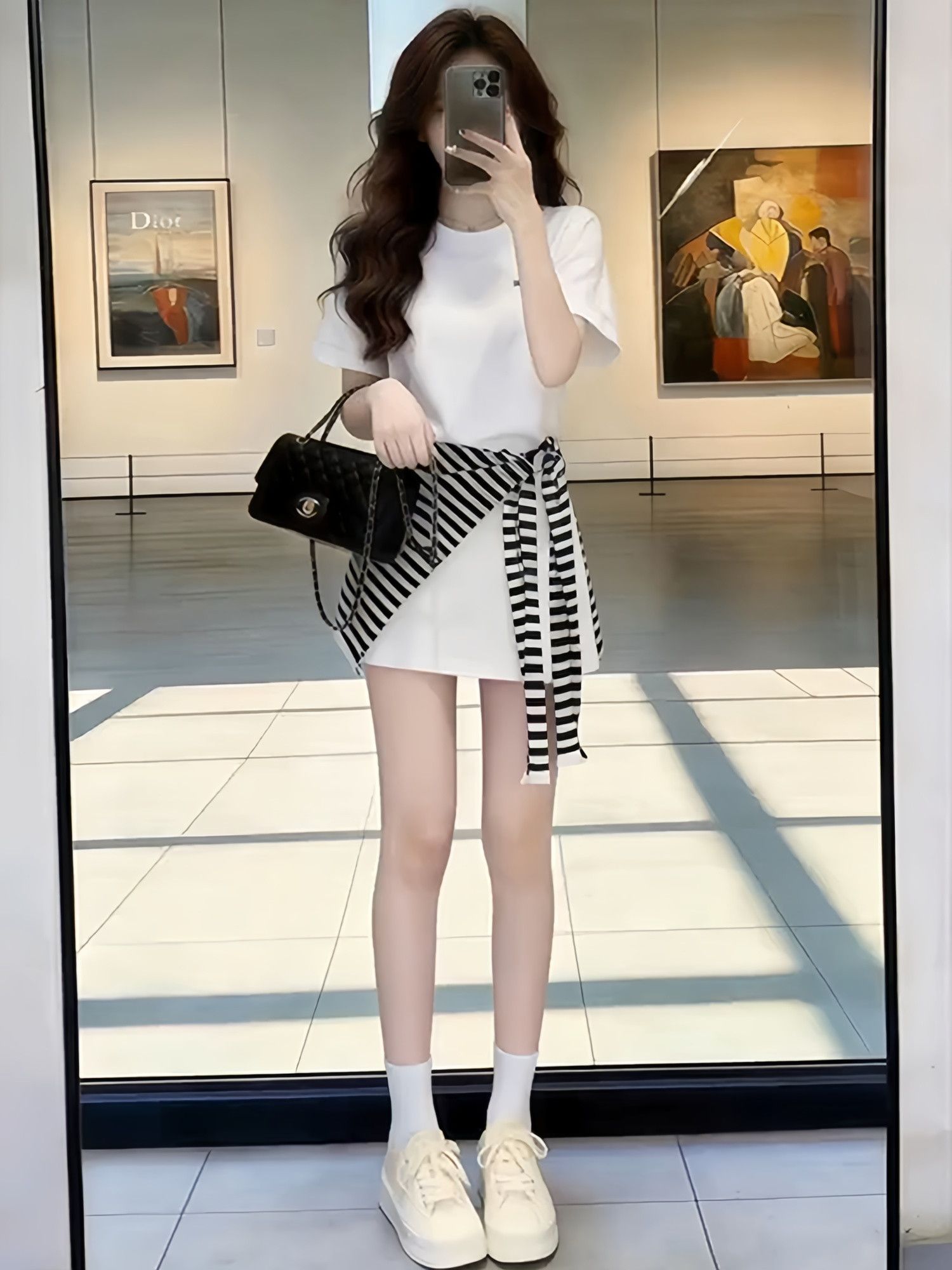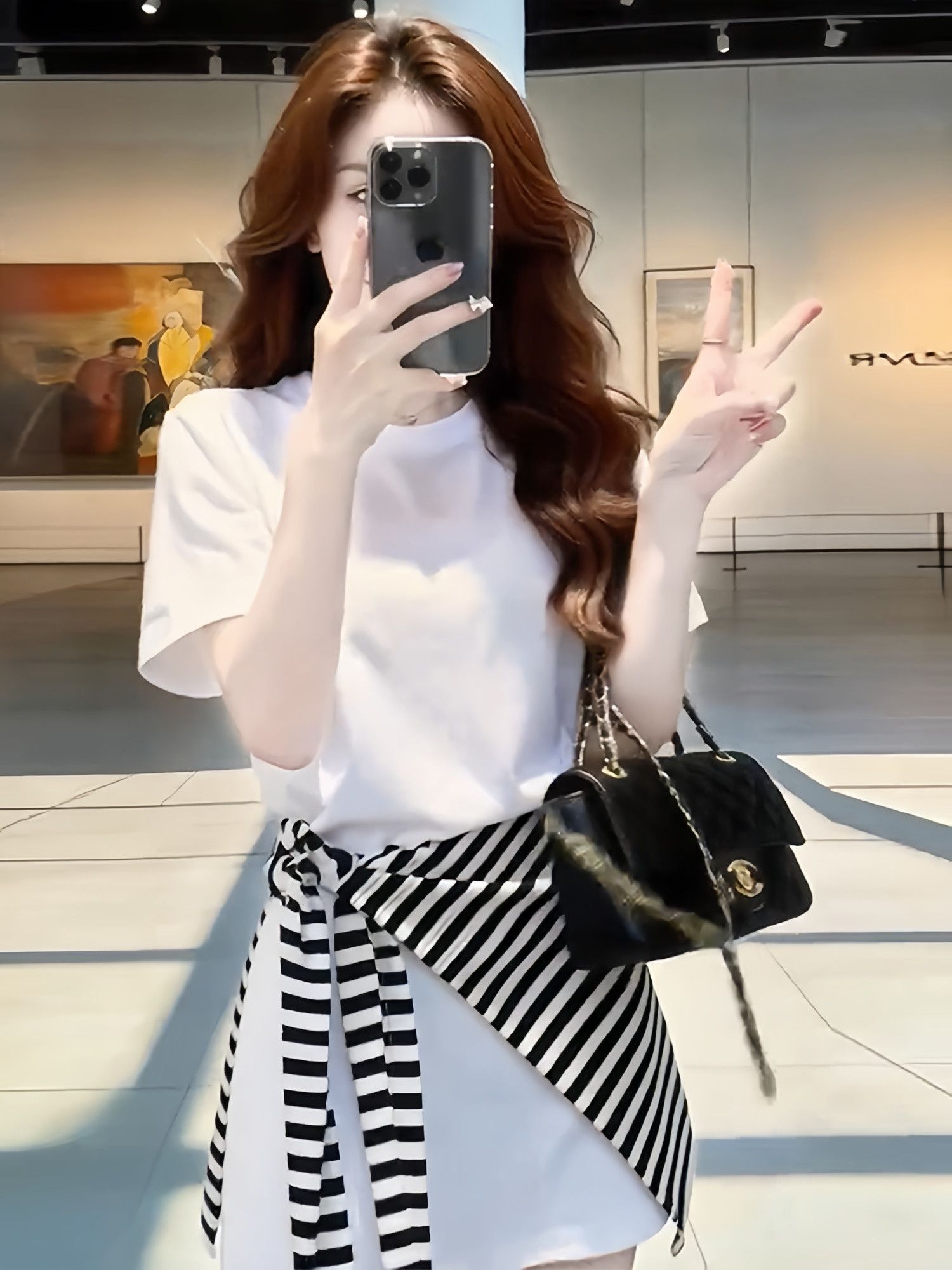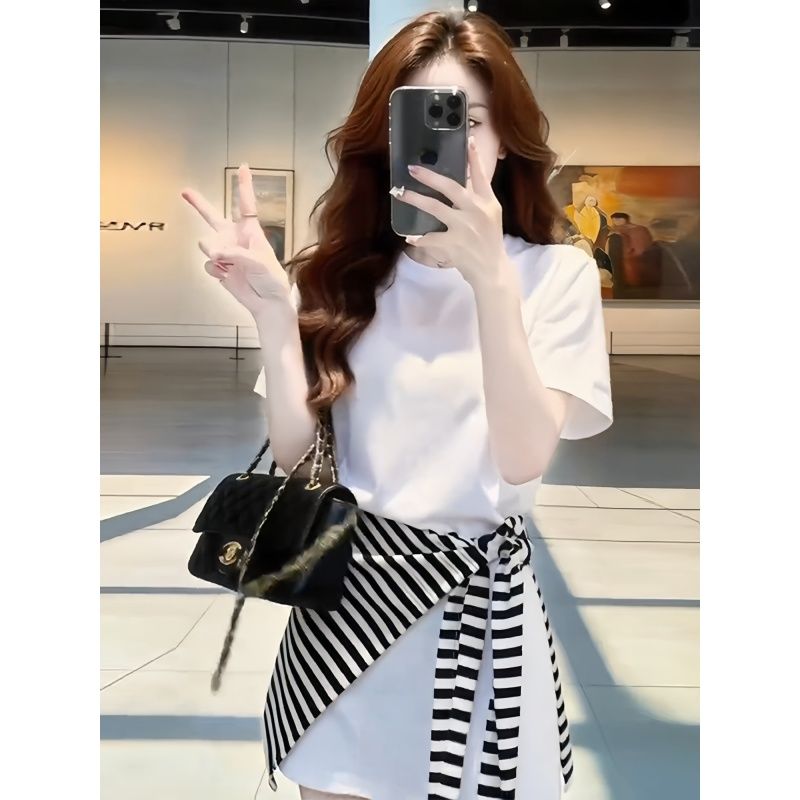 여름 운동 패션 세트 여성 느긋한 바람 스트라이프 숄 루즈핏 반팔 티셔츠 하이웨이스트 짧은 치마바지 3종 세트
