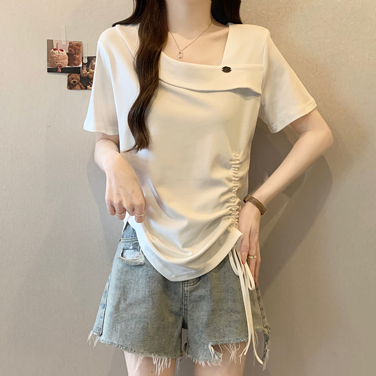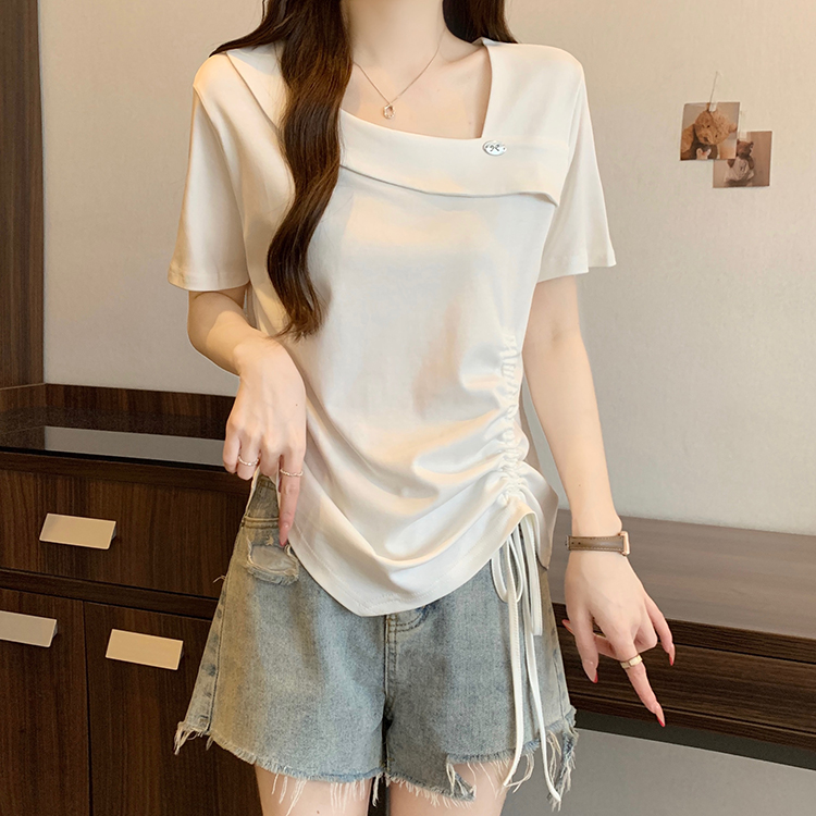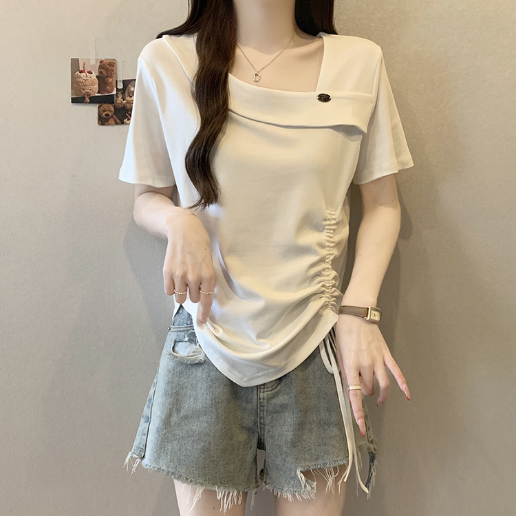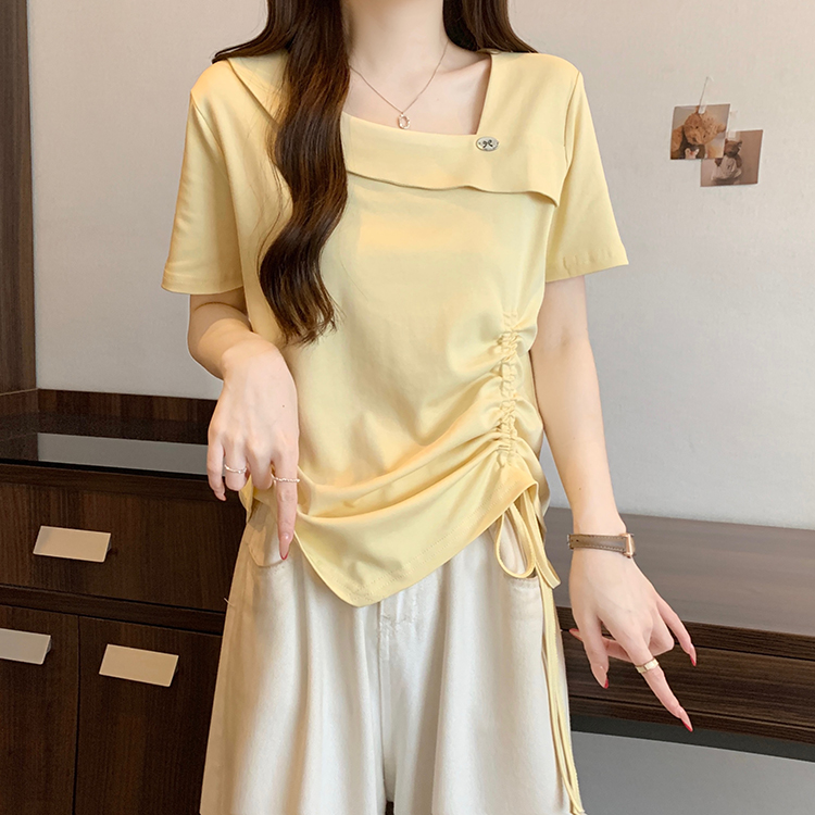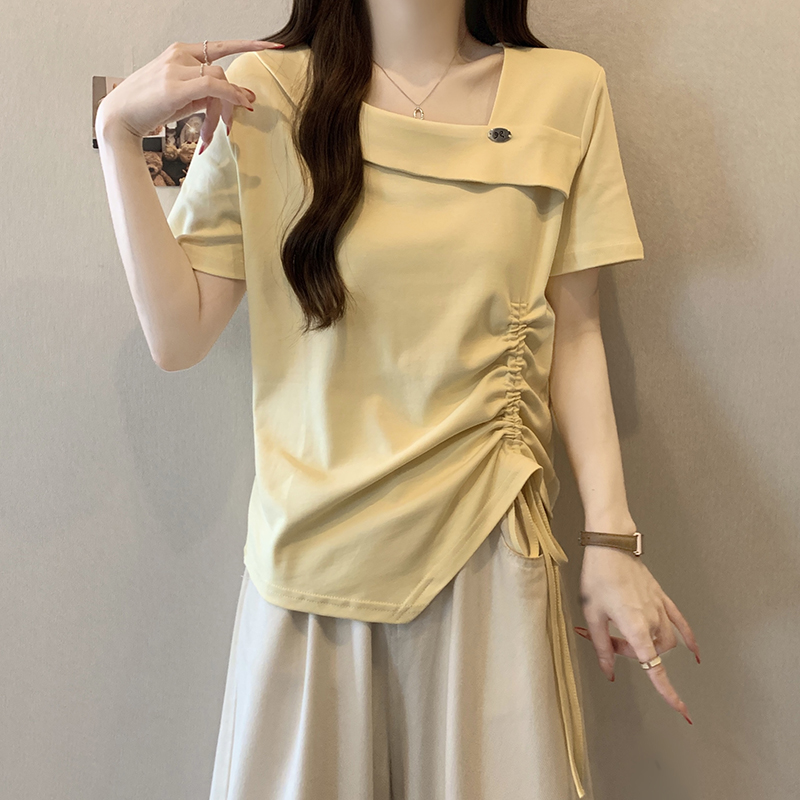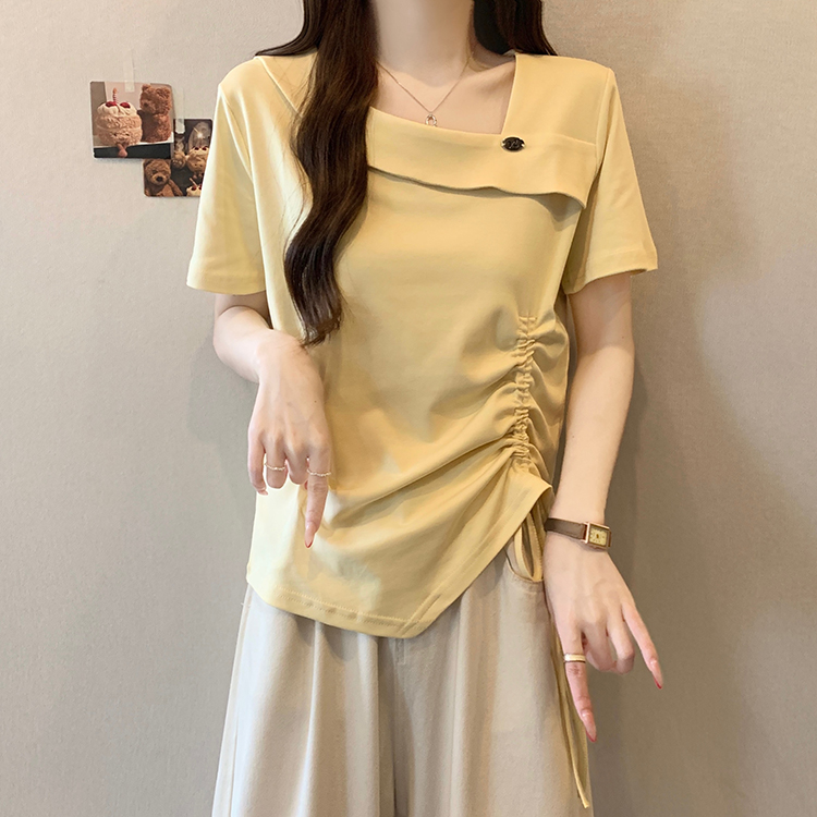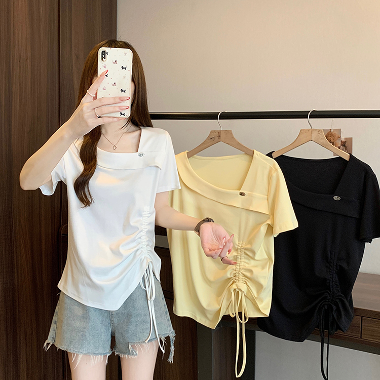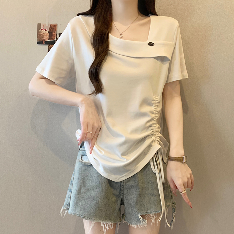 실사 2026 여름 드레스 새로운 지방 mm 빅 사이즈 여성 달콤함 캐주얼 비스듬한 칼라 펌프 로프 불규칙 반팔 티셔츠