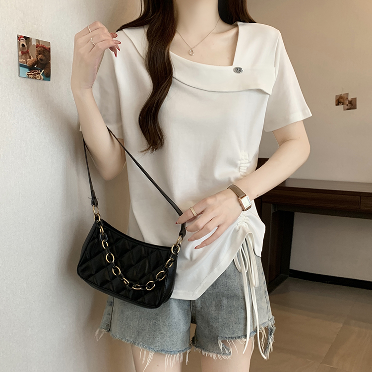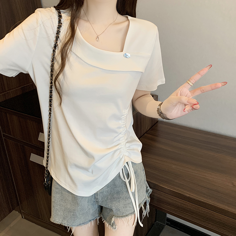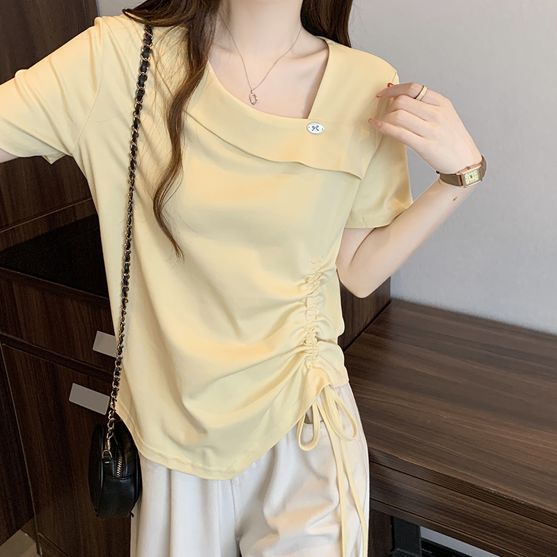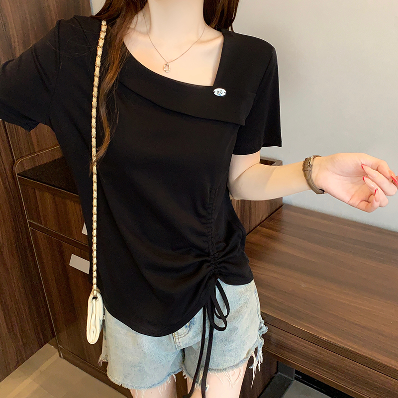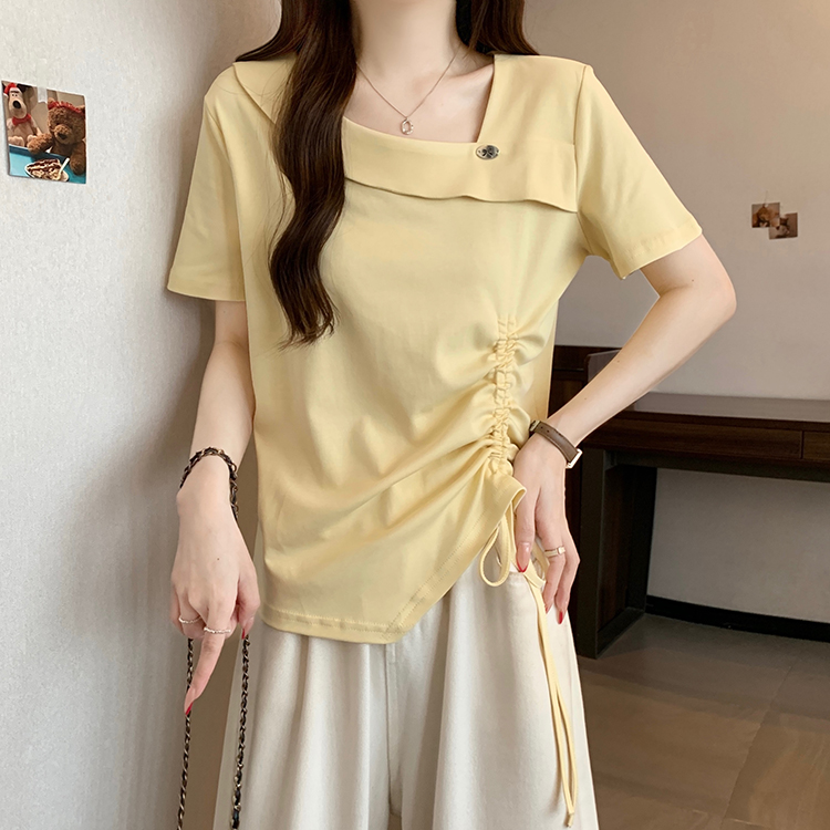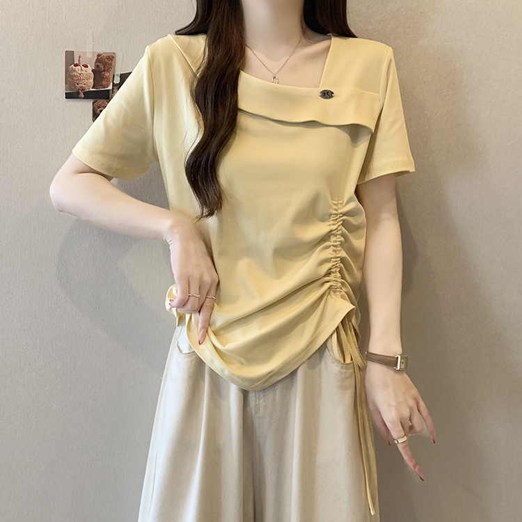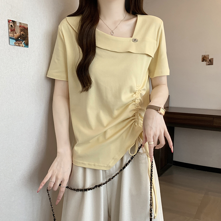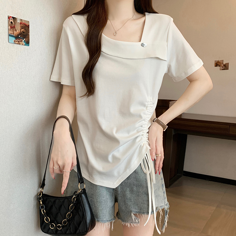 실사 2026 여름 드레스 새로운 지방 mm 빅 사이즈 여성 달콤함 캐주얼 비스듬한 칼라 펌프 로프 불규칙 반팔 티셔츠