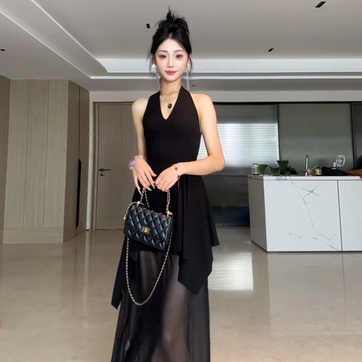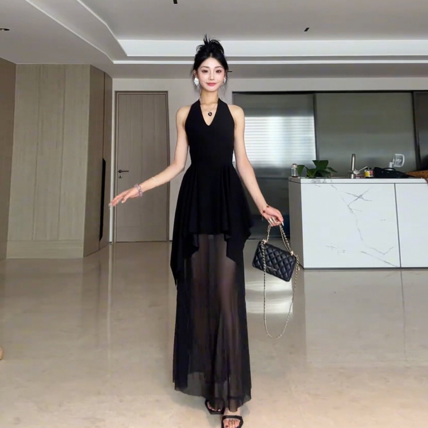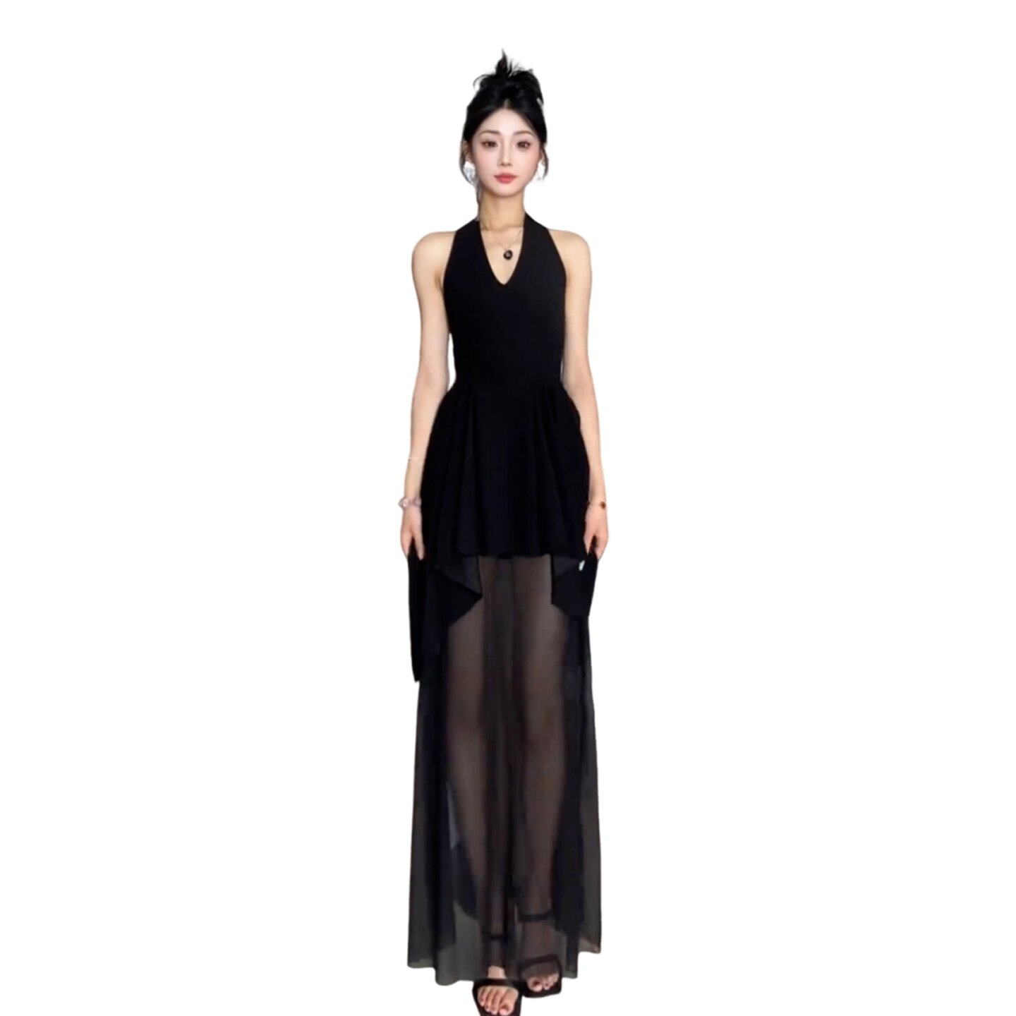 프랑스식 검정색 V넥 행침 목 백리스 드레스 아이들 여름 2026 새로운 불규칙 꼬집기 허리 패치워크 롱 스커트