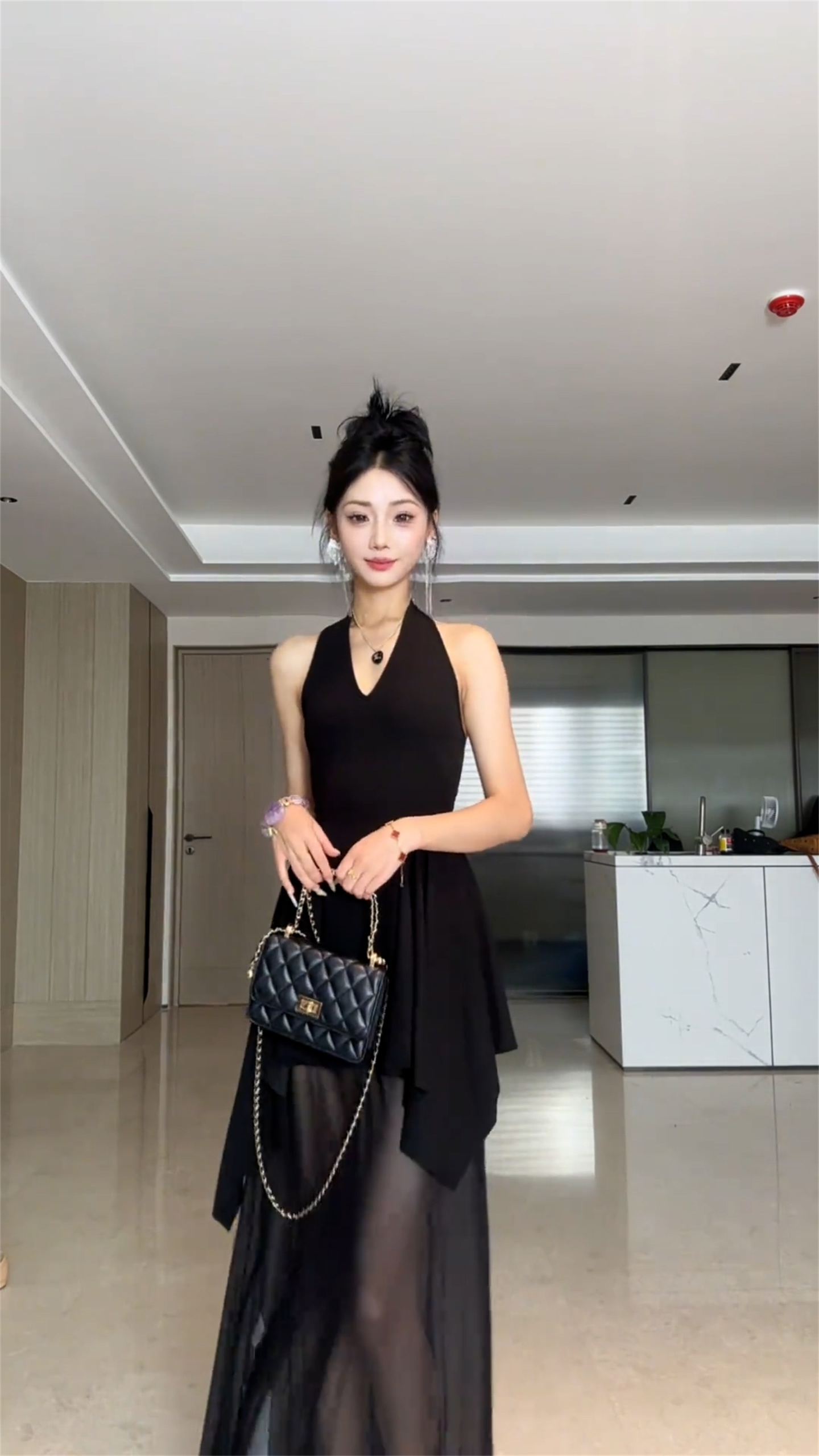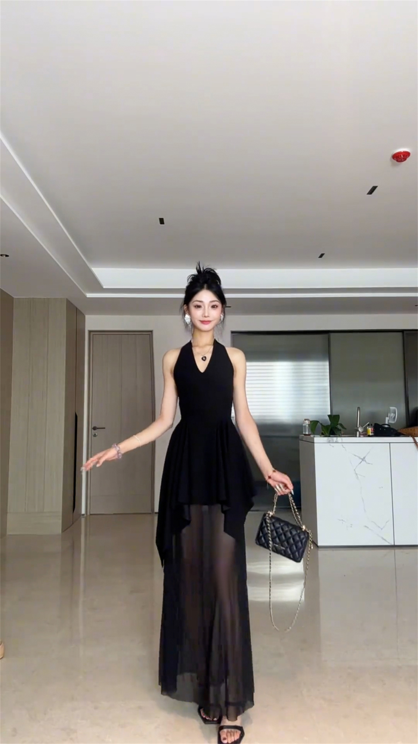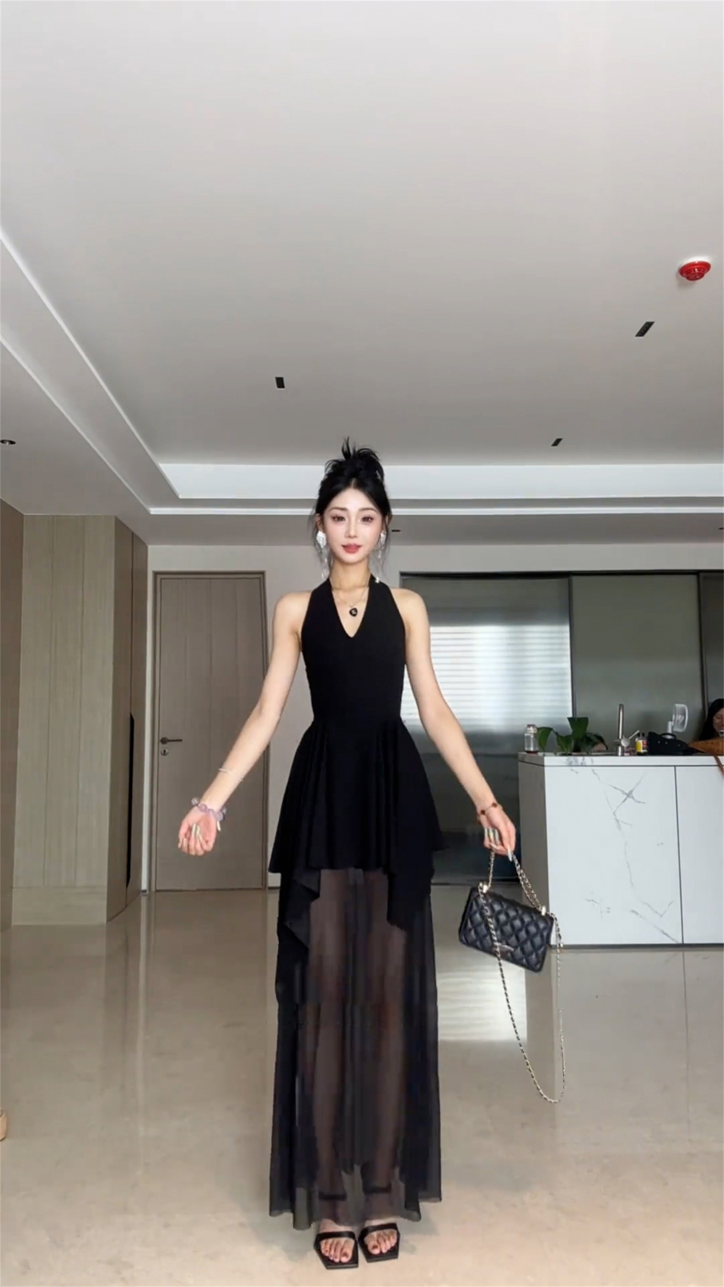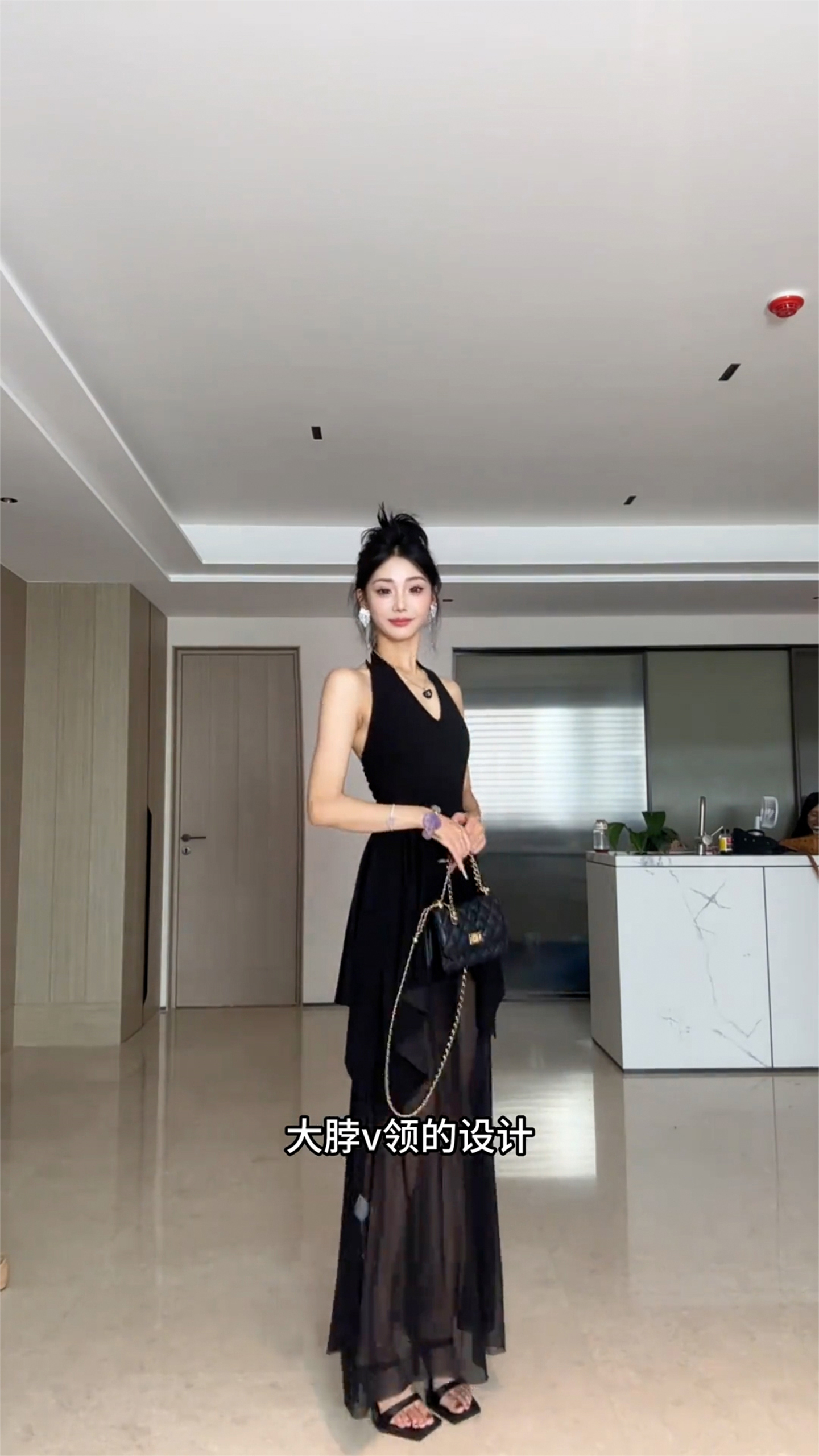 프랑스식 검정색 V넥 행침 목 백리스 드레스 아이들 여름 2026 새로운 불규칙 꼬집기 허리 패치워크 롱 스커트