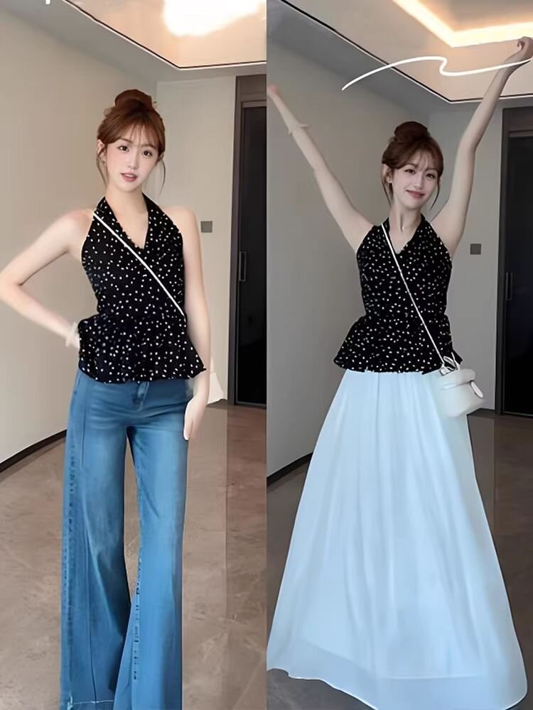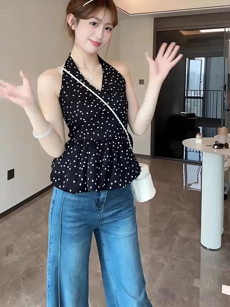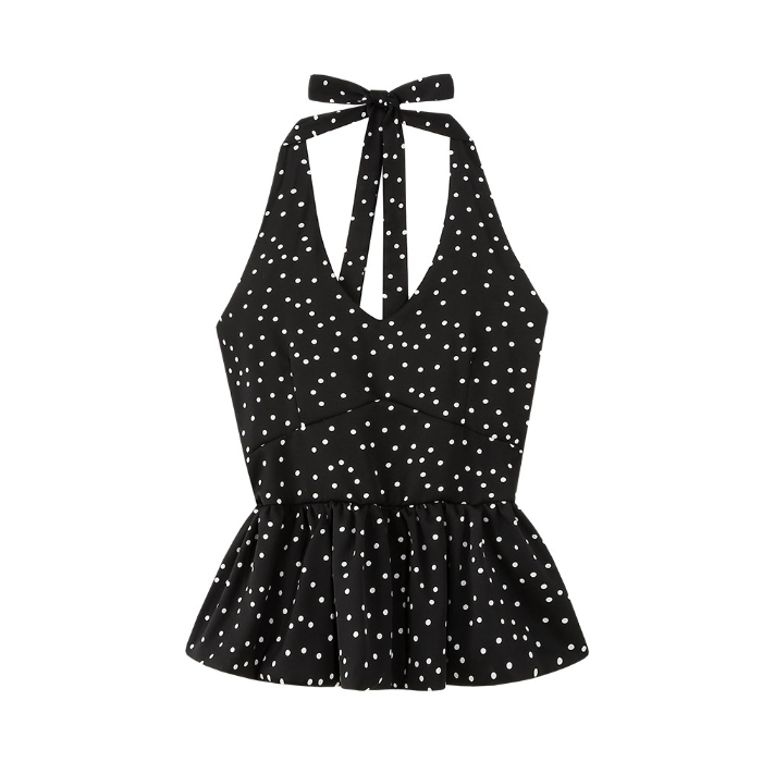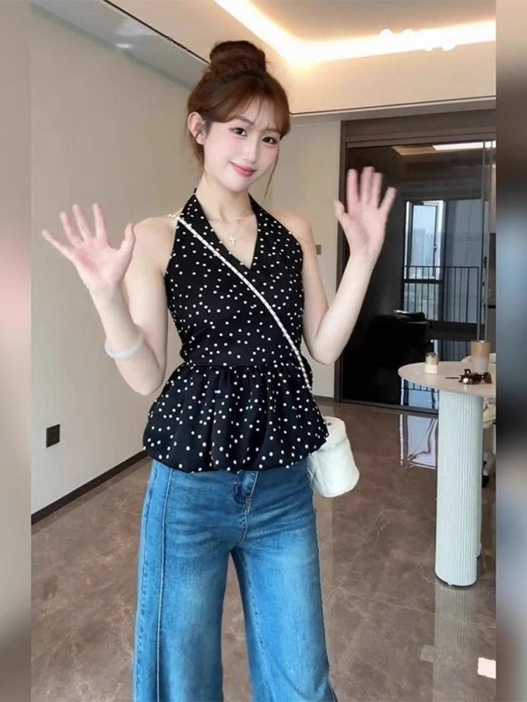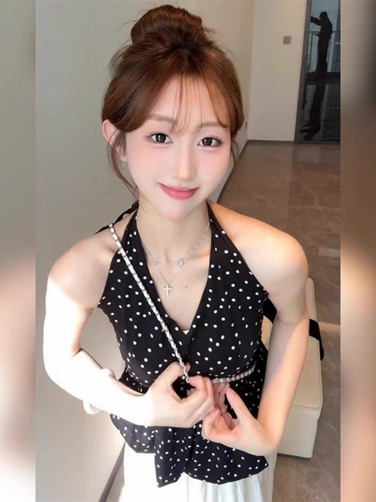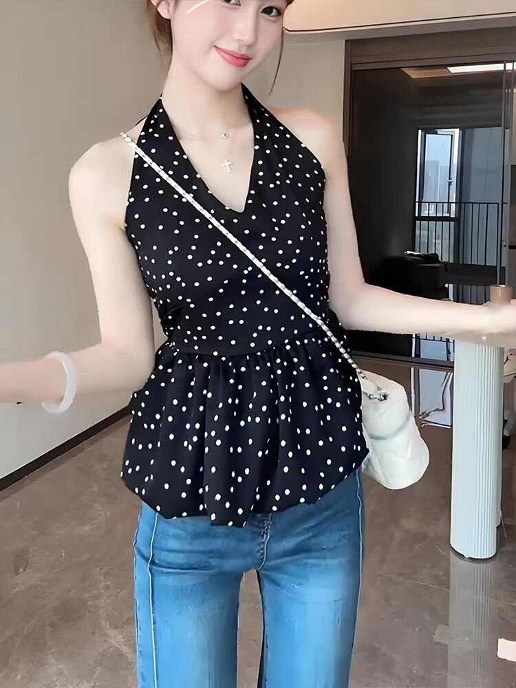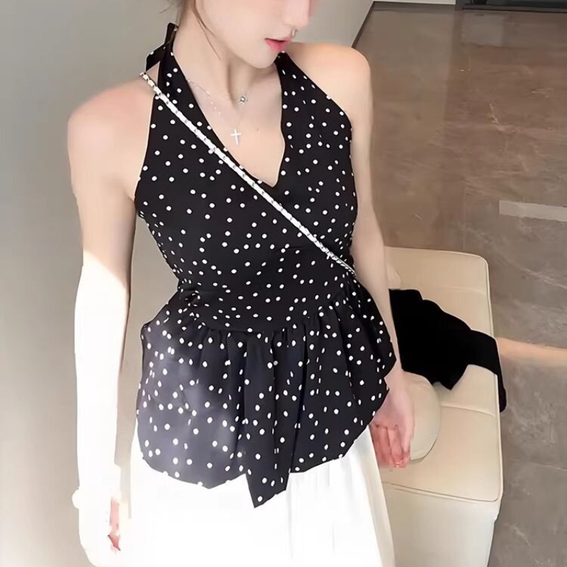 도트 무늬 쉬폰 불규칙 캐미솔 외출용 여름 아름다움 뒤로 인사이드 가져 가라. 섹시함 행침 목 백리스 민소매 맨위