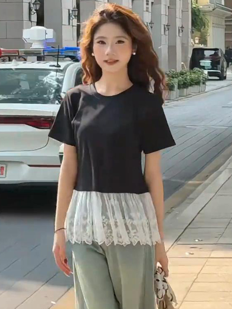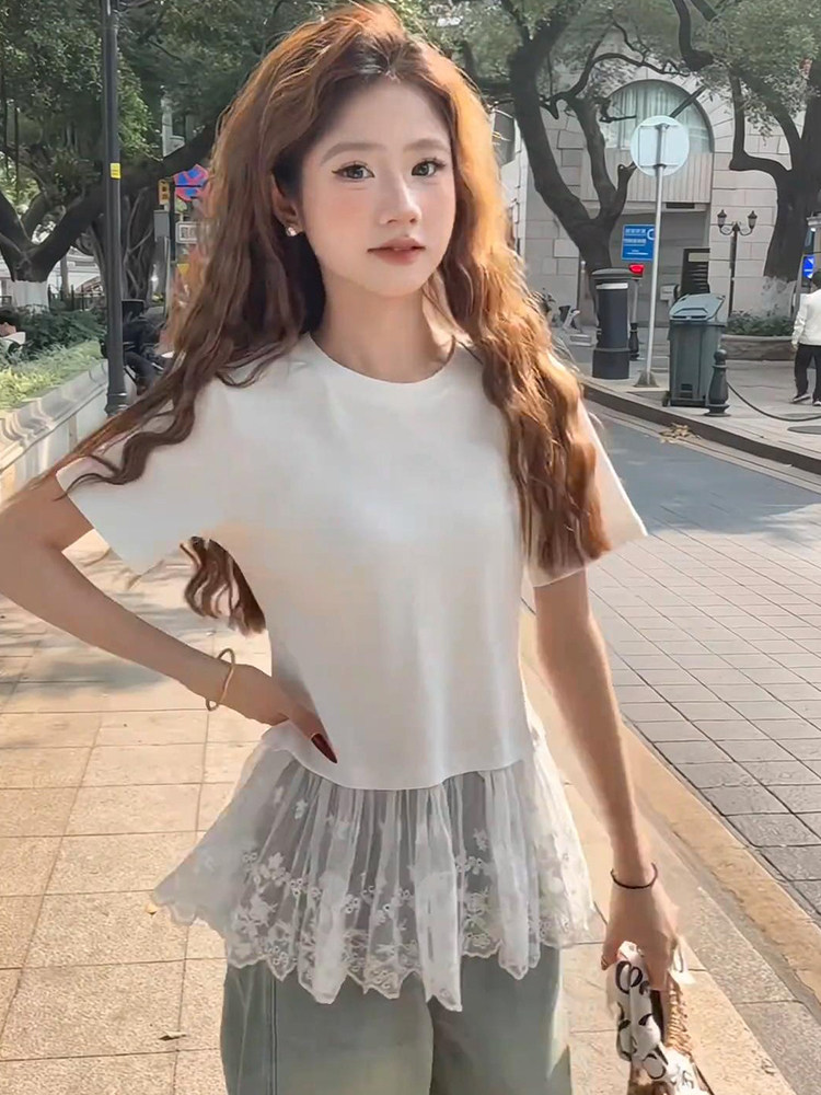 광장 칼라 레이스 조각 긍정적 인 어깨 반팔 티셔츠 여성 여름 몸매 가꾸기 타이트 허리 수축 쇼트 스타일 불규칙 패션 맨위