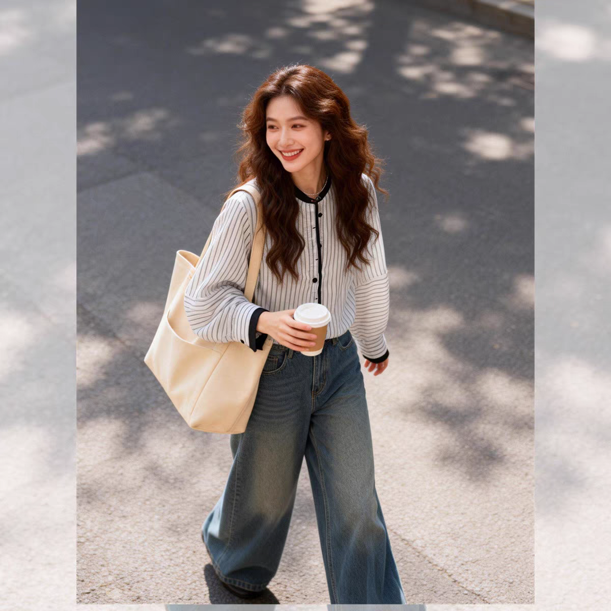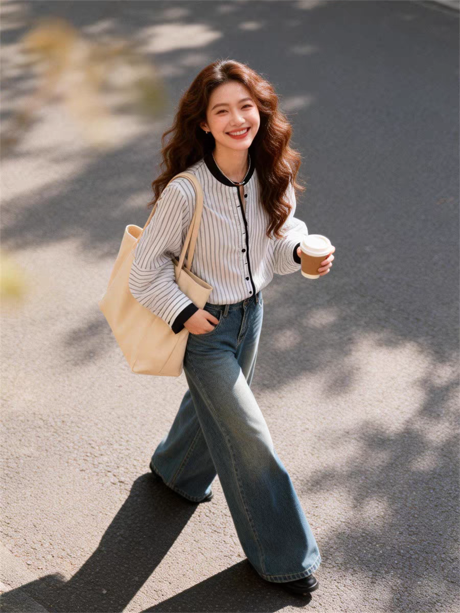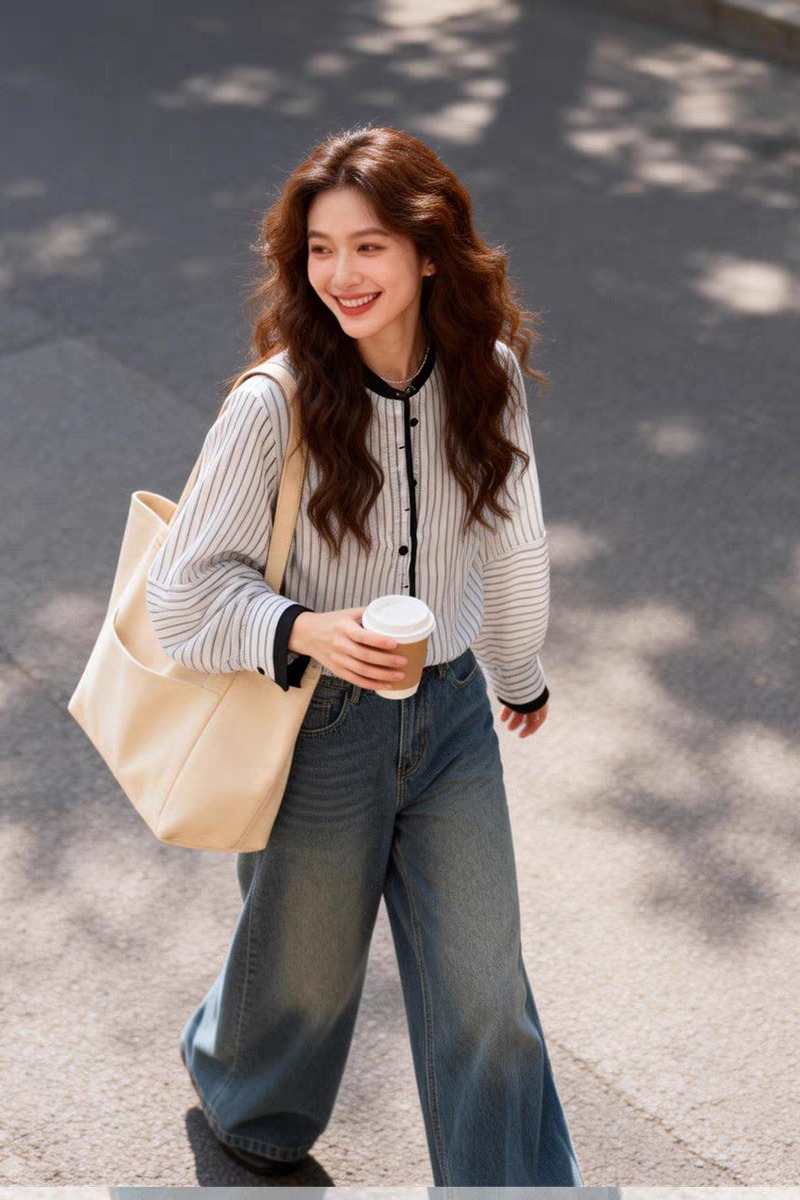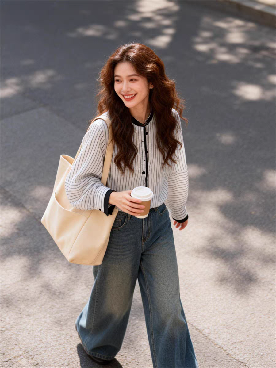 여름 드레스 새로운 빅 사이즈 스트라이프 셔츠 디자인 센스 작은 대중 맨위 남자 친구 바람 루즈핏 긴팔 셔츠 오픈 가디건