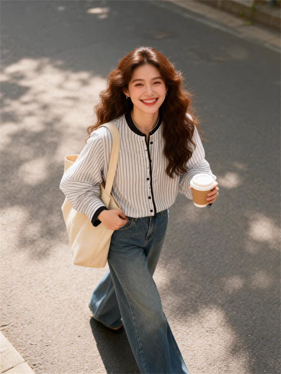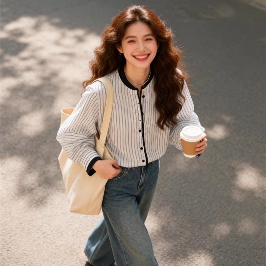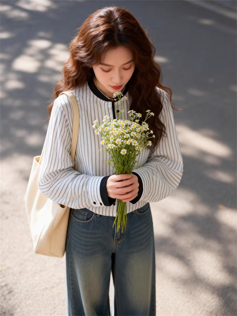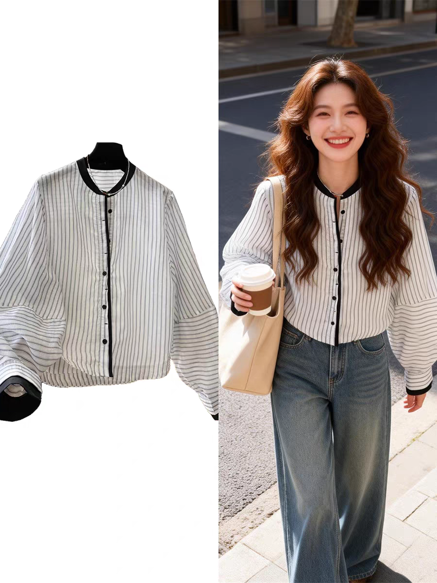 여름 드레스 새로운 고유 한 슈퍼 잘 생긴 맨위 라운드 넥 랜턴 긴팔 스트라이프 셔츠 고급 센스 한 부서 품격 작은 셔츠