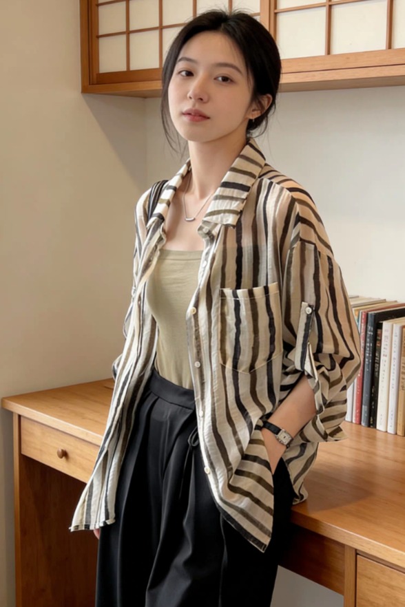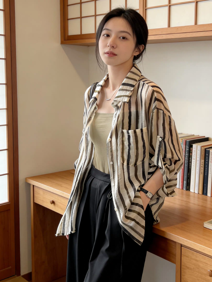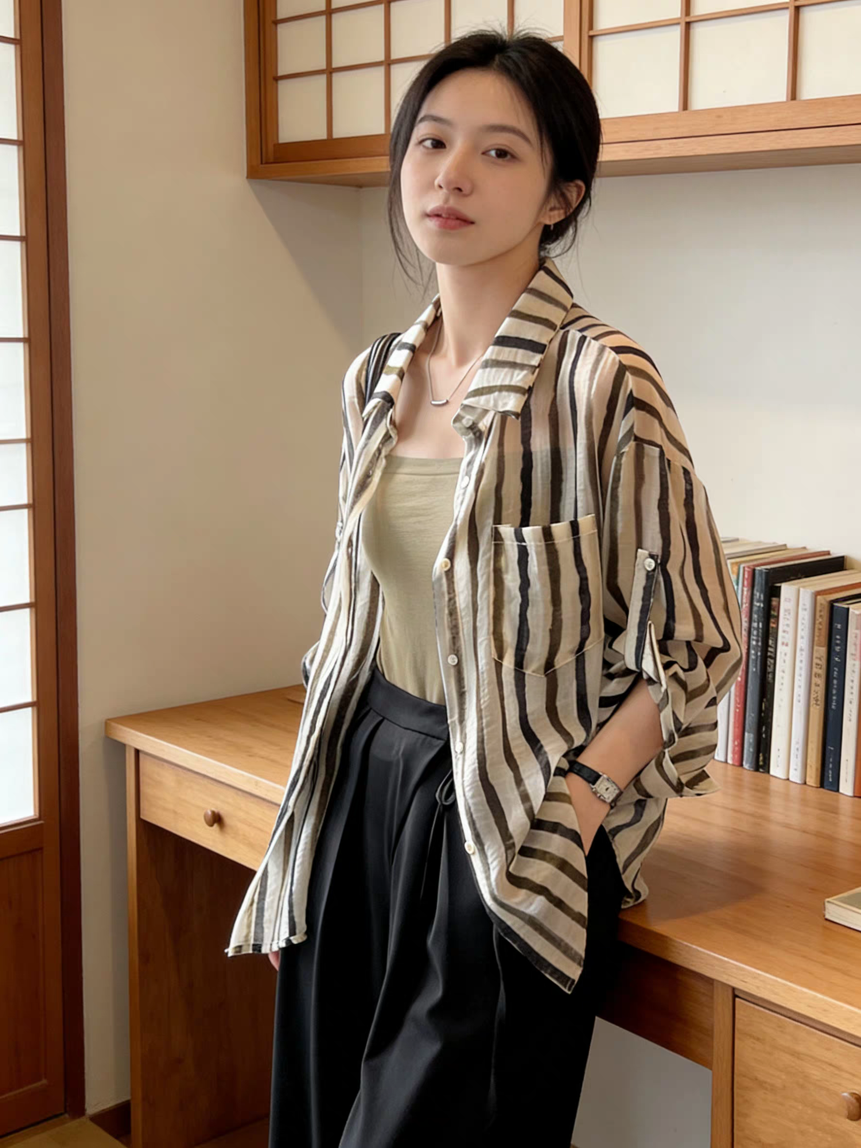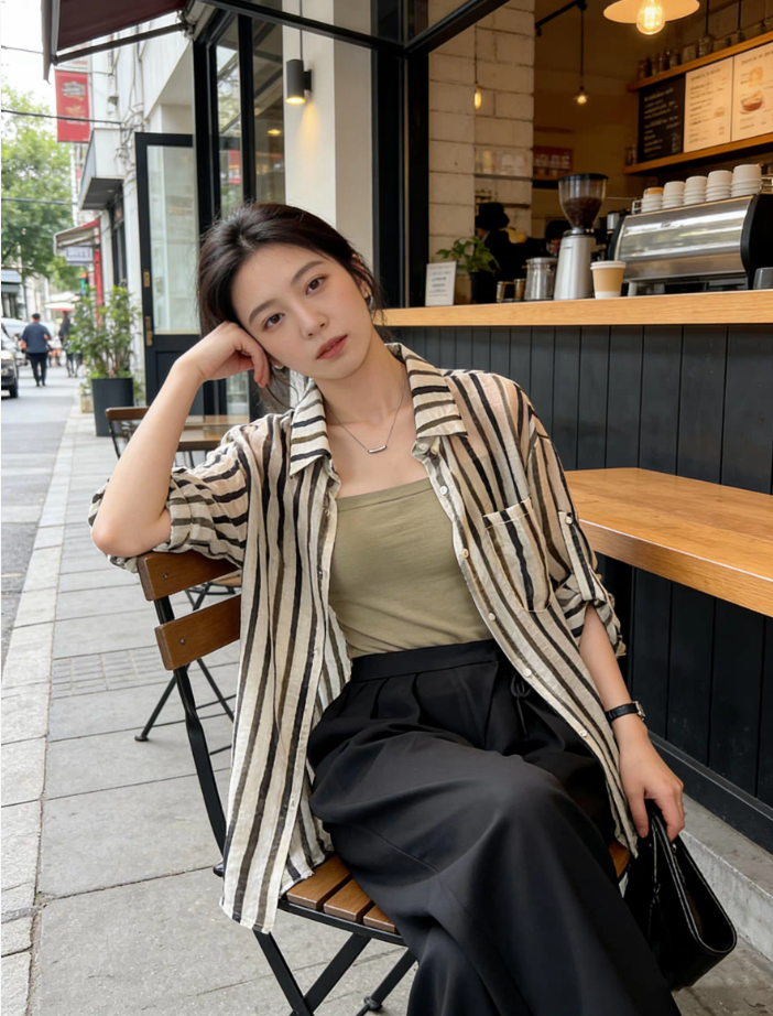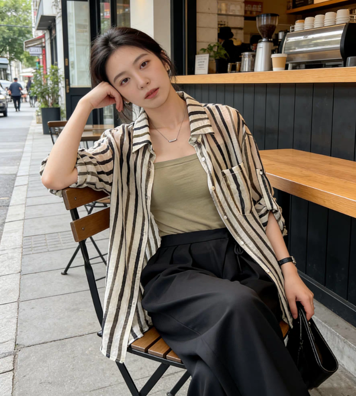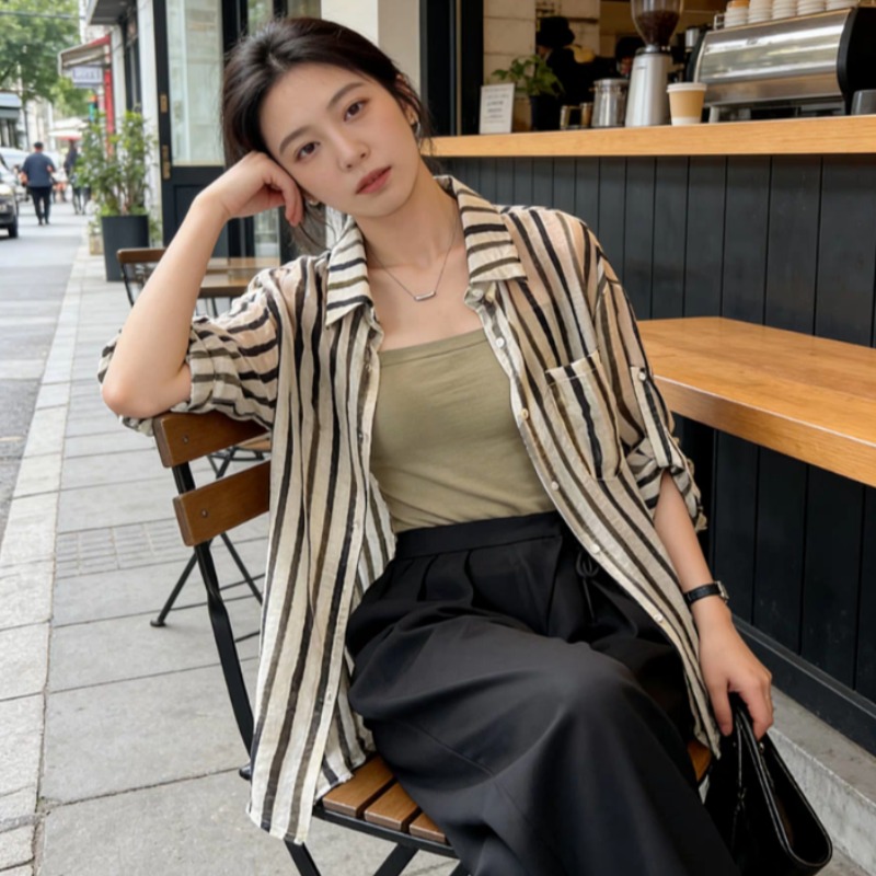 여름 드레스 새로운 빅 사이즈 스트라이프 셔츠 디자인 센스 작은 대중 맨위 남자 친구 바람 루즈핏 긴팔 셔츠 오픈 가디건