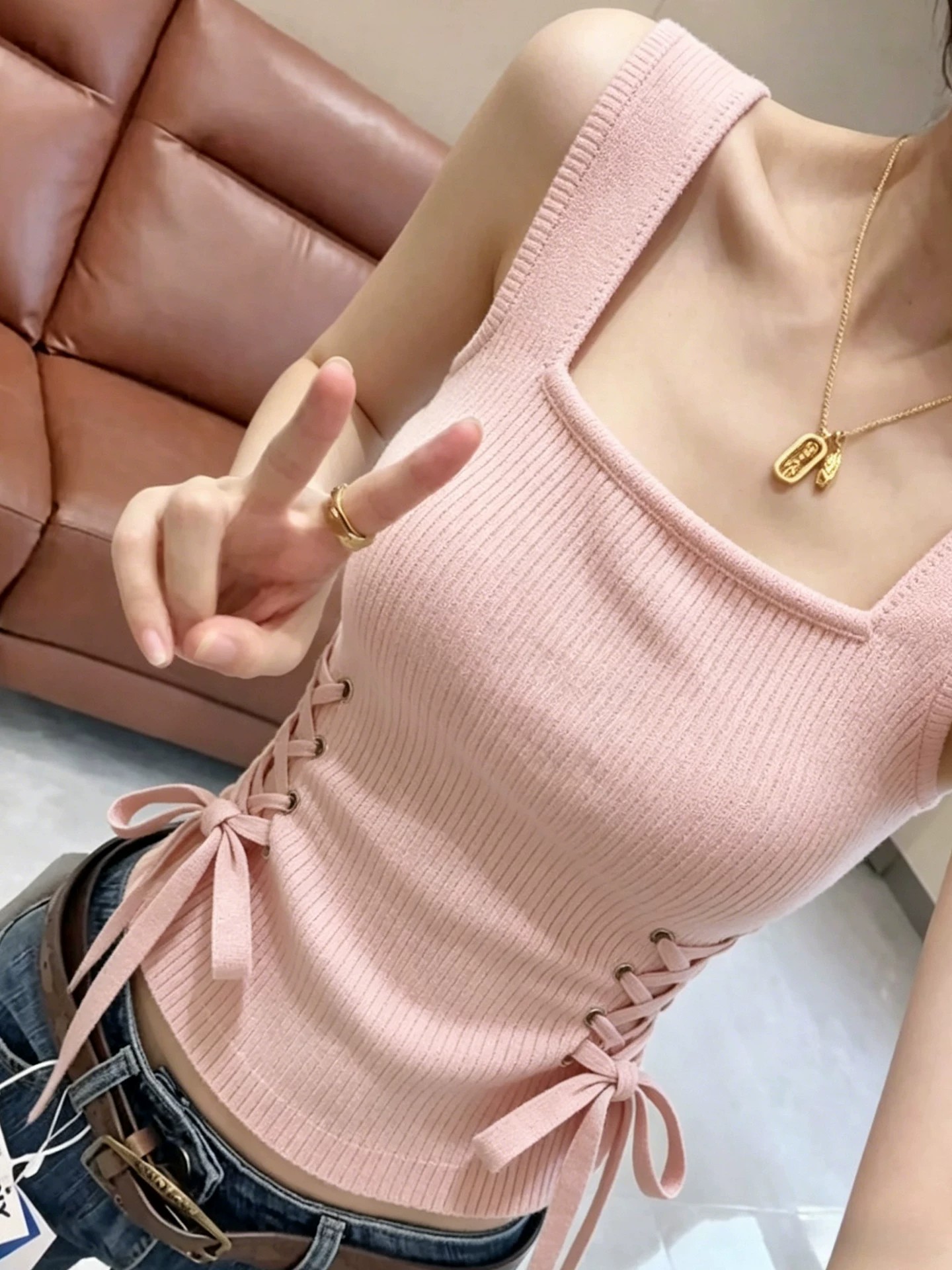 작은 대중 새로운 니트 슬립 펌프 로프 조끼 봄 몸매 가꾸기 디자인 여성 기본 셔츠 외국 가스 쇼트 스타일 민소매 맨위