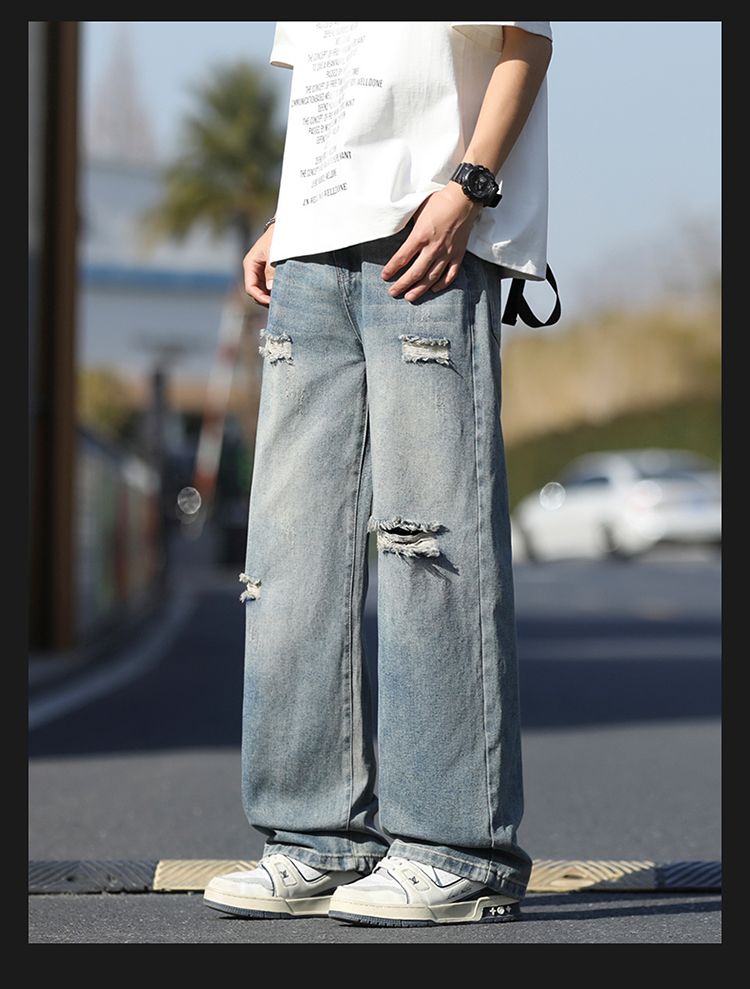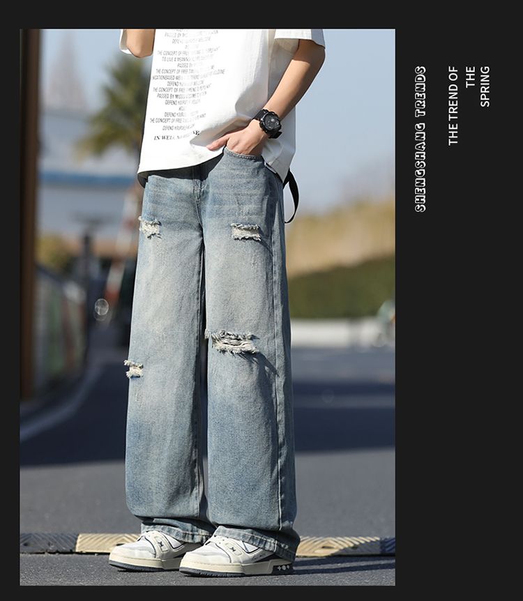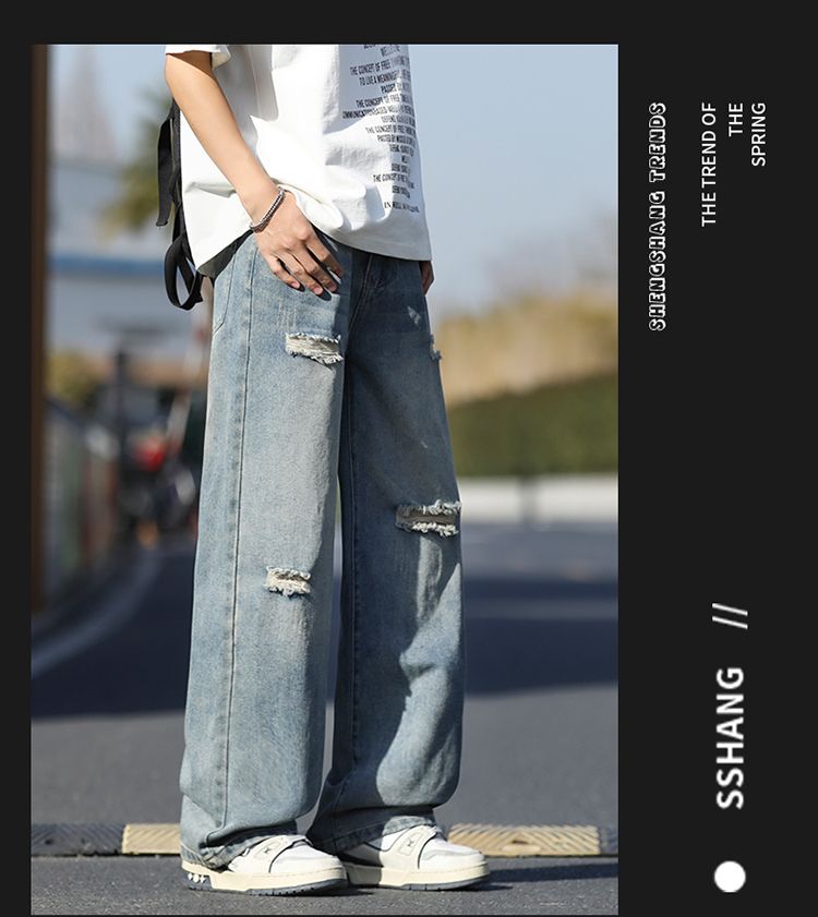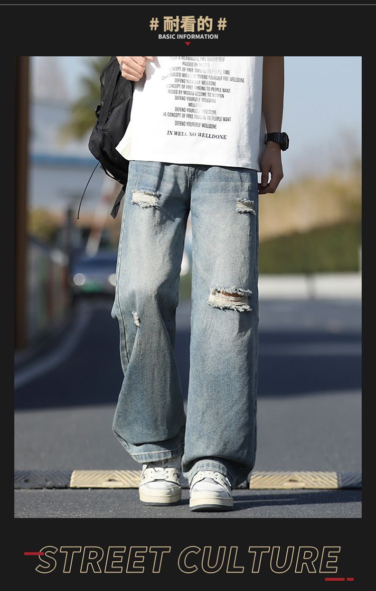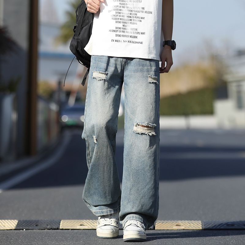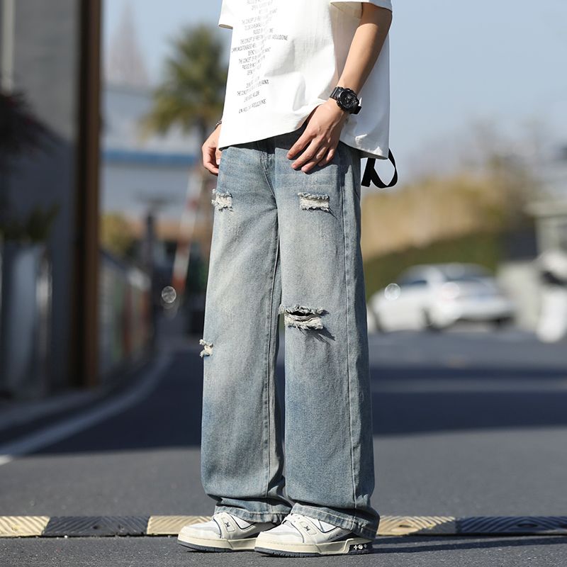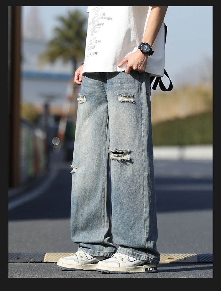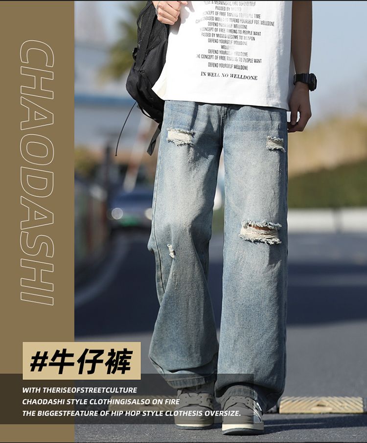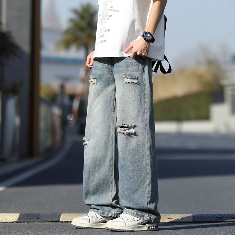 사계절 워시 물 바닥 청소 남성 청바지 레트로 항구 바람 루즈핏 스트레이트 트렌드 다용도 바지 파쇄 된 바지 긴 바지