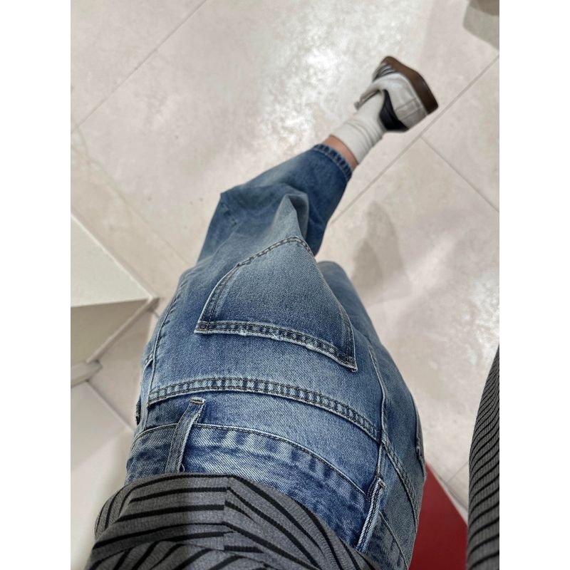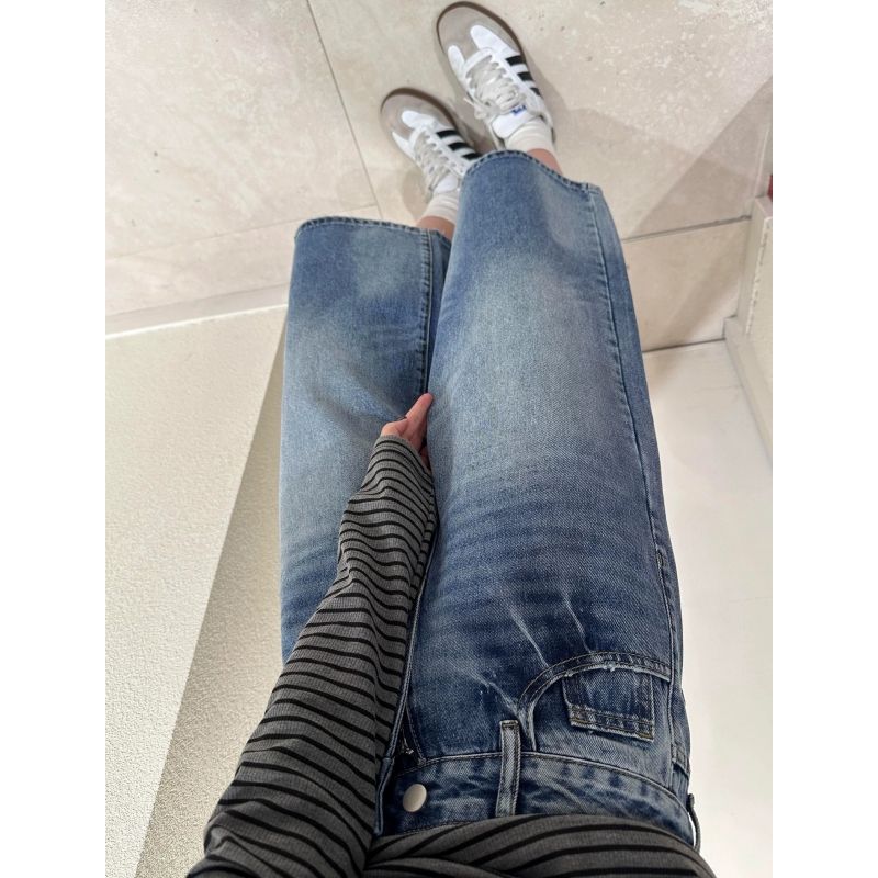 한 스타일 레트로 높음 거리 주머니 꽃무늬 디자인 센스 스트레이트 청바지 여성 여름 핫걸 루즈핏 다용도 바닥 청소 바지