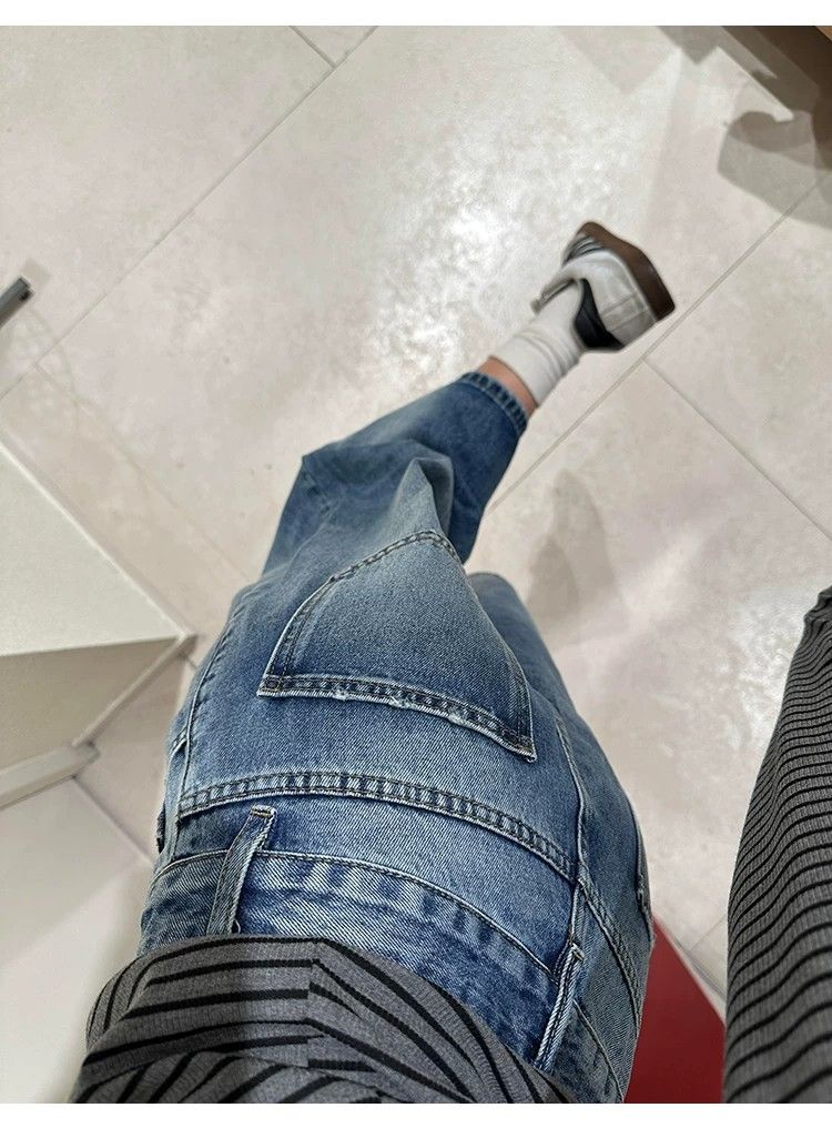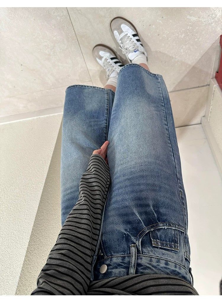 아메리칸 레트로 파리 버클 디자인 대나무 마디 청바지 남녀 워싱 스트레이트 루즈핏 다용도 긴 바지 ins